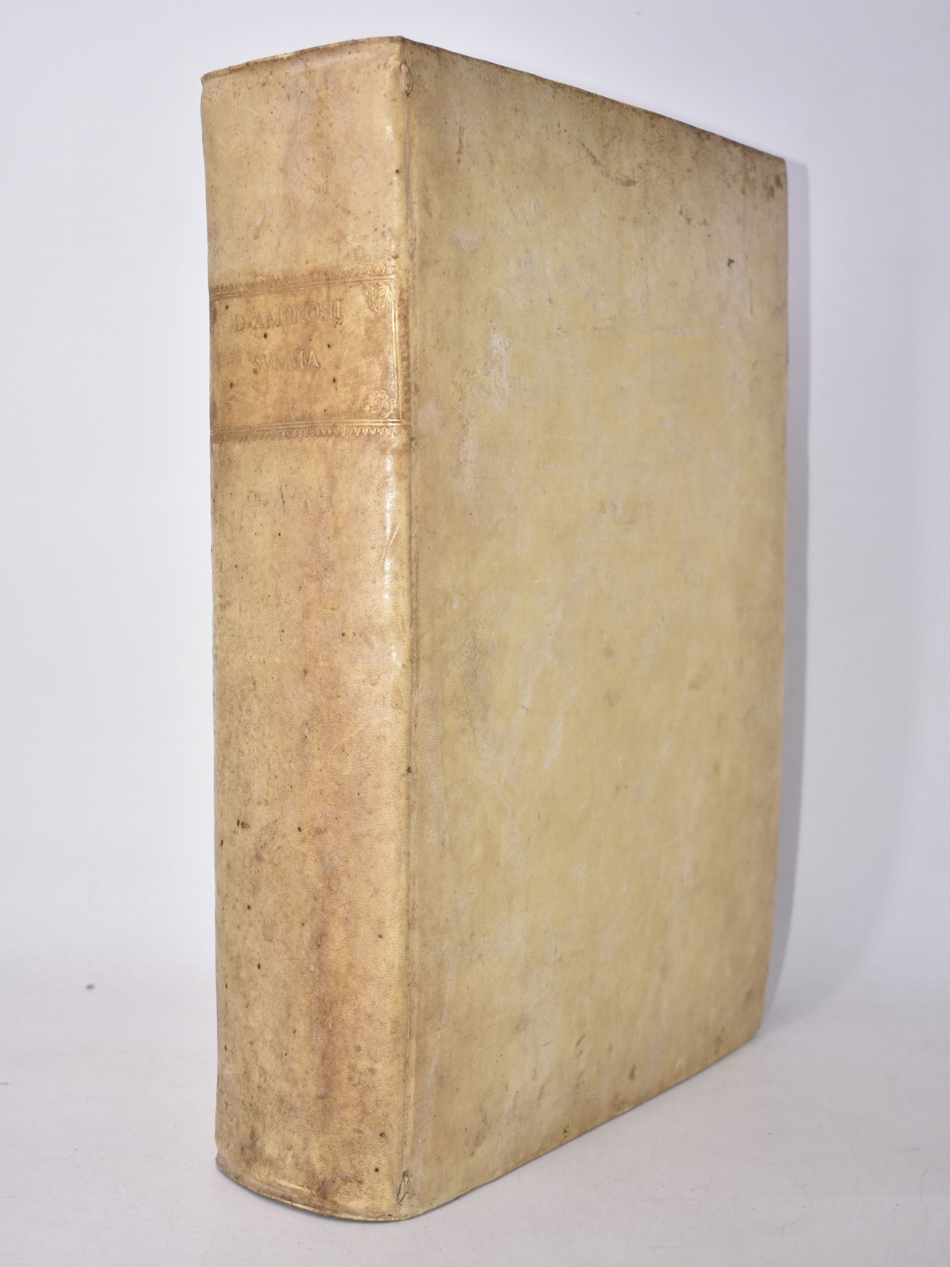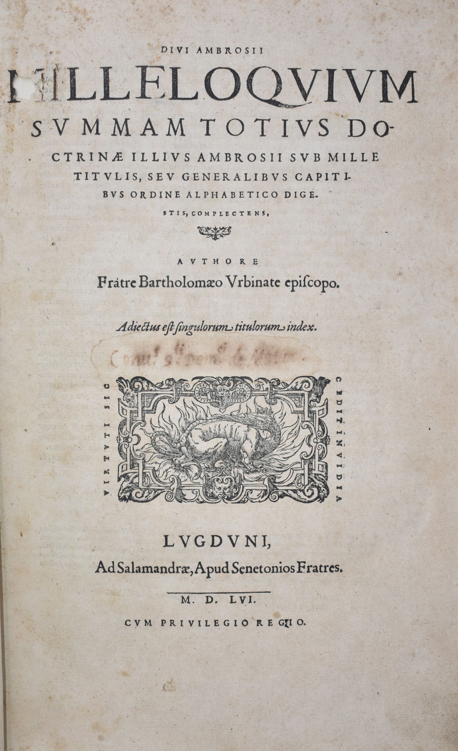 1 vol., in folio, cm 37,5x25,5; [4] c., 2444 col., [7] c. Legatura coeva in piena pergamena, titoli impressi in oro al dorso, tagli col. Grande cinquecentina con l'opera compilata dall'eremitano agostiniano Bartolomeo da Urbino (m. 1350), una raccolta di larghi estratti dalle opere teologiche di S. Ambrogio in tutto simile all'opera che l'autore aveva dedicato a S. Agostino l'anno precedente; unica edizione mai stampata, con una marca tip. al frontespizio (una salamandra tra le fiamme) e grandi iniziali incise nel testo.