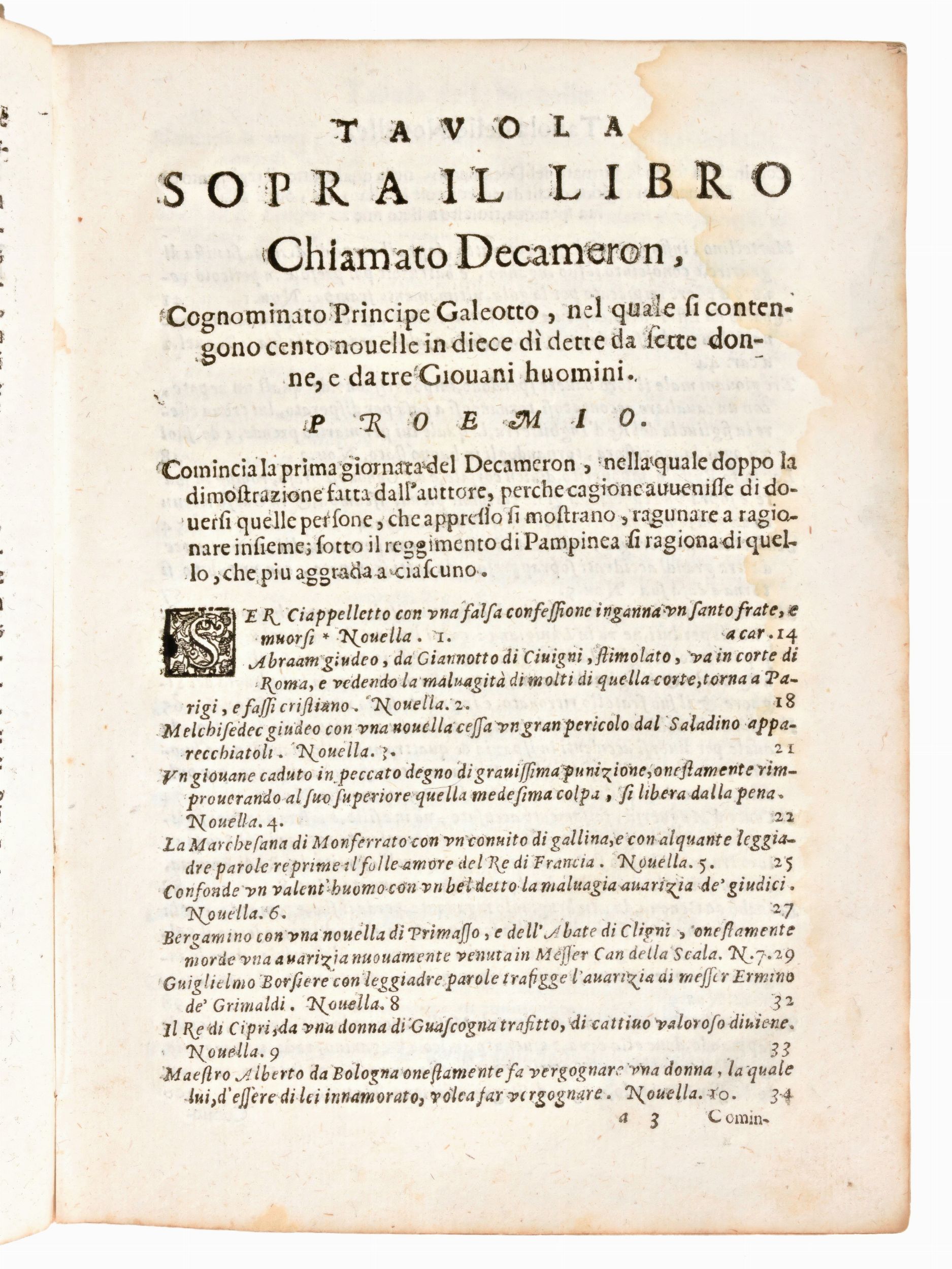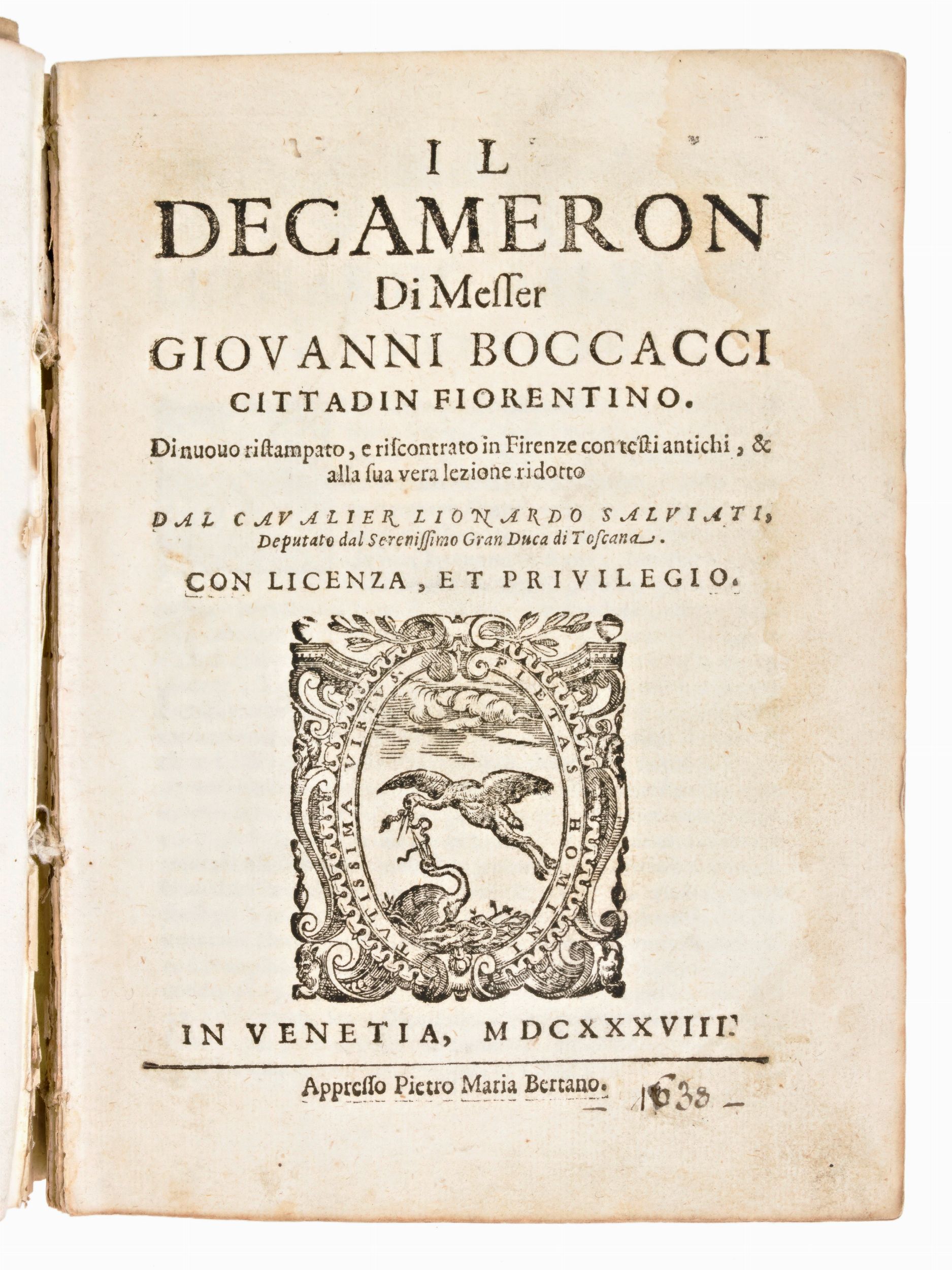 Formato in-8°, mm. 220x160, pp. (16), 472. Completo. Rilegatura coeva (allentata) in piena pergamena con titoli manoscritti al dorso (sbiadito). Esemplare con lieve gora alle ultime 40 carte circa e sporadiche fioriture. Il Decameron di Messer Giovanni Boccacci..., Di nuouo ristampato, e riscontrato in Firenze con testi antichi, & alla sua vera lezione ridotta dal Cavalier Lionardo Salviati... Venezia, 1638. Marca tipografica in xilografia al frontespizio, figura in xilografia nel testo alla c. A1. Testatine e capilettere xilografici. Celebre opera di Giovanni Boccaccio (1313-1375), nuova edizione (la prima del 1582) a cura del noto filologo e umanista Lionardo Salviati (1539-1589).
