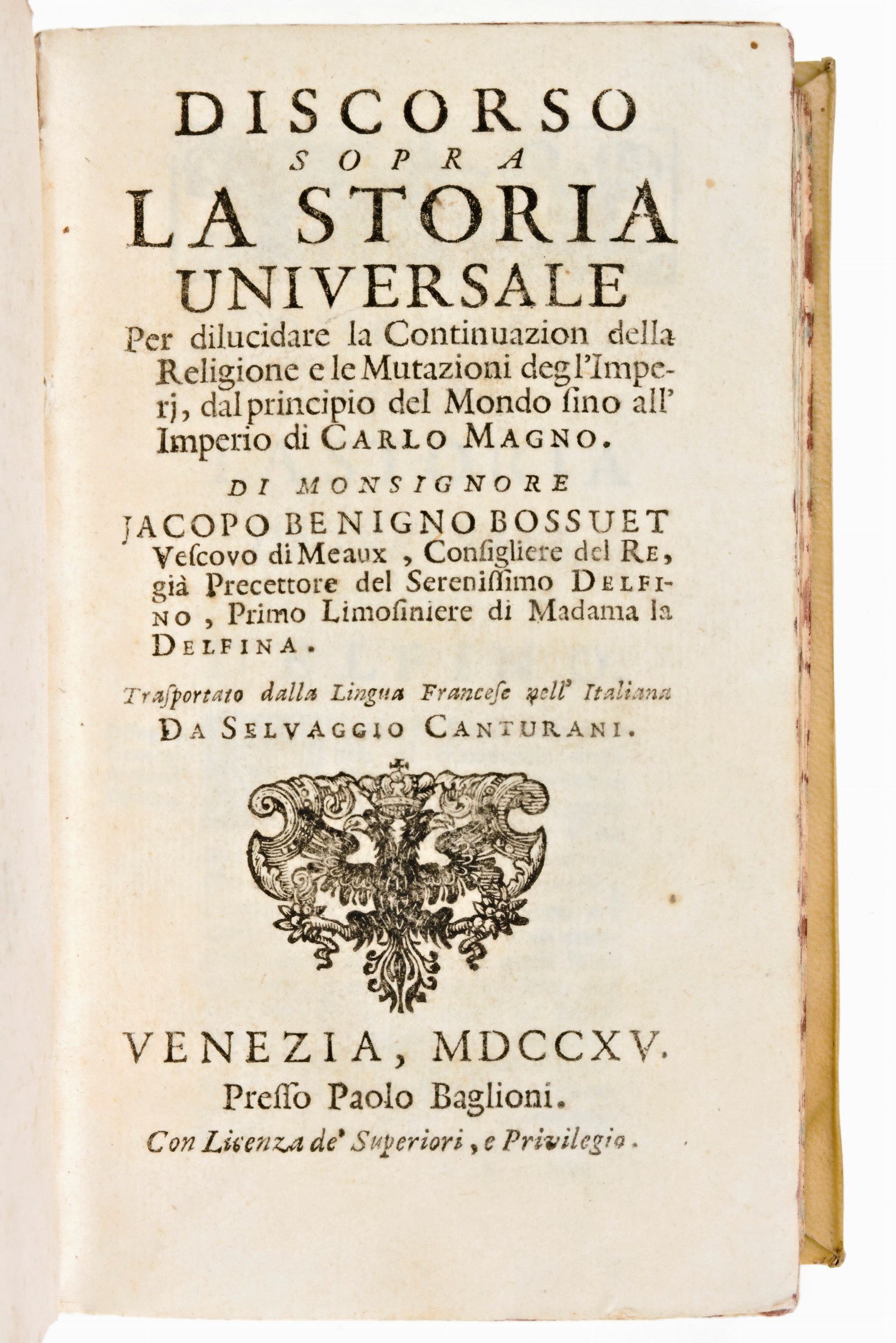 Formato in-12°, mm.160x95, pp. 461, (3), 218, (2). Completo. Rilegatura coeva in piena pergamena con titoli in oro su tassello in pelle al dorso. Tagli delle carte a spruzzo. Carte pulite, testo nitido. Leggera macchia al risguardo posteriore. Antica edizione impressa in Venezia il 1715 presso Paolo Baglioni. Storia universale, dal principio del mondo fino a Carlo Magno, opera dello scrittore francese Jacques-Benigne Bossuet (1627-1704), traduzione in italiano di Selvaggio Canturani (pseudonimo di Arcangelo Agostini). Testo italiano. Testatine, capilettere e finalini n.t. Marca tipografica (Aquila bicipite con corona).