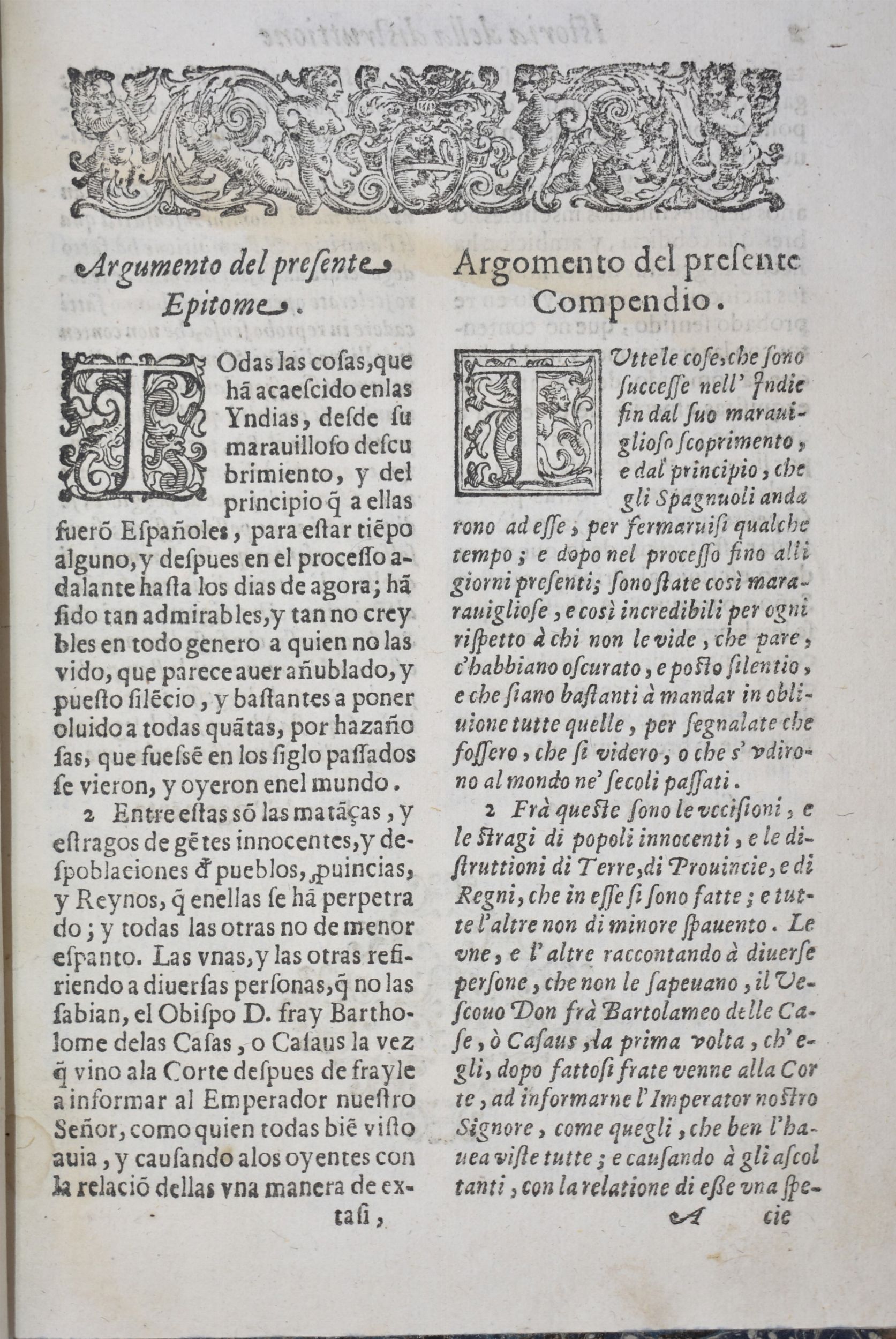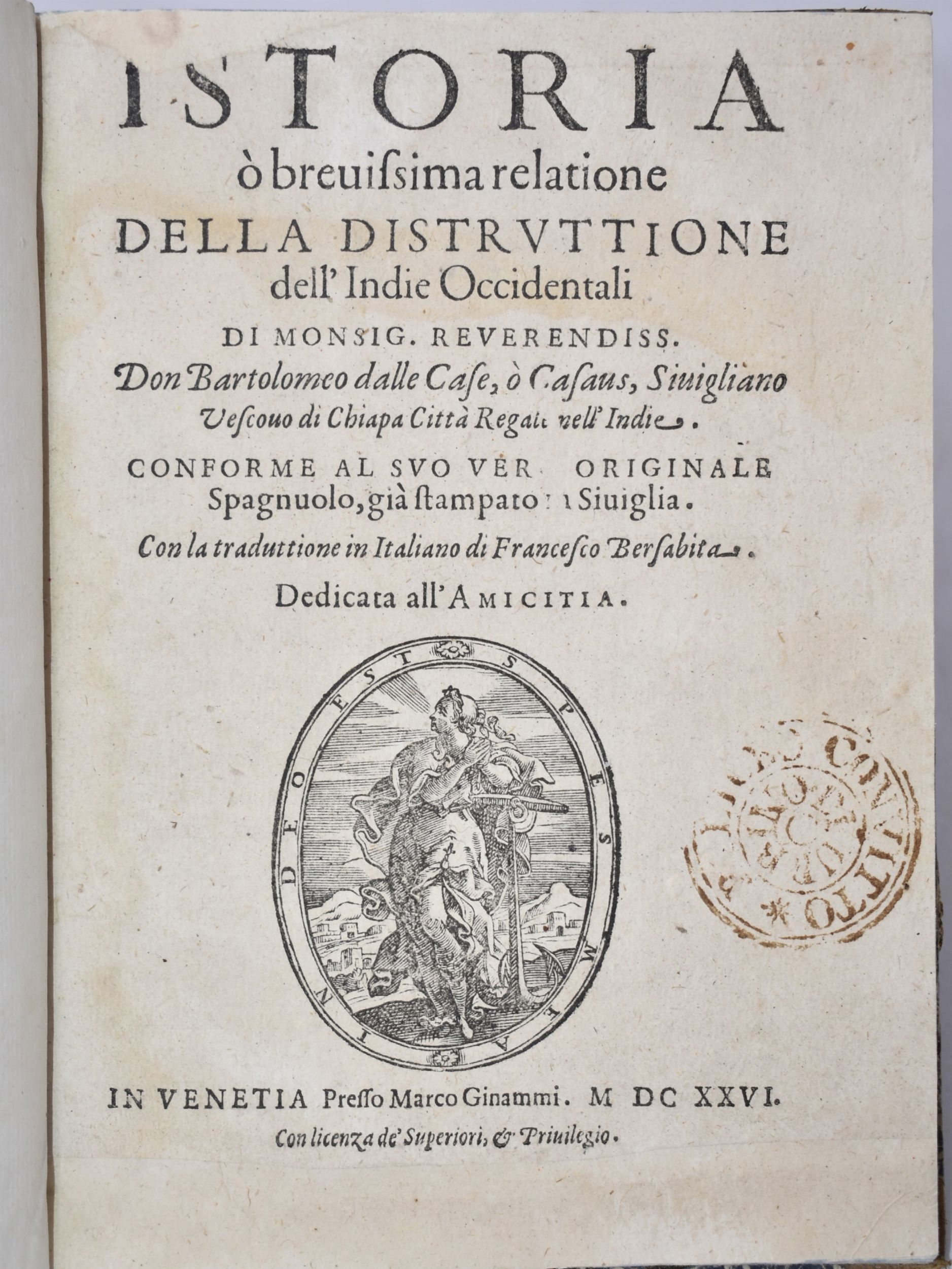 Seicentina veneziana con la prima versione italiana del severo commento espresso nei confronti delle conseguenze della colonizzazione sulle popolazioni locali da Bartolomé de Las Casas (1474-1566), il vescovo cattolico spagnolo impegnato nella difesa dei nativi americani; l'autore fu anche testimone delle vicende dell'ultimo viaggio (1502) alle Indie Occidentali di Cristoforo Colombo, di cui trascrisse il Giornale di bordo della navigazione dalla Spagna in America Centrale. Con una marca tip. al frontesizio, testo su 2 colonne impresso in spagnolo e italiano, raffinati fregi xil. n.t. Esemplare con restauro ai margini del front., un lieve alone diffuso.