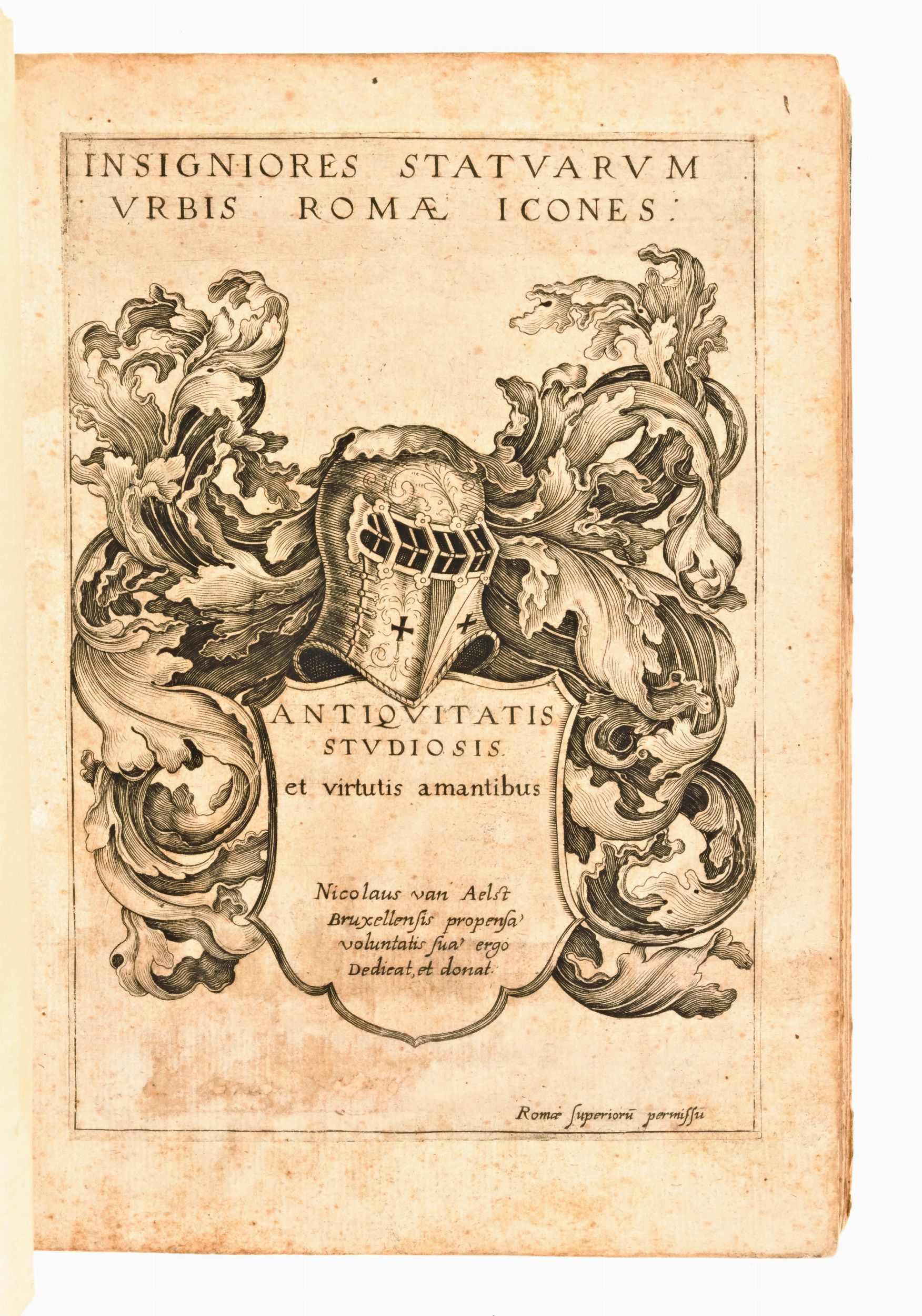 In-folio, mm. 250x185, 148 tavole calcografiche. 1 frontespizio calcografico. Cartonato flessibile post. (xx sec.) in mezza tela. Splendida copia, in ottimo stato di conservazione generale con lievi segni del tempo. Restauri al verso del frontespizio e alla Tav. 1. Carte con margini rifilati, a toccare il margine superiore della tav. 68. Raccolta di 148 tavole calcografiche a piena pagina raffiguranti le statue antiche romane. Importante apparato iconografico sulla scultura dei antichi romani ad opera dell'incisore italiano Giovanni Battista Cavalieri (1525-1601), noto per le sue incisioni e documentazioni sulle antichità romane. In Roma il 1595 (data sulla tav. 1 ), editore non specificato.