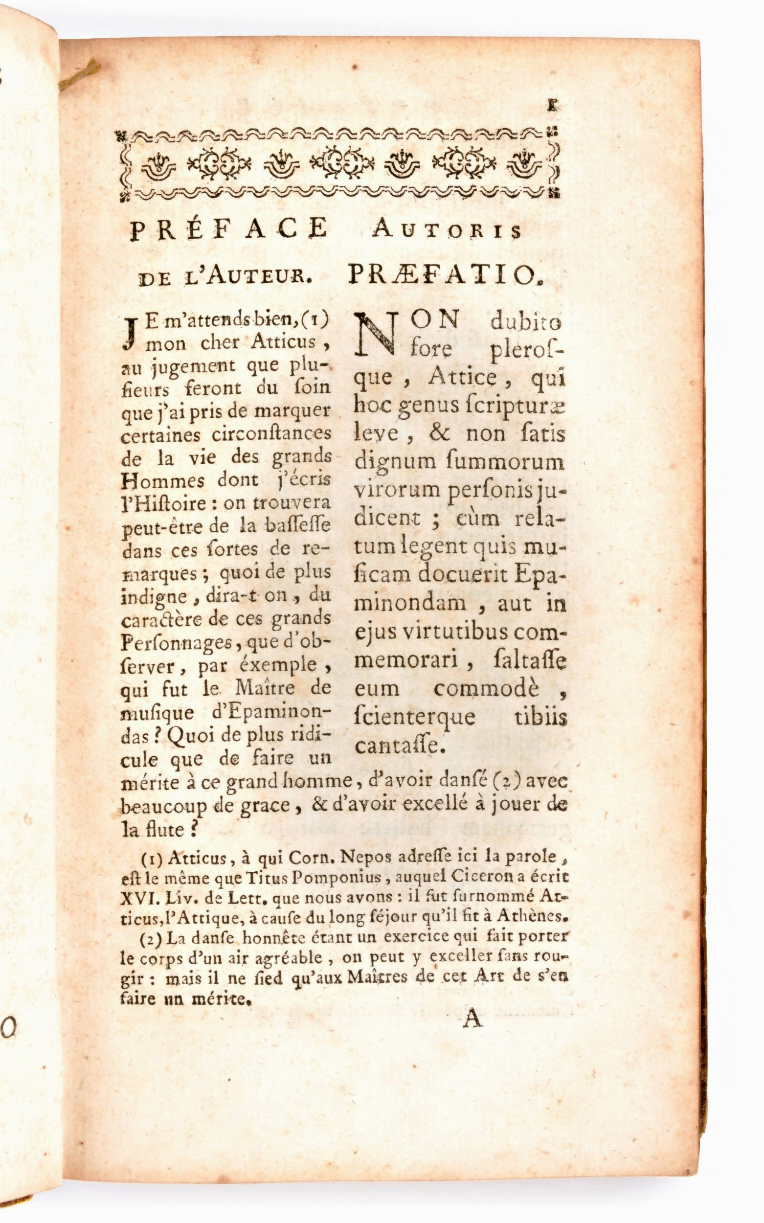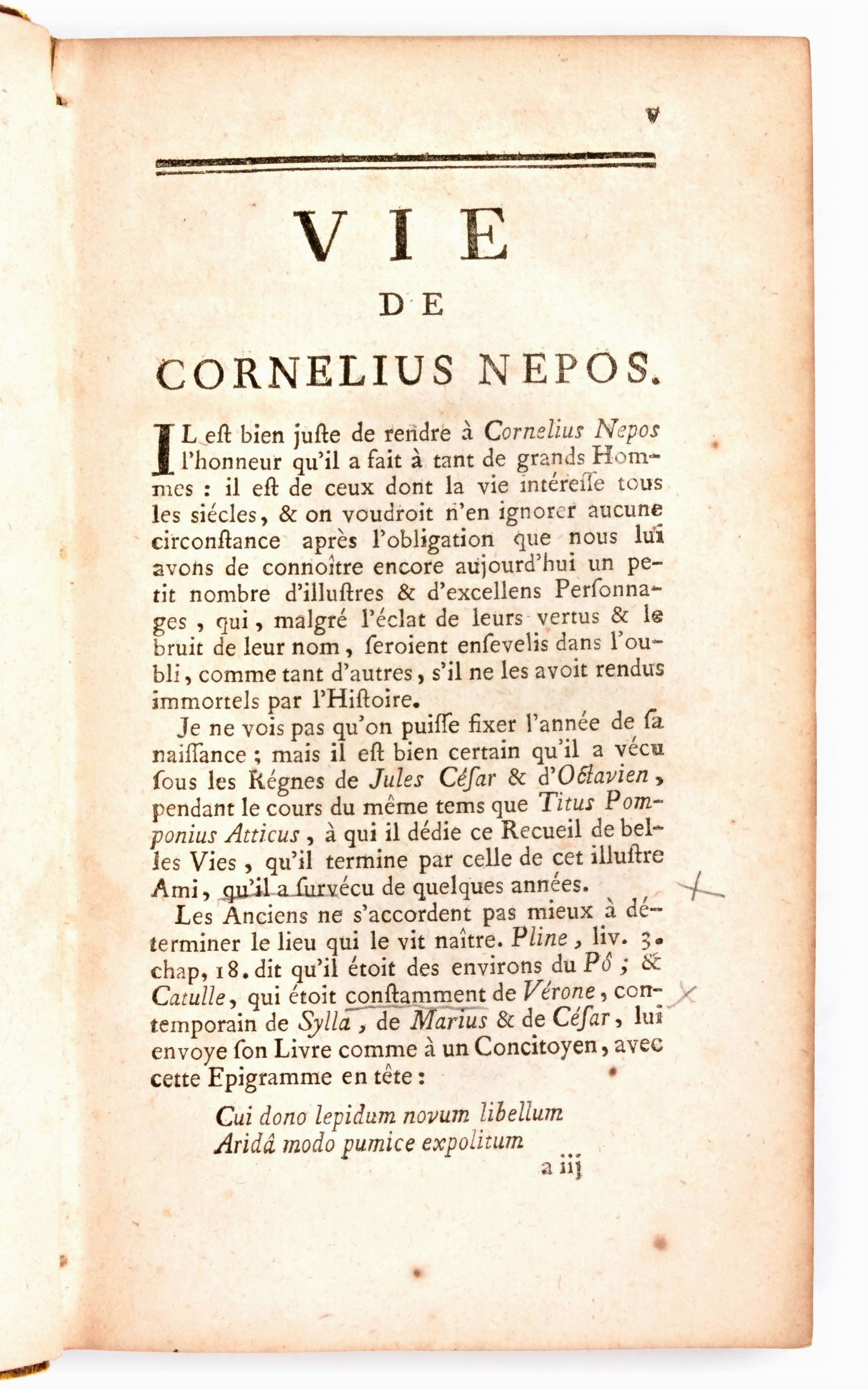 Formato in-12°, mm. 170x100, (2), xiv, 664, (10). Elegante rilegatura in piena pelle con 5 nervature, titoli e fregi in oro al dorso. Tagli in rosso. Risguardi in carta antica marmorizzata. Minimi difetti e spellature al dorso. Testo nitido, sporadiche fioriture e e leggere bruniture. Note in china al verso del frontespizio. Antica edizione impressa in Parigi il 1759, opere dello storico e biografo romano antico Cornelio Nepote (100 a.C. - 27 a.C.). Testo latino, con traduzione in francese a fronte, note geografiche, storiche e critiche. Contiene le vite di : Milziade, Temistocle, Aristide, Pausania, Cimone, Lisandro, Alcibiade, Trasibulo, Conone, Dione, Ificrate, Cabria, Timoteo, Datame, Epaminonda, Pelopida, Agesilao, Eumene di Cardia, Focione, Timoleonte, Amilcare Barca, Annibale, in fine gli storici romani Catone e Attico.