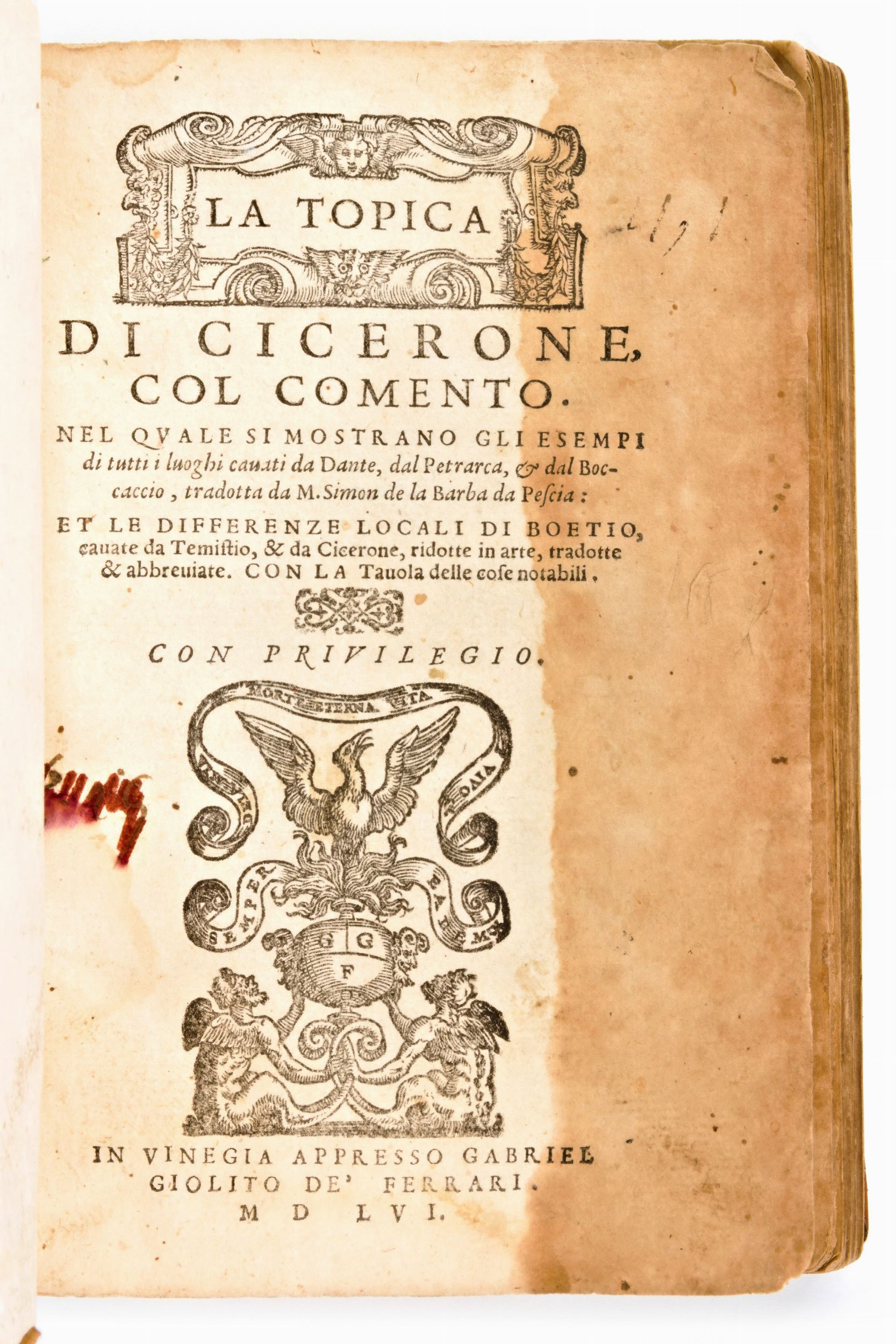 Formato in-8°, mm. 150x105, pp. (30), 245, (3). Mancante della carta *3 (la prima dell'indice). Rilegatura coeva in piena pergamena con titoli manoscritti al dorso (sbiaditi). Segno di alone a prendere parte del testo. Rare sottolineature in china antica. Cinquecentina impressa in Venezia il 1556 per Gabriele Giolito de Ferrari, con traduzione in italiano di Simone Della Barba (XVI sec.). Opera retorica di Cicerone composta nel luglio del 44 a.C. indirizzata all'amico giurista Gaio Trebazio Testa, che aveva chiesto a Cicerone di enunciare e semplificare il contenuto dei Topica di Aristotele, e tratta della topiké, ovvero l'arte di trovare gli argomenti durante la fase dell'inventio. I 'luoghi' (topoi o loci communes) cui il termine topica fa riferimento, sono, secondo Aristotele, le sedi da cui si traggono gli argomenti, cioè i luoghi comuni che possono essere adoperati nella preparazione di un'orazione, ma anche nella stesura di un'opera filosofica o poetica.