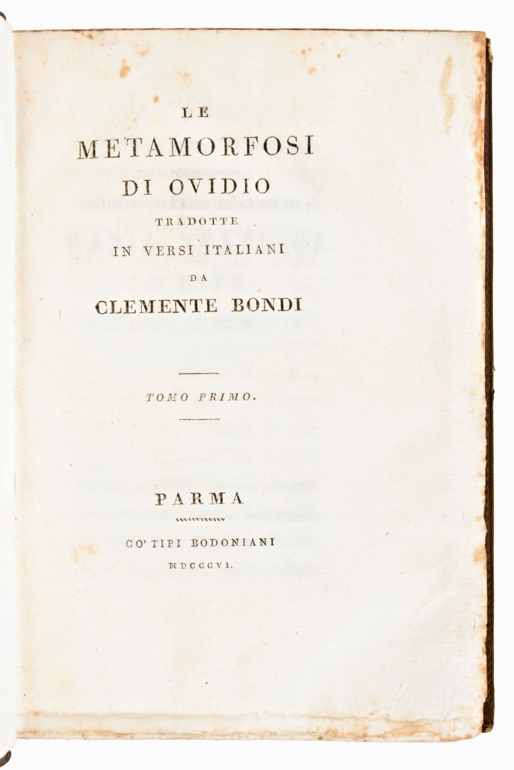 2 volumi In-4°, mm. 170x115, pp. XIV, (2), 399, (5) / (4), 341, (3). Rilegatura post. (XX sec.) in piena pelle con 5 nervature e titoli in oro al dorso. Celebre opera del poeta romano antico Publio Ovidio Nasone (43 a.C. - 17-18 a.C.). Tradotta interamente in italiano dal poeta e traduttore Clemente Bondi (1742-1821). Bondi fu apprezzato soprattutto per le sue traduzioni di testi classici: l'Eneide, le Georgiche e le Bucoliche di Virgilio, Le metamorfosi di Ovidio. La sua opera fu apprezzata anche per le ricche note didascaliche che accompagnavano le sue traduzioni, tanto da farlo soprannominare il Delille d'Italia. Religioso gesuita, fu con Giambattista Bodoni uno degli uomini di lettere che collaborarono alla stamperia ducale di Parma.