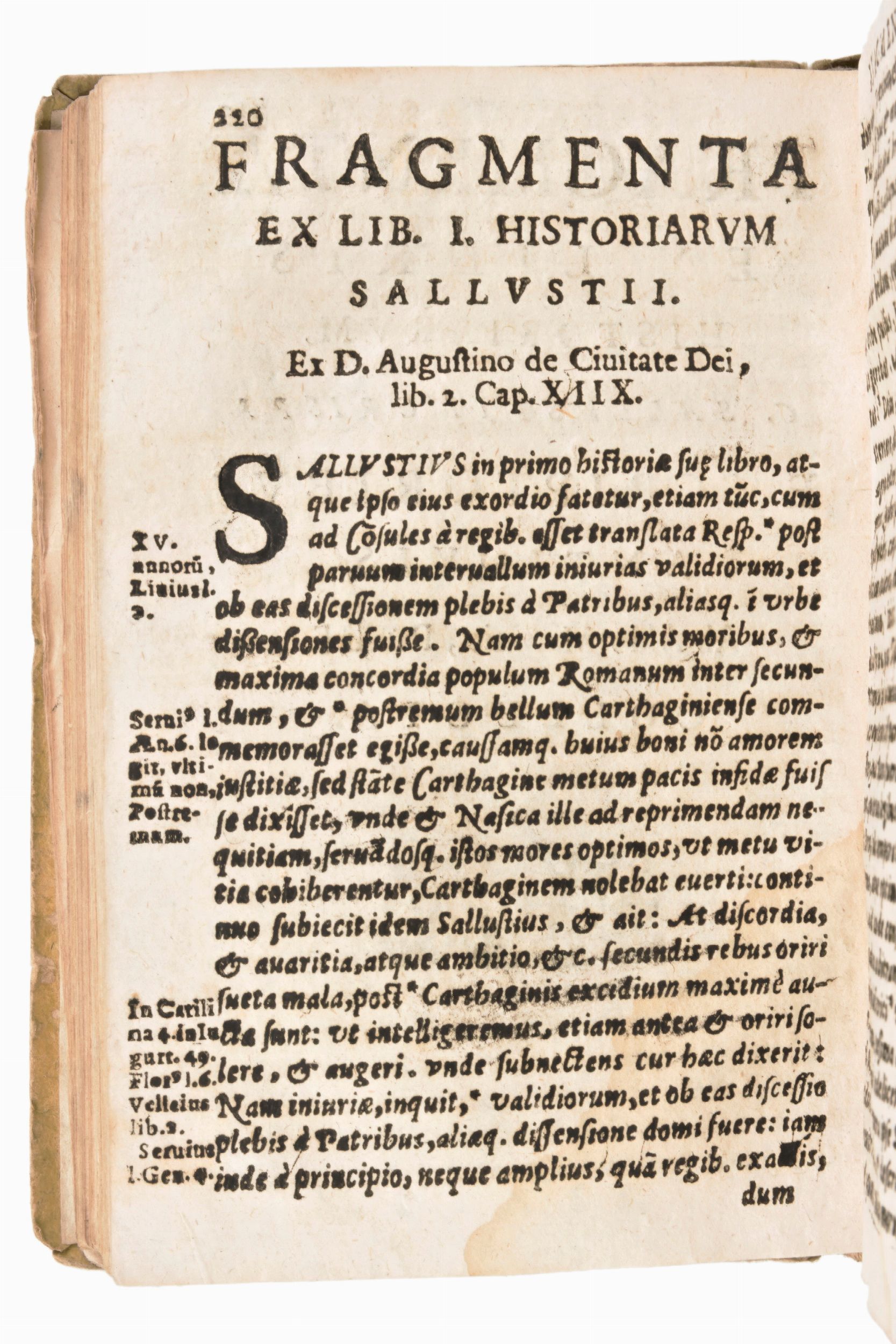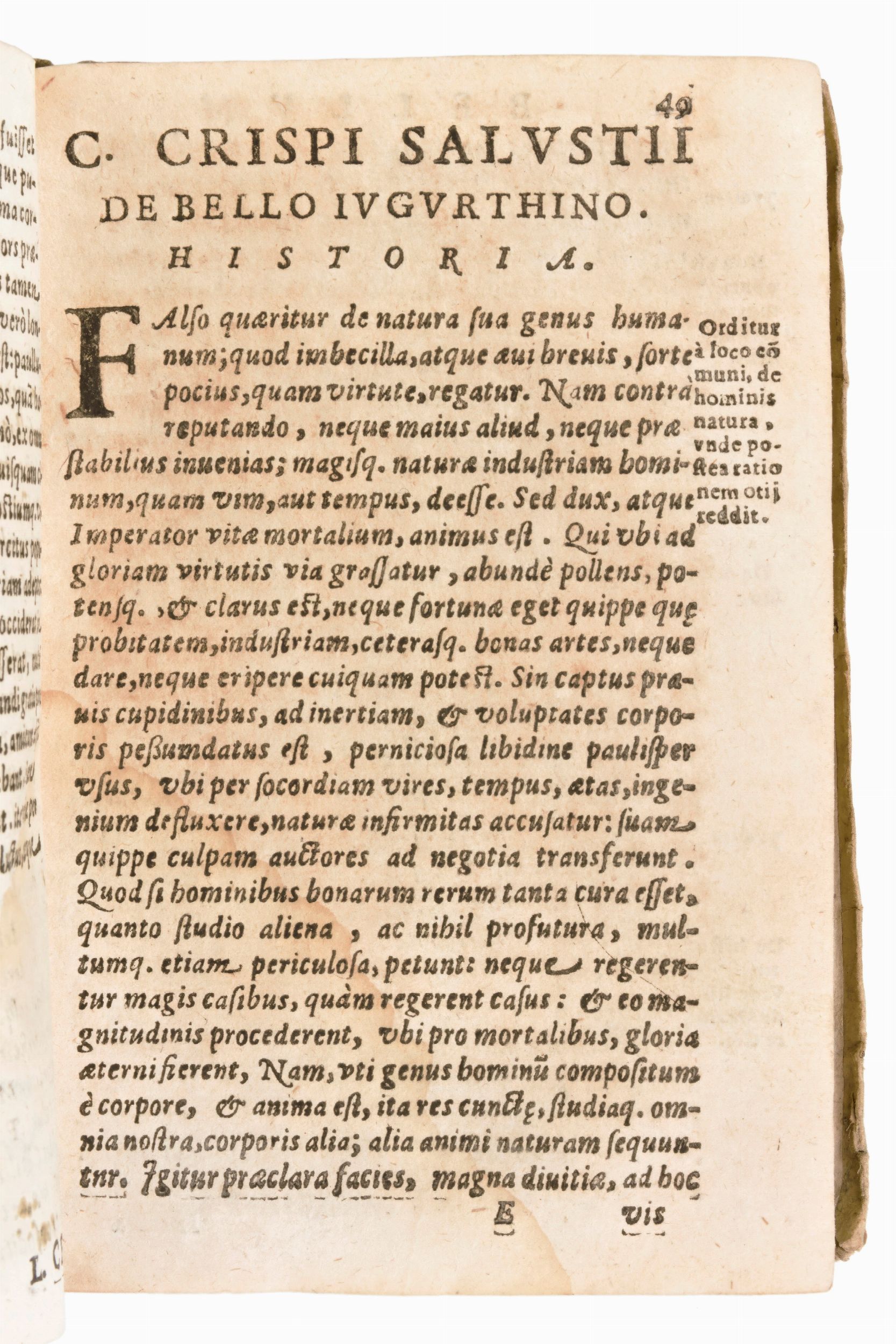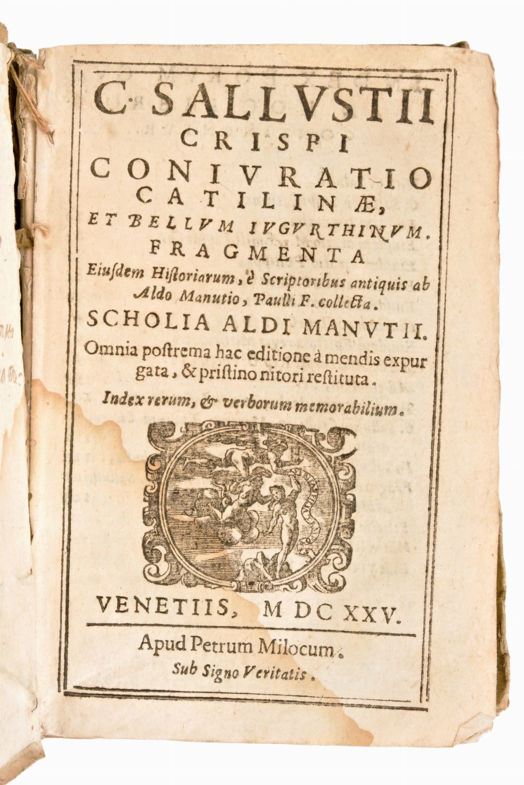 Formato in-8°, mm. 145x110, pp. (16), Cartonato coevo con titoli manoscritti al dorso. Antiche note e disegni ai piatti. Frontespizio entro cornice con marca tipografica in xilografia. Note manoscritte in china antica ai risguardi, carta di guarda anteriore mancante. Lieve gora al lato inferiore delle carte. Cerniera anteriore parz. distaccata. Testo latino, corsivo romano. Seicentina impressa in Venezia il 1625 per Petrum Milicum, raccolta delle opere dello storiografo romano antico Gaius Sallustius Crispus, commentate dall'umanista Aldo Manuzio il Giovane (1547-1597). Contiene : De Catilinae coniuratione, Bellum Iugurthinum fragmenta e Frammenti del Historiarum. In fine l'indice delle cose memorabili.
