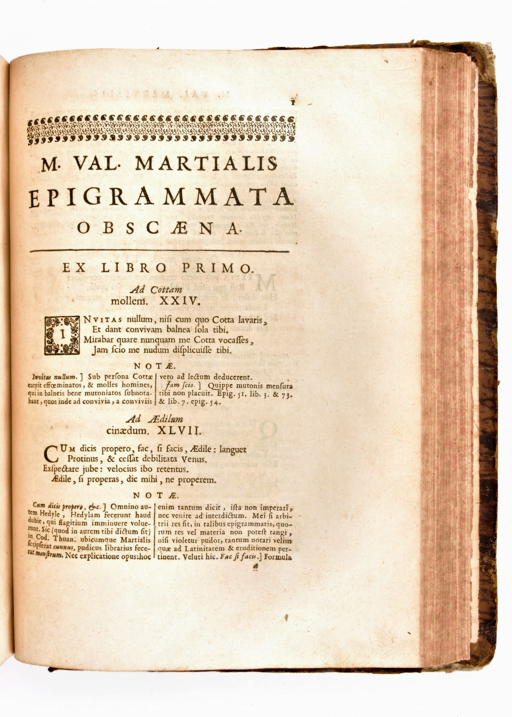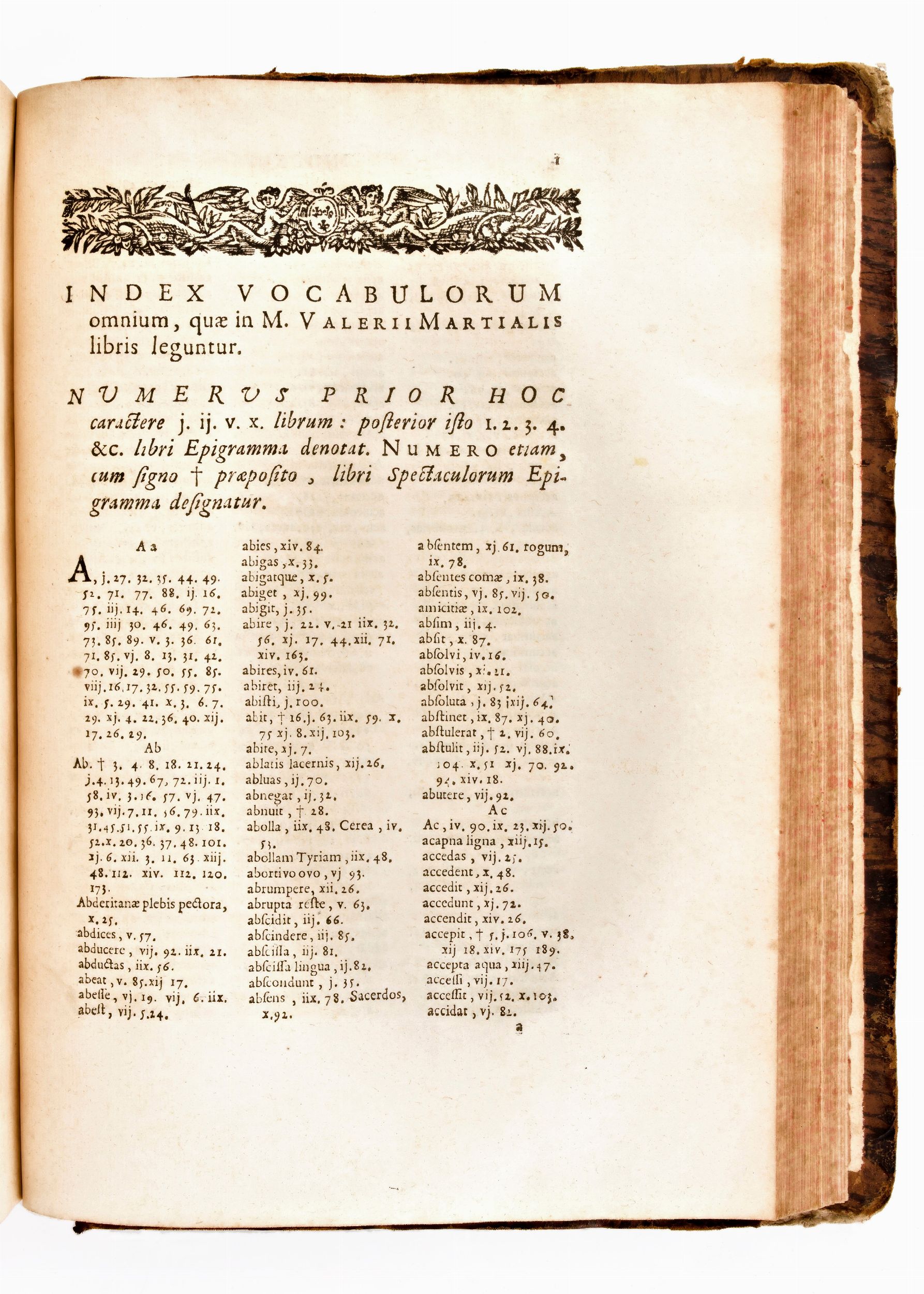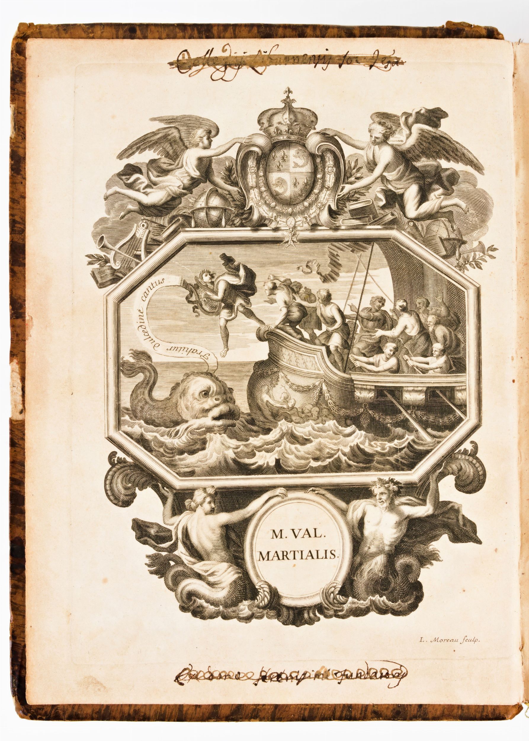 Formato in-4°, (28), 793, (3), 59, 168. Completo. Elegante rilegatura coeva in piena pelle con 5 nervature, titoli e fregi in oro al dorso. Tagli delle carte a spruzzo. Piccoli difetti e mancanze al dorso, con lievi spellature. Buono esemplare con testo nitido, sporadiche fioriture e leggere bruniture. Antiporta calcografica incisa da L. Moreau, sul frontespizio marca xilografica con motto: Felix si culta Minerva. Capilettera e finalini xilografici. Edizione ad usum delphini impressa il 1680 per Antoine Callier, con gli epigrammi in 15 libri del poeta romano antico Marco Valerio Marziale (c. 41 d.C. - 104 d.C.), comunemente ritenuto il più importante epigrammista in lingua latina. .