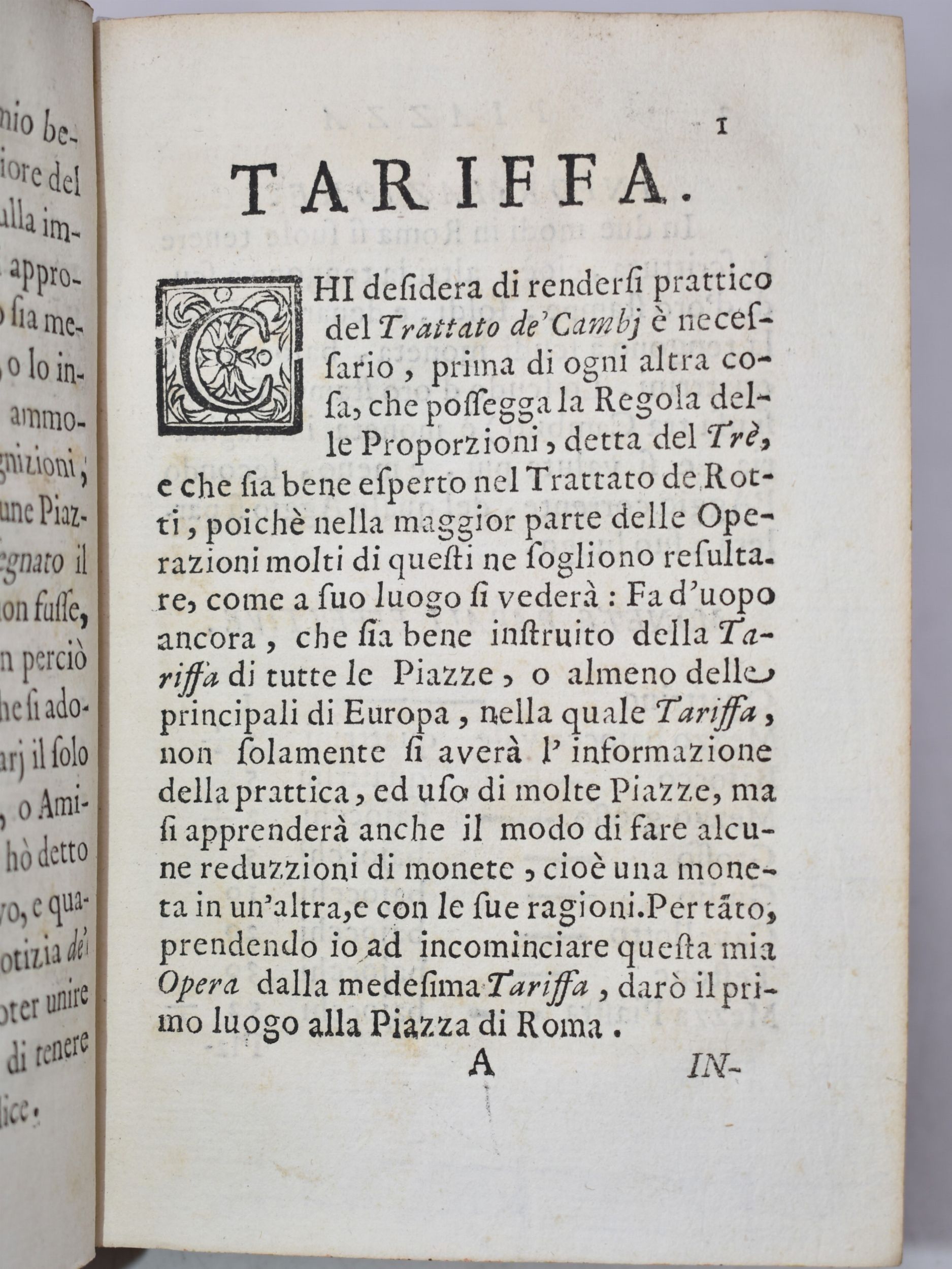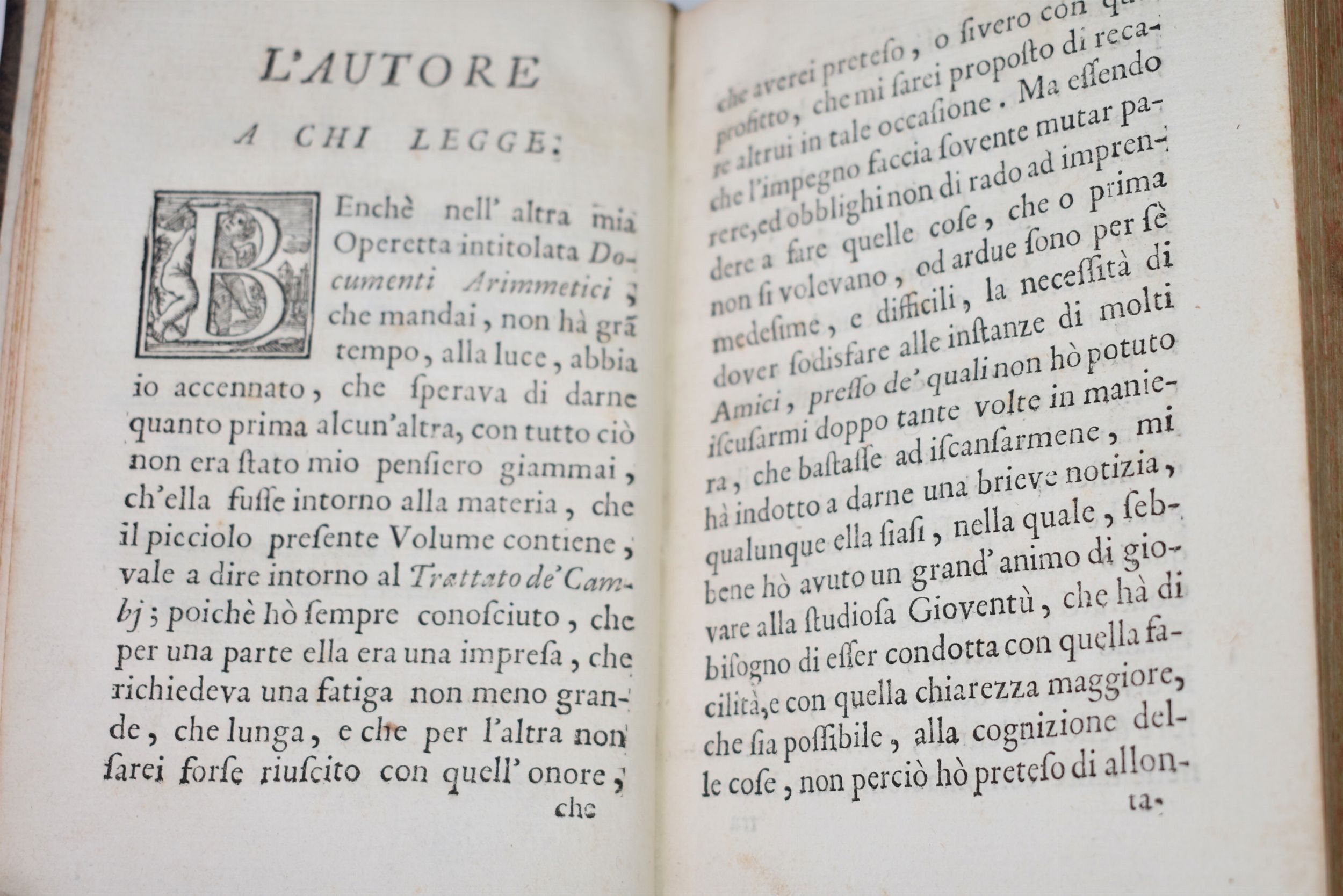 1 vol., in 16°, cm 16x10, p. ( 16), 318, (10). Legatura coeva in piena pelle, doppia cornice dorata con ricchi fregi impressi in oro agli piatti, fregi in oro anche al dorso. Rara edizione originale di questo interessante trattato sulle valute monetarie in circolazione nelle prime decadi del XVIII secolo. Bell'esemplare, legatura coeva in piena pelle con elaborate cornici in oro impresse ai piatti.