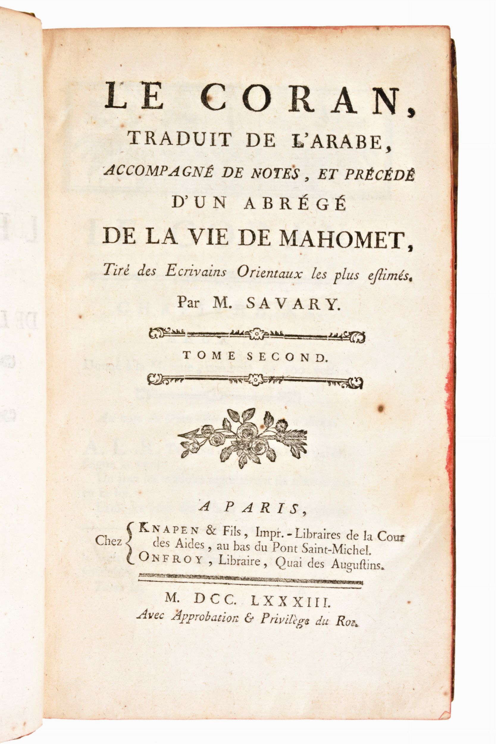 Formato in-8°, mm. 205x130, pp. xvi, (4),248, 270 + (4), 464, (8). Elegante rilegatura coeva in piena pelle con titoli e fregi in oro al dorso. Tagli delle carte in rosso. Risguardi in carta pregiata marmorizzata. Ottimo esemplare con lievi fioriture e leggere bruniture alle carte. Piccole mancanze e spellature ai dorsi e un difetto alla cerniera anteriore del vol. 2. Capilettere e finalini nel testo. Antica edizione impressa in Parigi il 1783, primi 2 volumi (di 6) della traduzione del Corano dall'arabo al francese dell'orientalista e traduttore Claude-Étienne Savary (1750-1788), accompagnato da note e preceduto da un compendio della vita di Maometto.