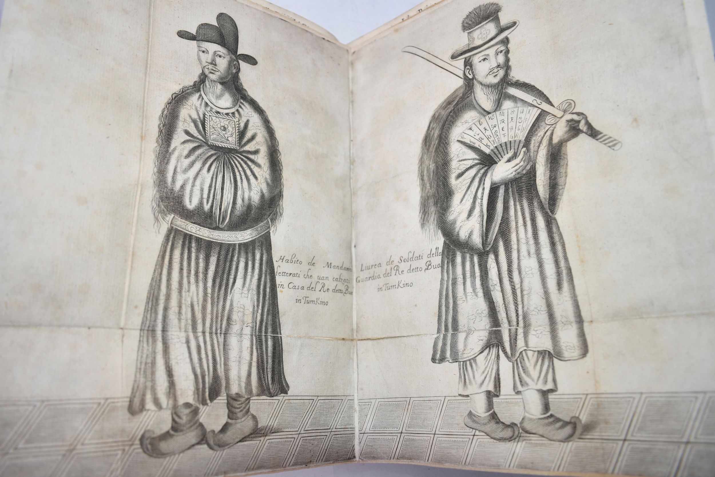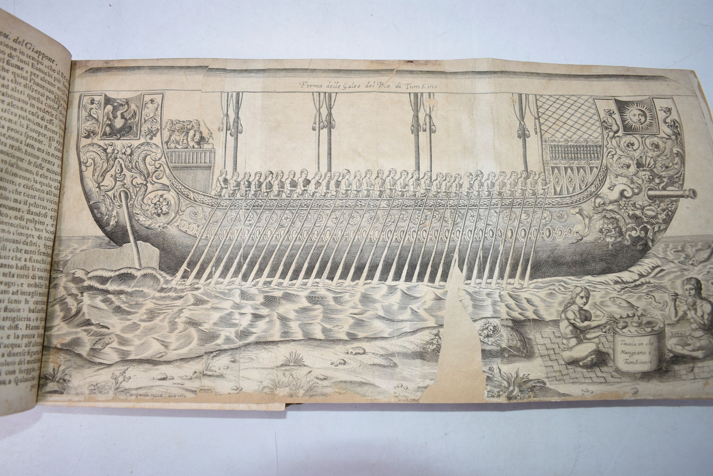 Prima edizione, molto rara, dell'opera del gesuita ligure G. F. De Marini (1608-1682) sulla storia, gli usi e i costumi della “Provincia Iaponiae', termine col quale nel XVII secolo si abbracciavano altri paesi oltre al Giappone degli shogun; con le testimonianze sull'avanzamento dell'evangelizzazione in Asia orientale e le relazioni dei missionari gesuiti inviati in Tonchino e Cocincina (attuale Vietnam) nel momento di maggiore intensità dei rapporti commerciali di questa parte della penisola indocinese con il Giappone. Si conservano 2 tavole ripieg.: Forma delle Galee del Re di Tumkino e la tavola doppia Habito de Mandarini/Livrea de Soldati; risultano invece mancanti l'antiporta e la tavola con un fac-simile, oltre alle ultime 2 carte di indici con il registro.