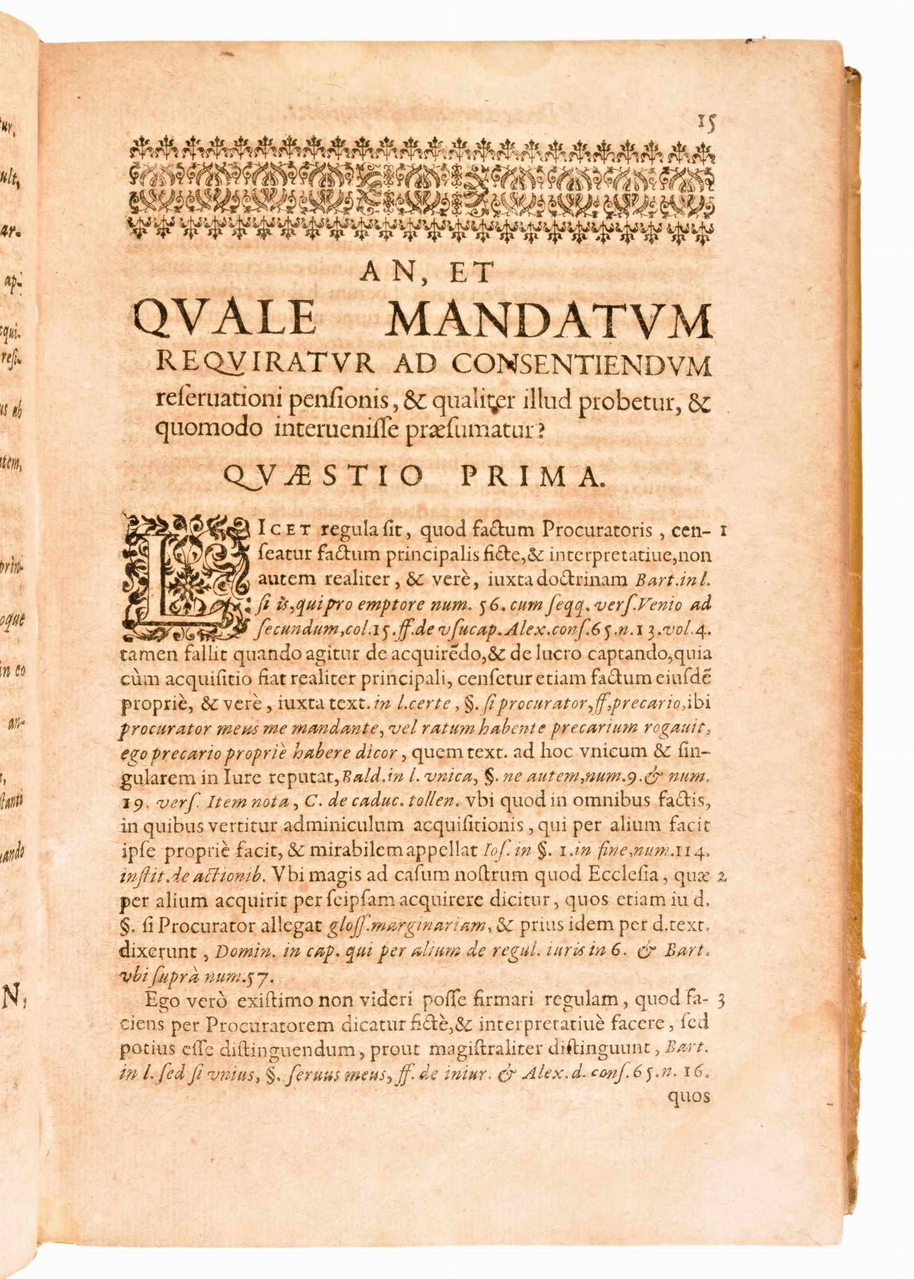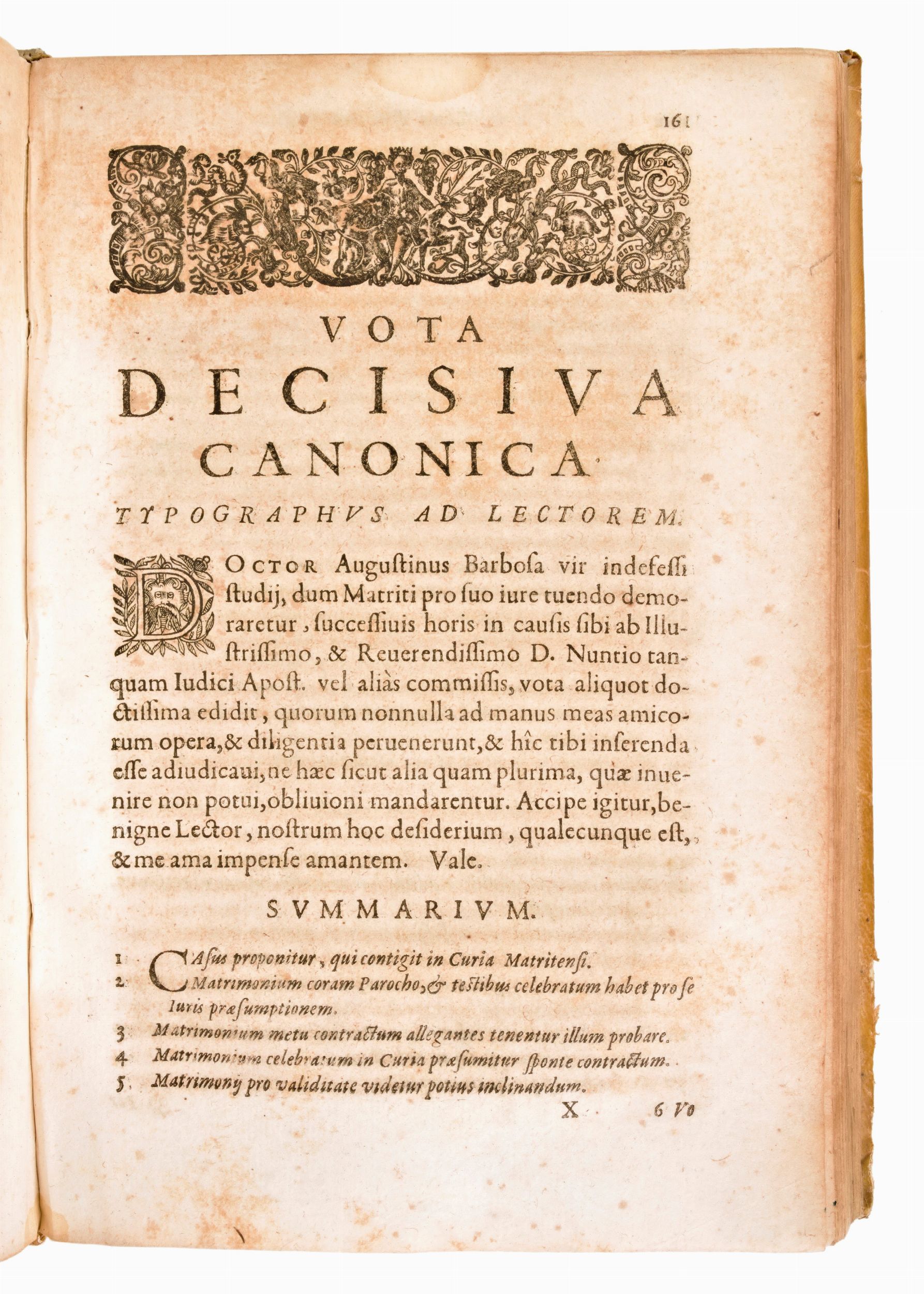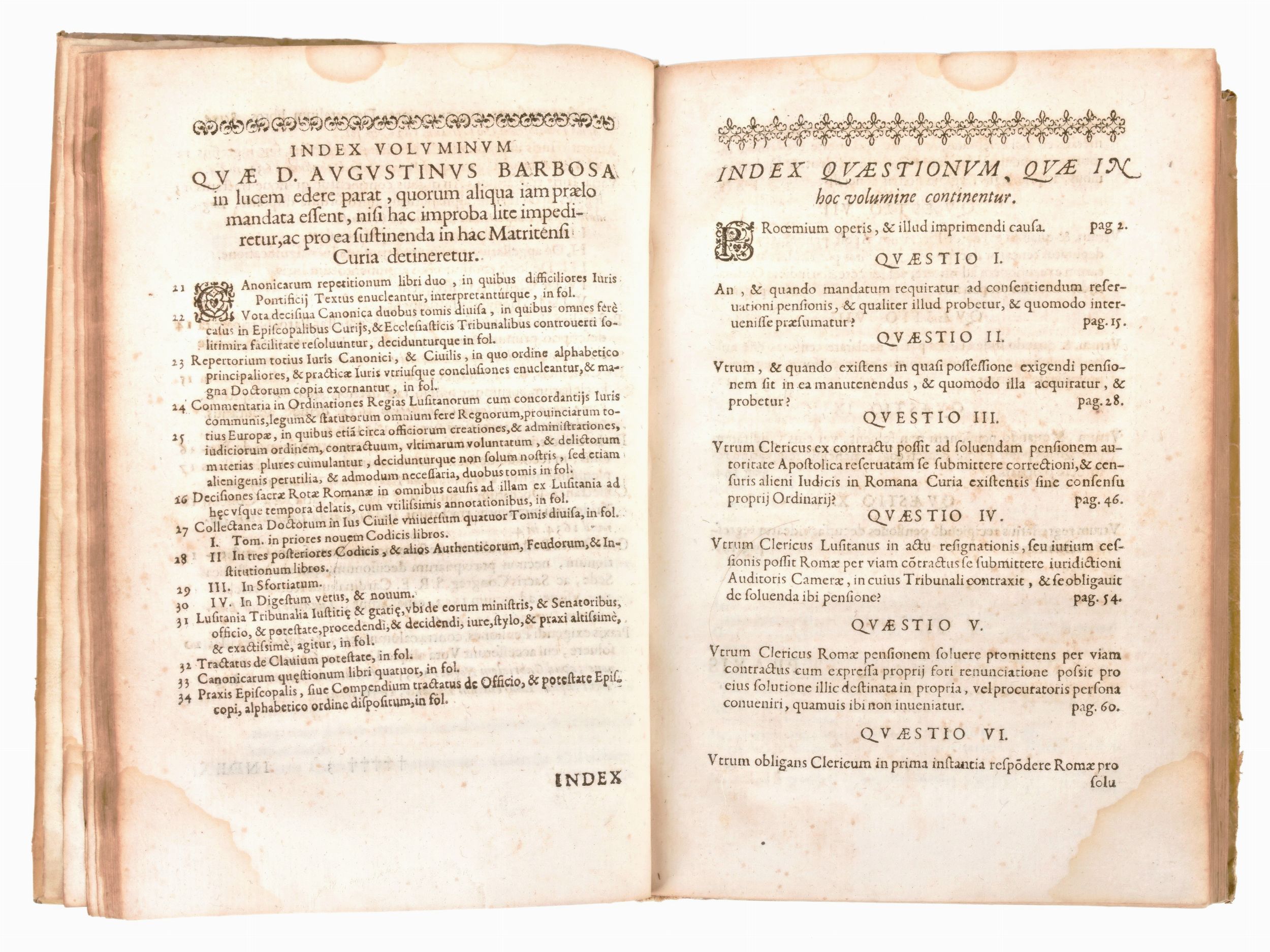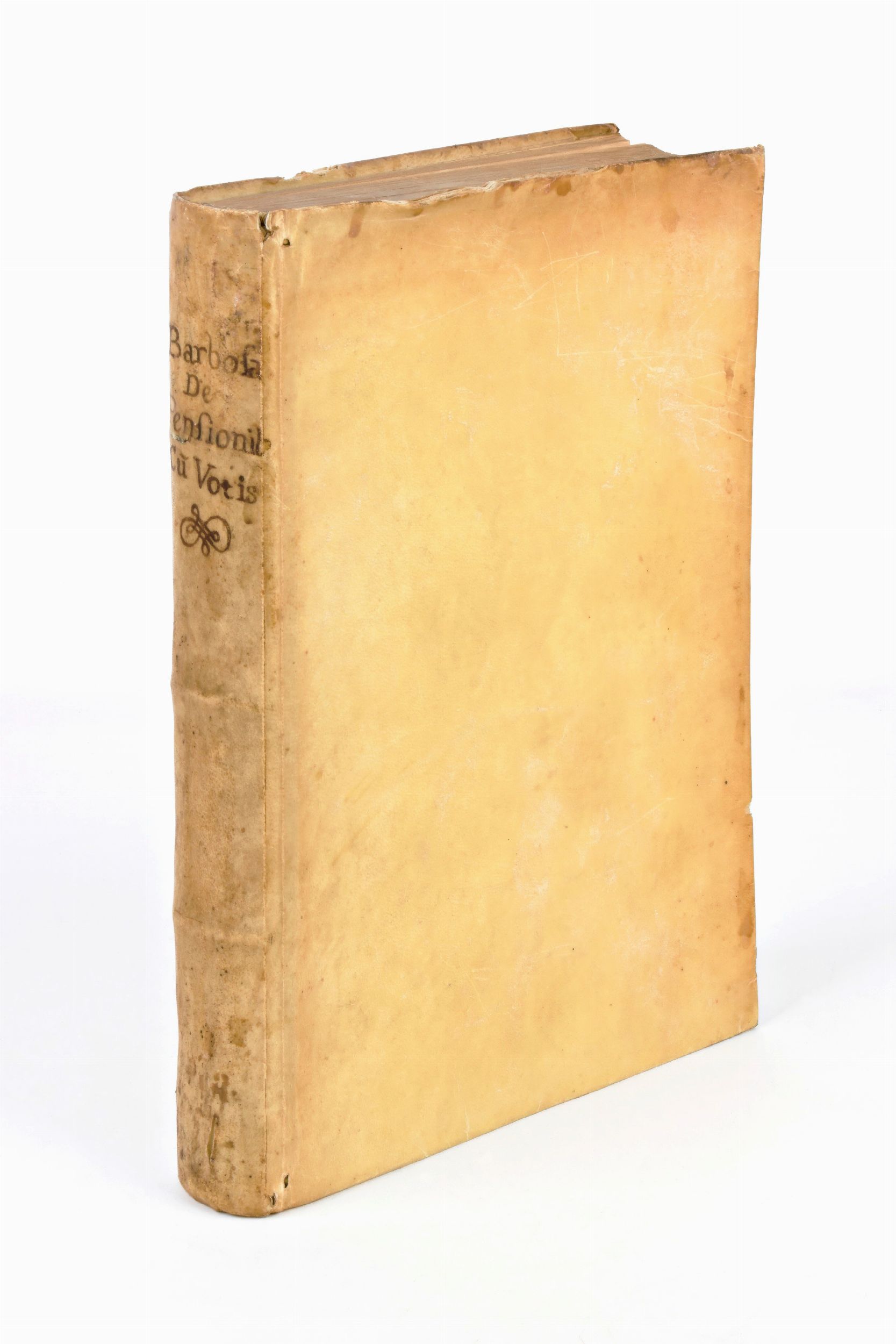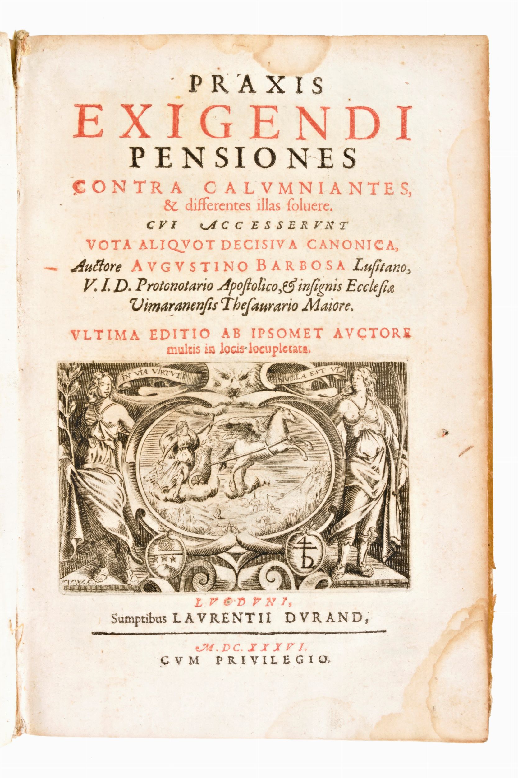 Formato in-4°, mm. 250x170, pp. (60), 408, (48), 1 c. di tav. ripieg. Completo. Rilegatura coeva in piena pergamena con titoli manoscritti al dorso. Piccola e lieve gora ai margini (angolo inferiore esterno) delle carte. Esemplare con brunitura e lievi fioriture alle carte. Piccolo strappo al risguardo anteriore. Praxis exigendi pensiones contra calumniantes, & differentes illas soluere. Cui accesserunt Vota aliquot decisiua canonica, auctore Augustino Barbosa Lusitano,... ultima editio ab ipsomet auctore multis in locis locupletate. Impresso in Lione il 1636 per Laurent Durand (1712-1763), opera di diritto canonico di Agostinho Barbosa (1590-1649), teologo e giurista portoghese. Testo latino. Front. stampato in rosso e nero con grande m arca calcografica. Stemma calcogr. del dedicatario, vescovo Lorenzo Campeggi, a c. ✝2r. Iniziali e fregi xil Le Vota decisiua canonica iniziano con propria intit. a c. X1r.