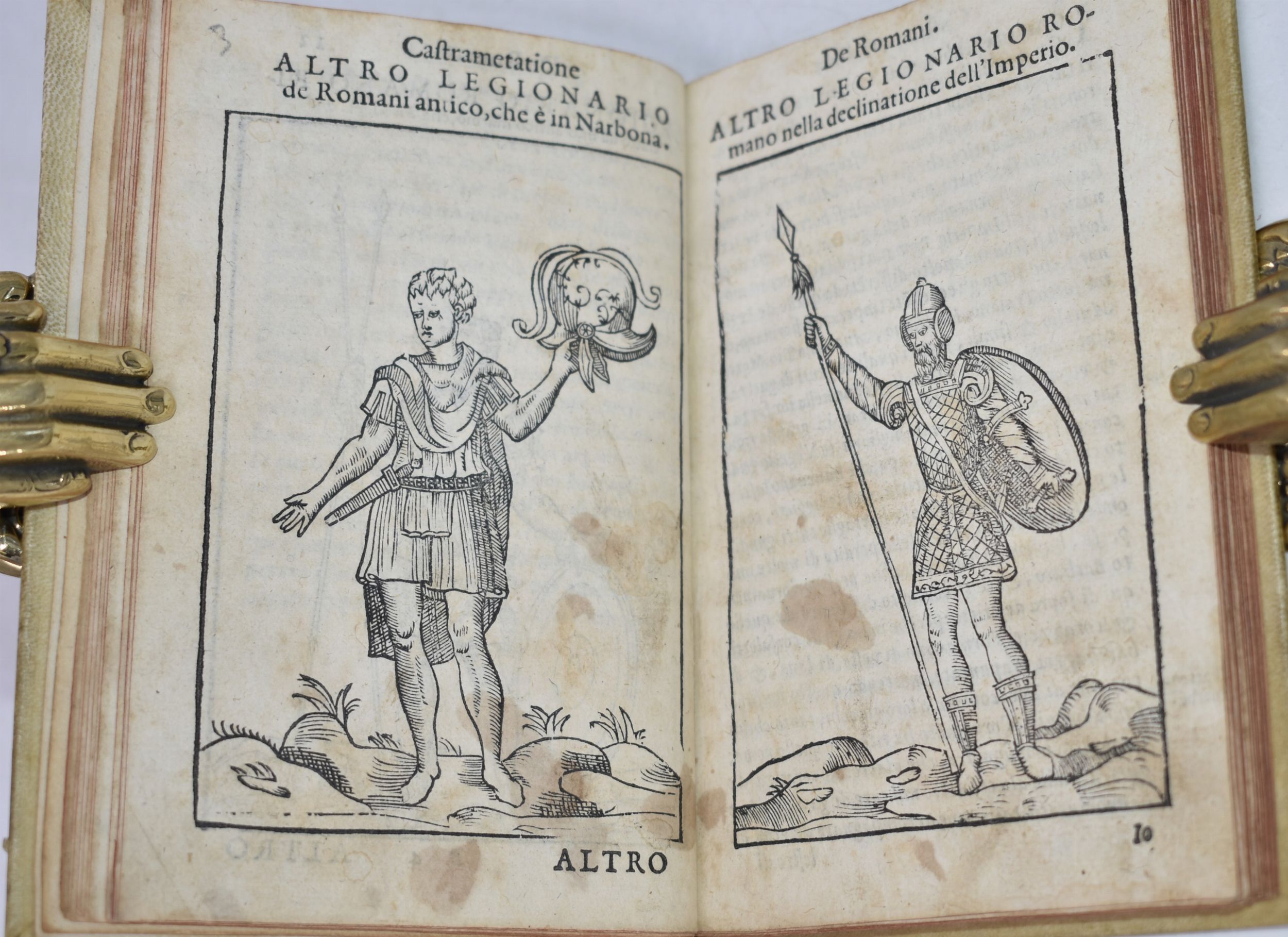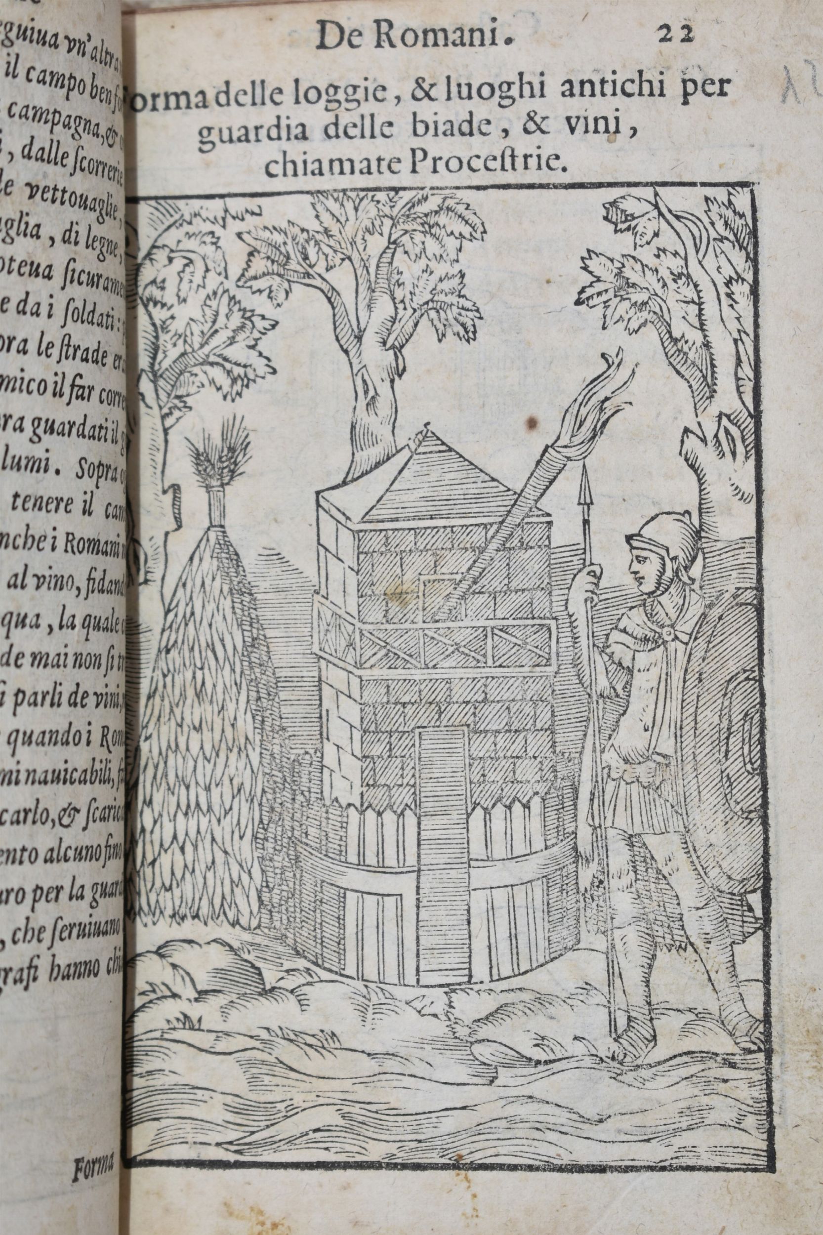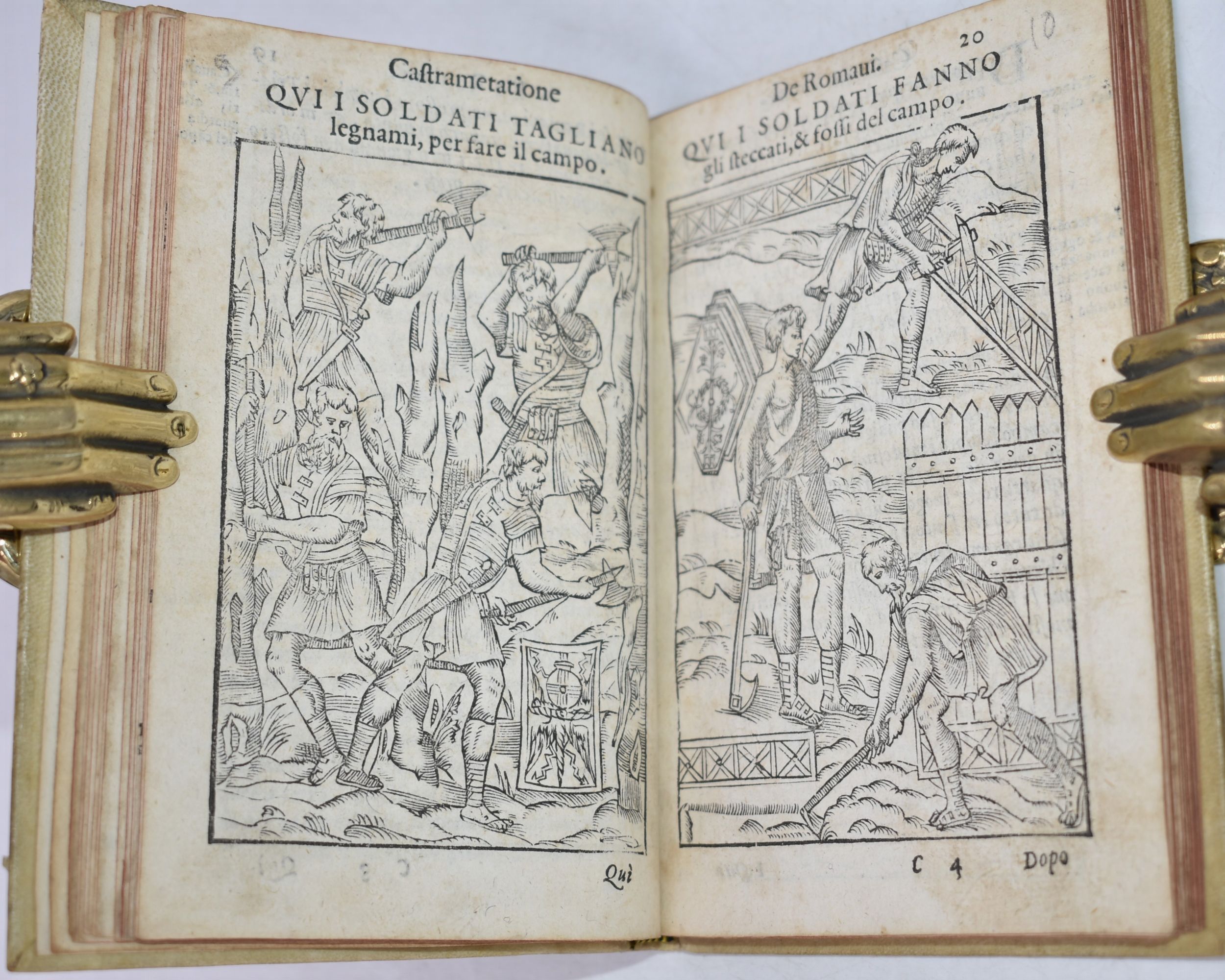 Raro figurato Cinquecentesco sull'arte del disporre accampamenti militari, con marca tip. incisa in legno al frontespizio (Minerva cavalca un lupo) e numerose incisioni nel testo raffiguranti uniformi e scene di vita degli antichi soldati romani greci e turchi, la costruzione del castrum, gladiatori, scene di guerra, i bagni e la cura del corpo, e altro. Esemplare mutilo di 5 carte.