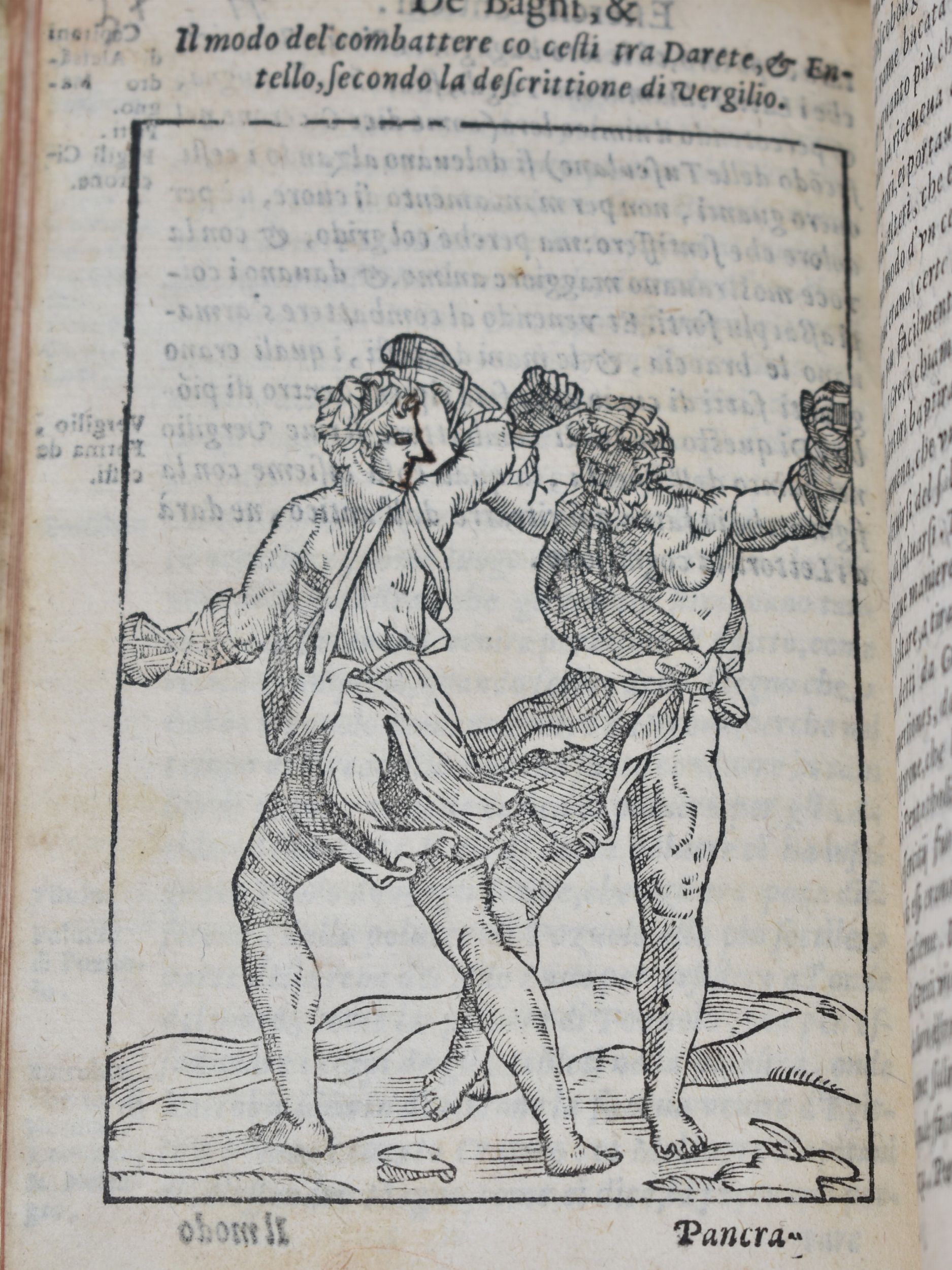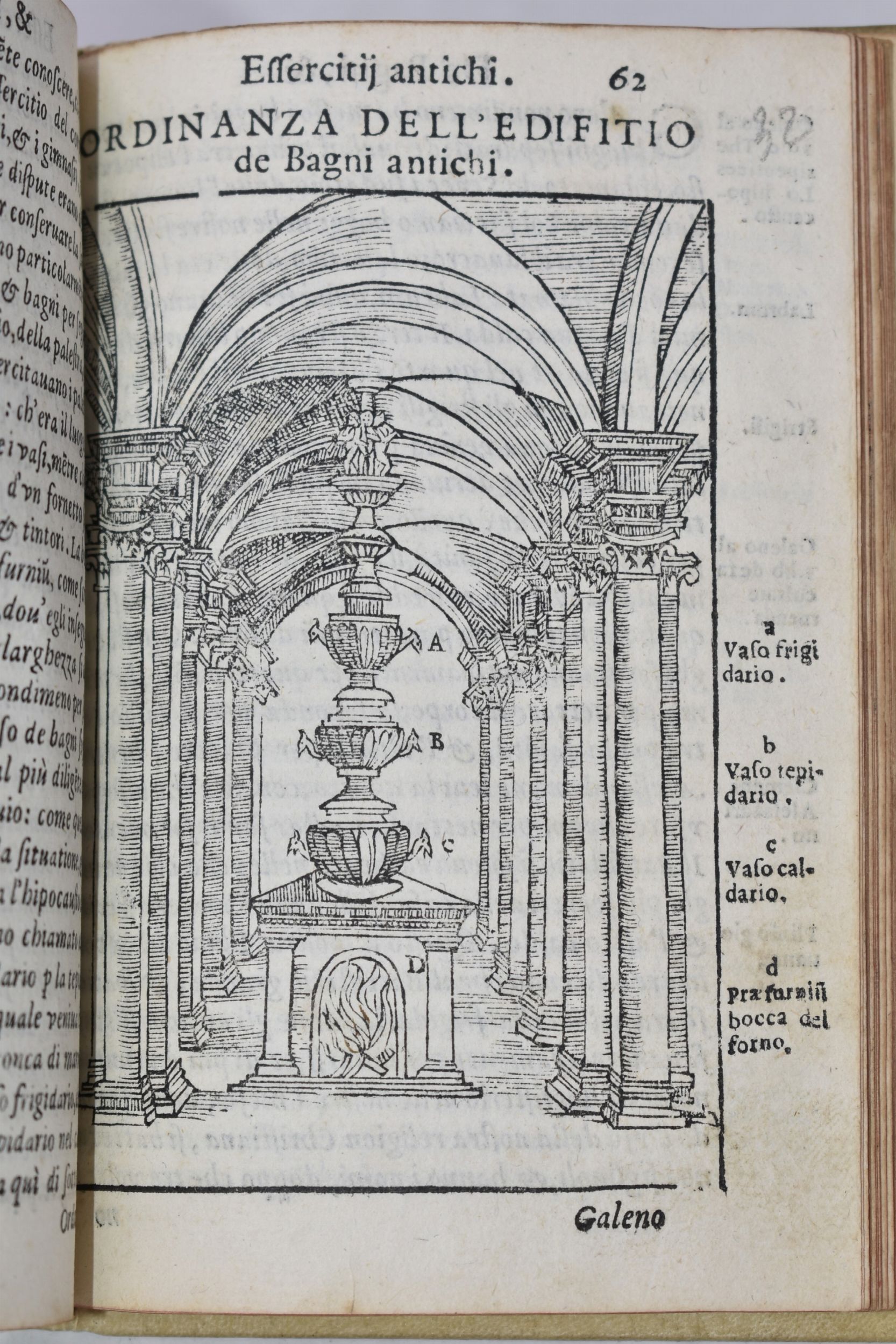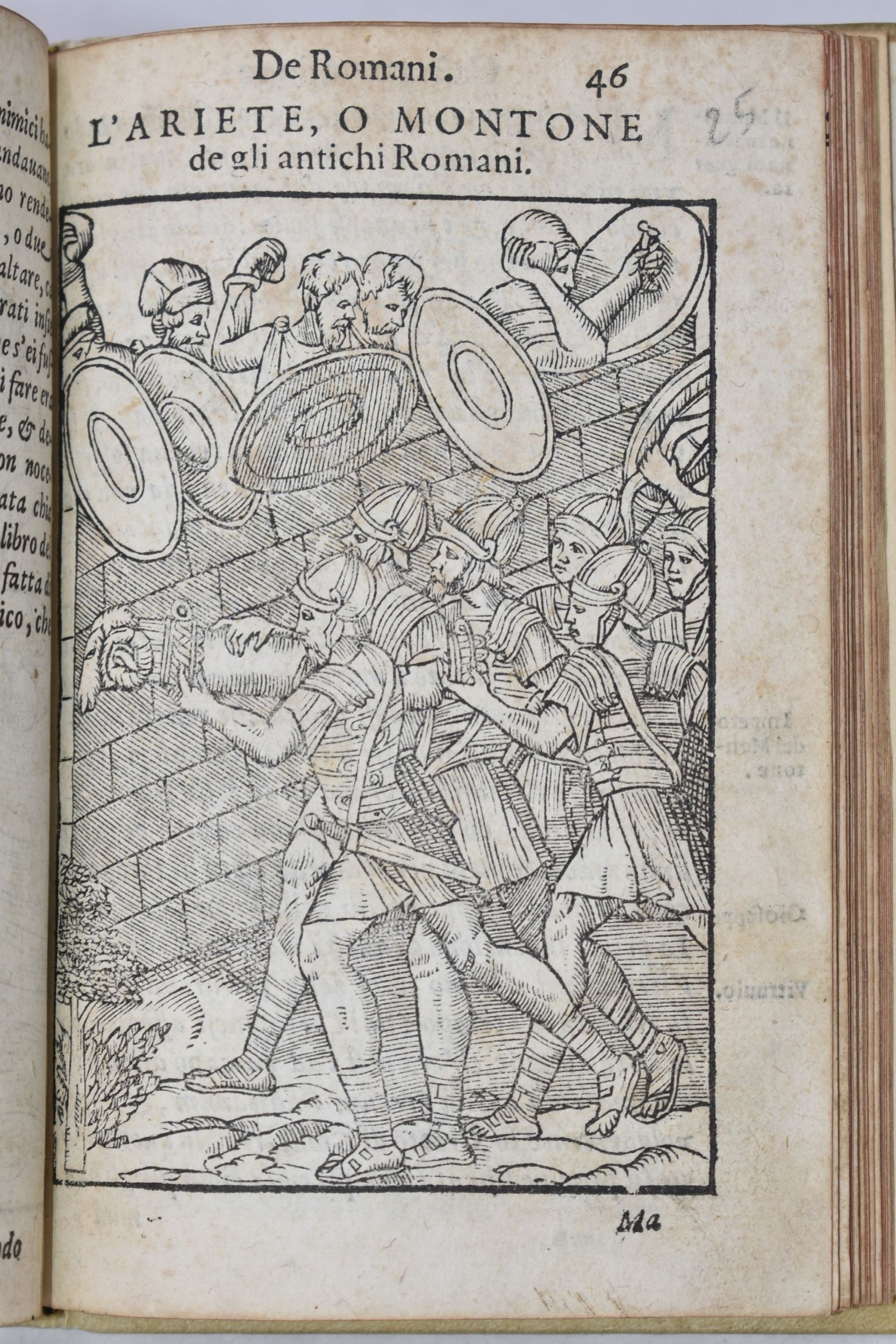 Raro figurato Cinquecentesco sull'arte del disporre accampamenti militari, con marca tip. incisa in legno al frontespizio (Minerva cavalca un lupo) e numerose incisioni nel testo raffiguranti uniformi e scene di vita degli antichi soldati romani greci e turchi, la costruzione del castrum, gladiatori, scene di guerra, i bagni e la cura del corpo, e altro. Esemplare mutilo di 5 carte.