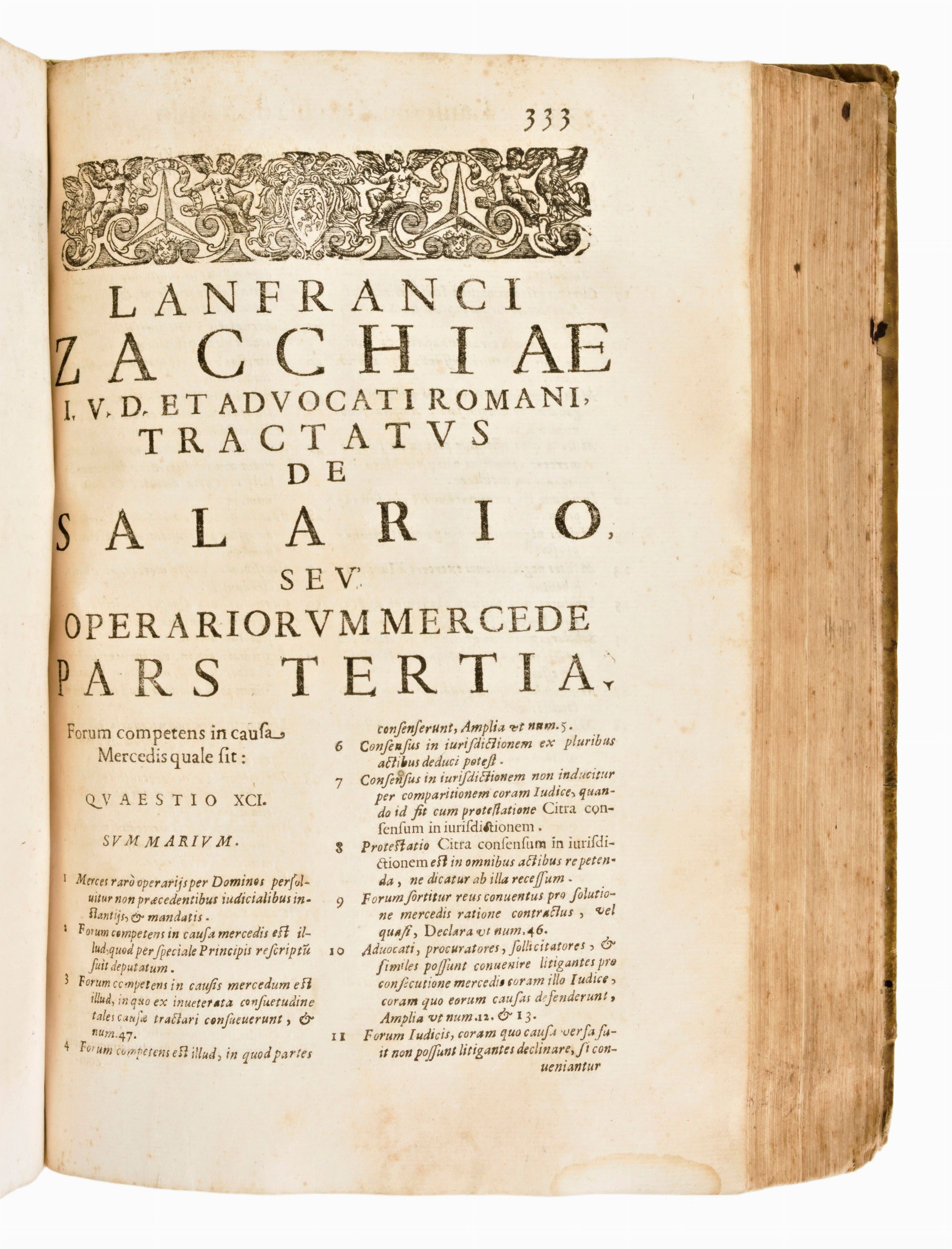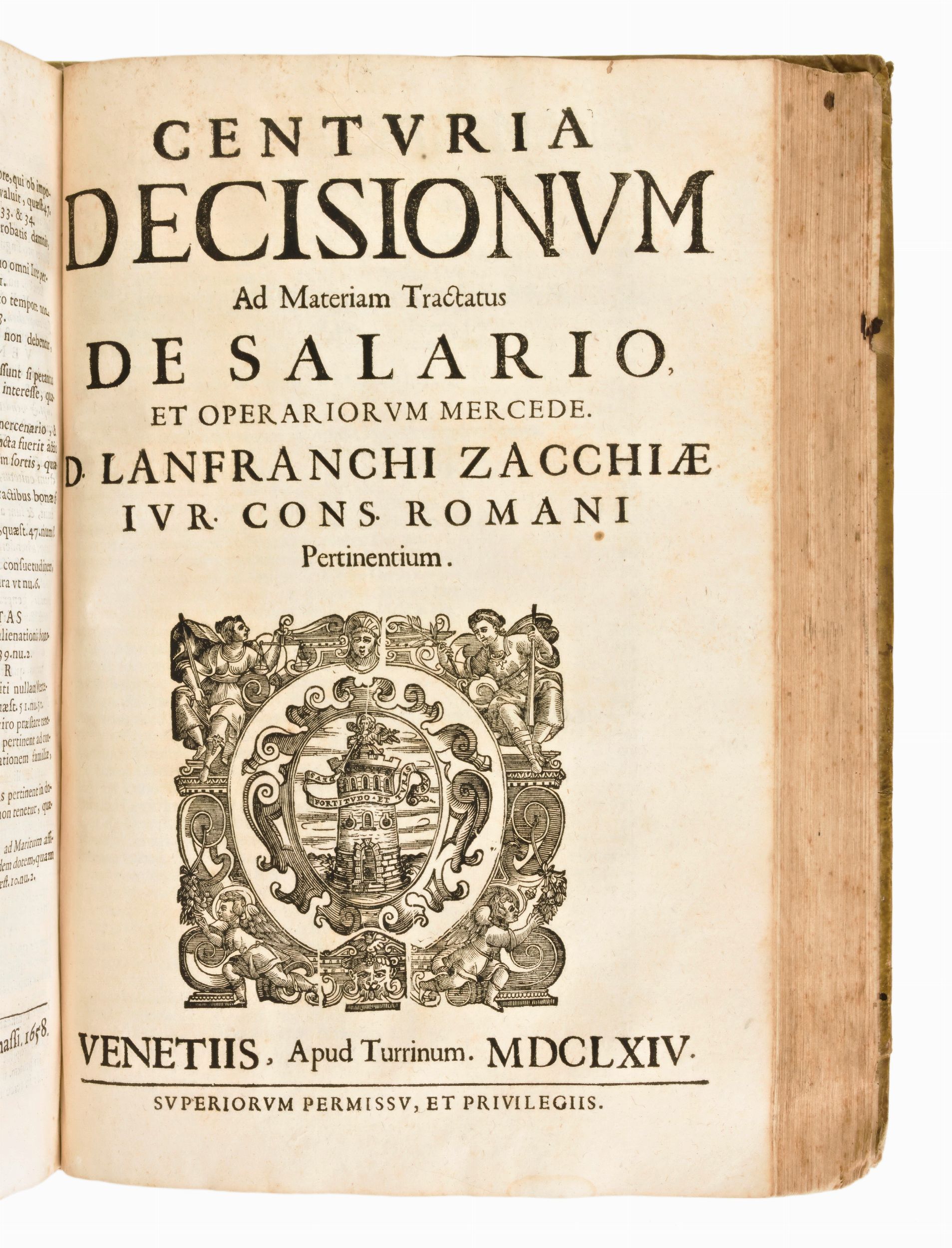 Et Advocati Romani De Salario, sev operarariorum Mercede. Tractatus in tres partes distinctus, In quo quaeftiones omnes, tam ad Theoricam, quam ad Praxim pertinentes proponuntur, pertractantur, refoluuntur, Opus Iurifperitis omnibus tam in Foris Romae, Ex Typ. Nicolai Tinaffi, 1658. In-folio, mm. 325x225, pp. (10 di 12), 406, (88). Manca antiporta (Occhietto). Front. stampato in rosso e nero con grande marca tipografica (Madonna con bambino tra due angeli). Rilegatura in mezza pergamena post. con titolo manoscritto al dorso. In fine con proprio frontespizio : Centuria decisionum ad materiam Tractatus de salario, et operariorum mercede, d. Lanfranchi Zacchiae iur. cons. Romani pertinentium. Venetiis : apud Turrinum, 1664. Pp. (76), 180. Completo. Grande marca tipografica in xilografia al front. (Torre sormontata da angelo che suona una tromba dalla quale fuoriesce cartiglio recante la scritta: Deus fortitudo et turris mea). Testo latino stampato su due colonne.