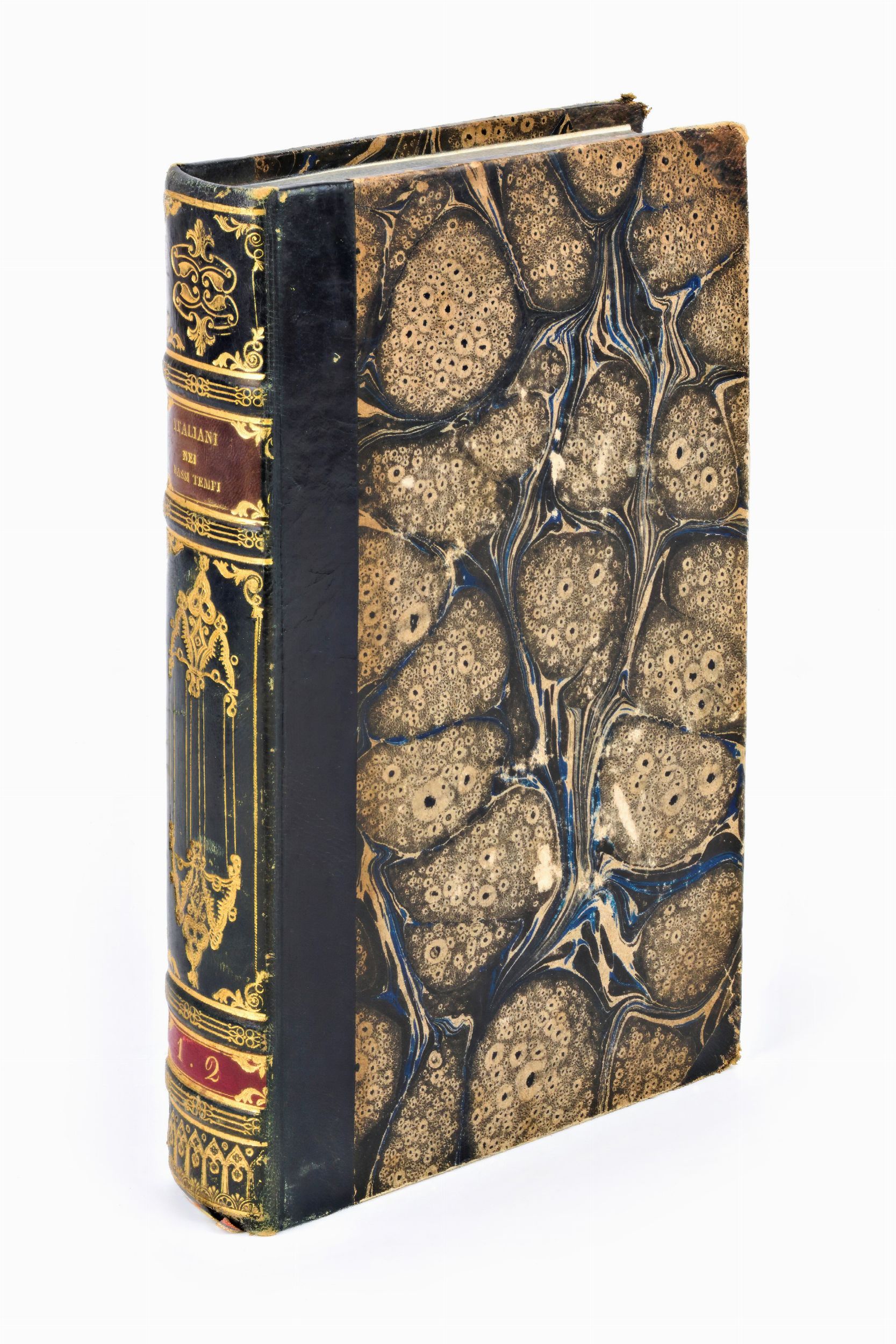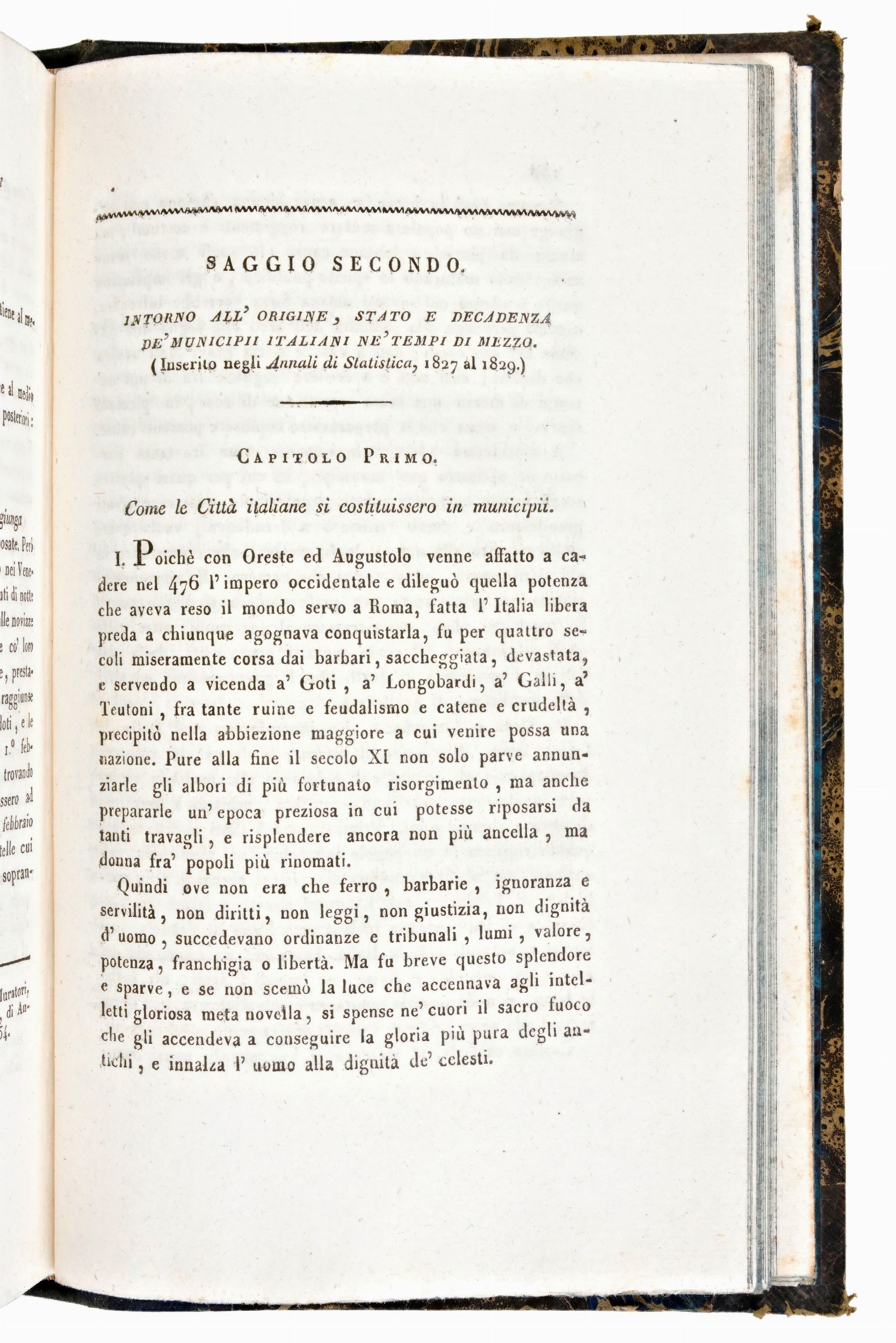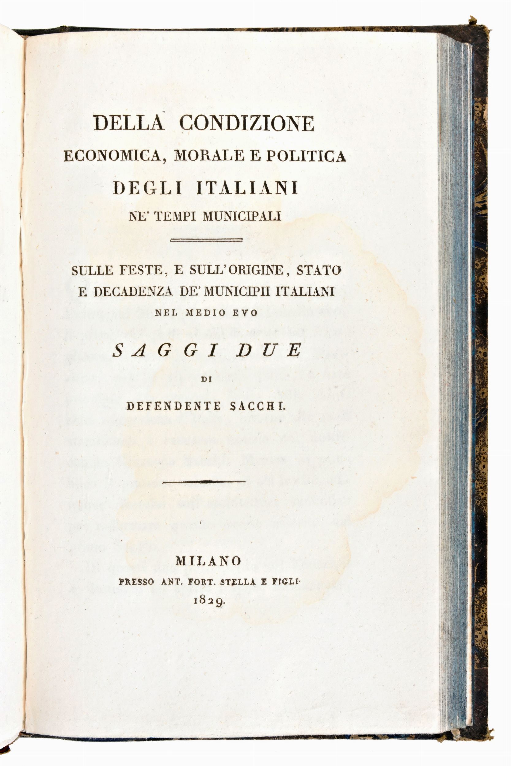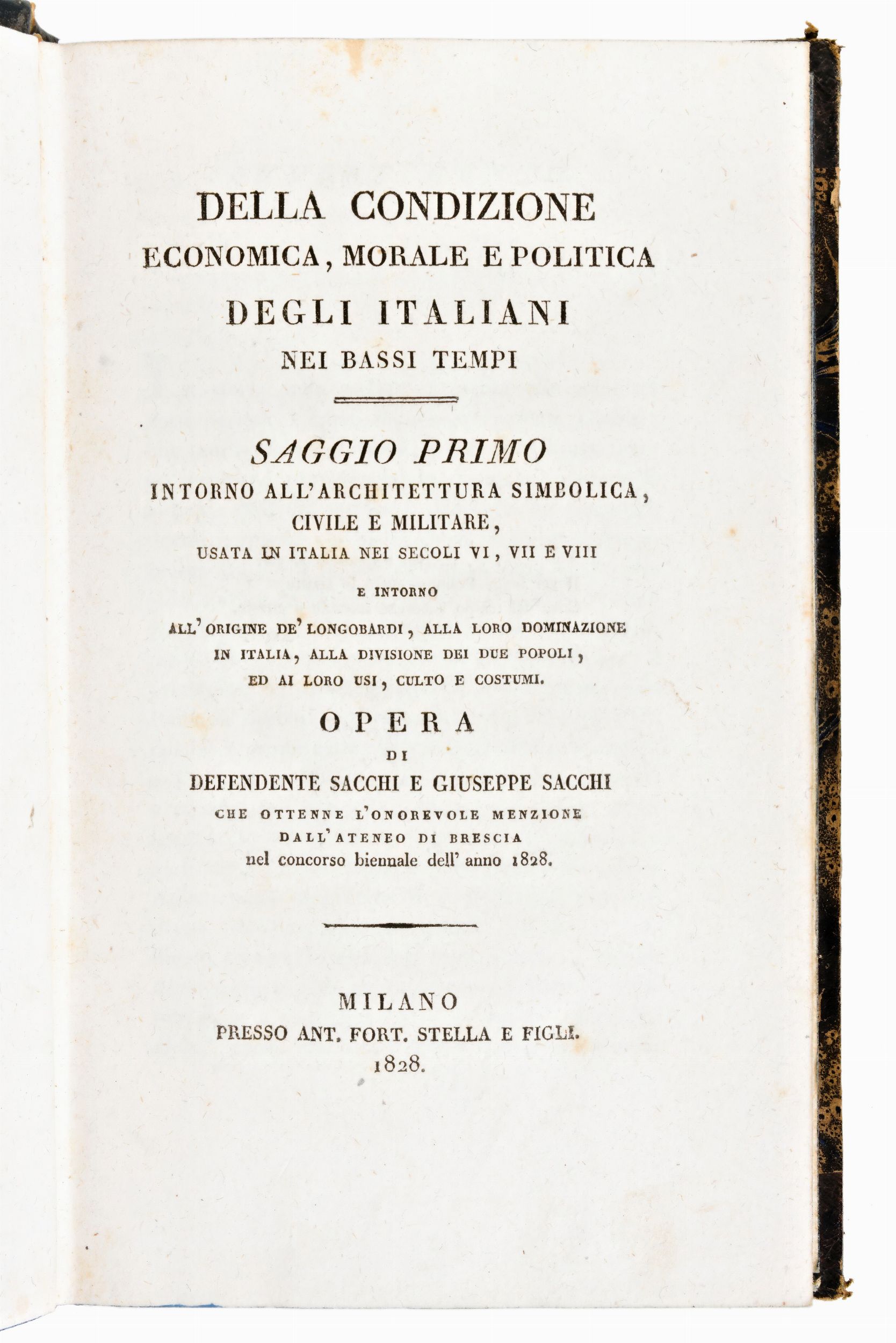 Opera completa in 2 parti rilegate in un unico volume. Formato in-8°, mm. 215x140, pp. 267, (1), XII, 214, (2). Completo. Elegante rilegatura coeva in mezza pelle con fregi in oro e titoli su tassello in pelle al dorso. Piatti e risguardi in antica carta marmorizzata. Tagli in blu. Esemplare ottimo, con testo nitido e lievi fioriture alle carte. Minimi difetti e segni del tempo. Titoli : Della condizione economica, morale e politica degli italiani nei bassi tempi. Saggio primo intorno all'architettura simbolica, civile e militare, usata in Italia nei secoli 6., 7. e 8. e intorno all'origine de' Longobardi, alla loro dominazione in Italia, alla divisione dei due popoli ed ai loro usi, culto e costumi. 2° parte con proprio frontespizio : Della condizione economica, morale e politica degli Italiani ne' tempi municipali. Sulle feste, e sull'origine, stato e decadenza de' municipii italiani nel Medio evo. Saggi due di Defendente Sacchi. Antica edizione completa in 2 volumi impressa in Milano tra il 1828 e 1829 per Antonio Fortunato Stella & Figli. Opera dei cugini Giuseppe (1804-1891) e Defendente Sacchi (1796-1840).
