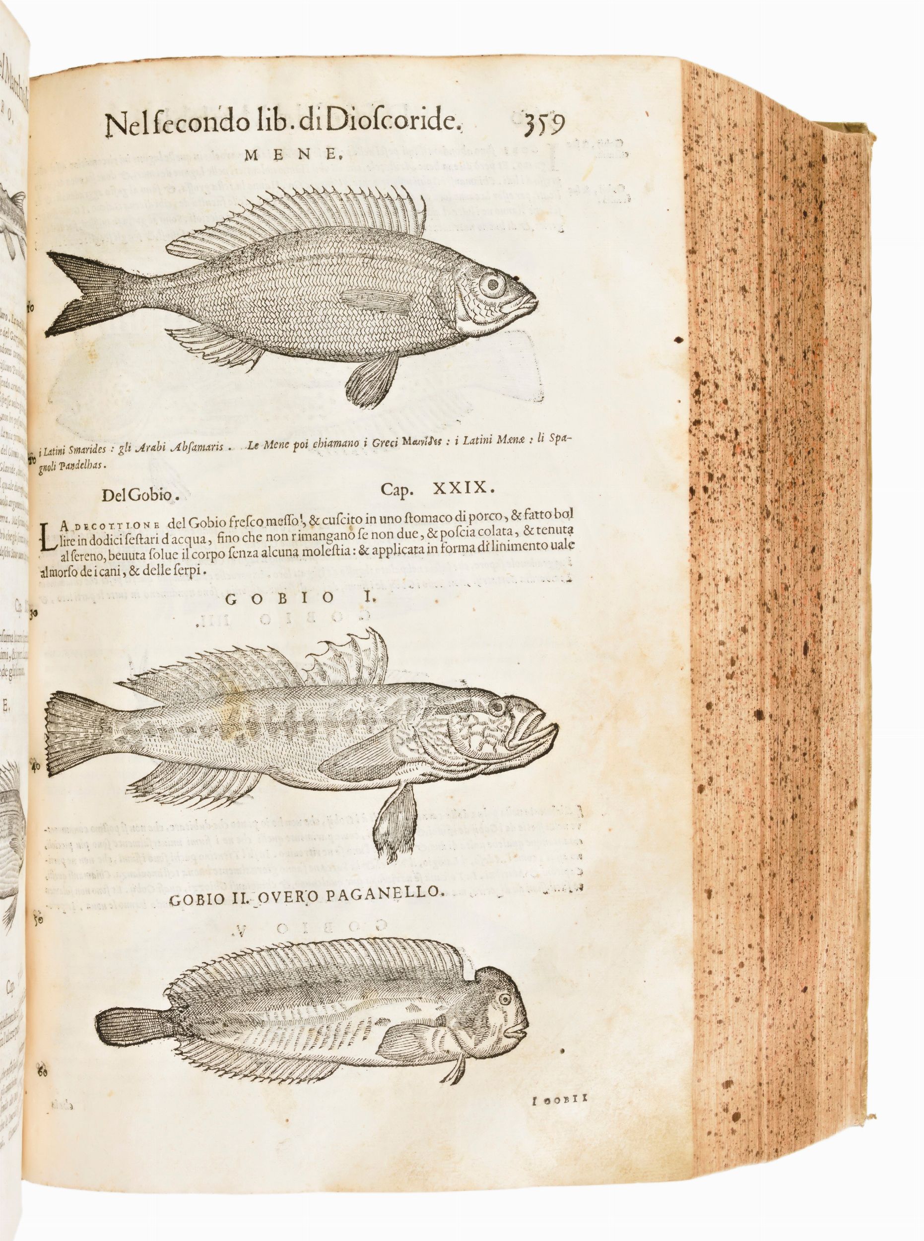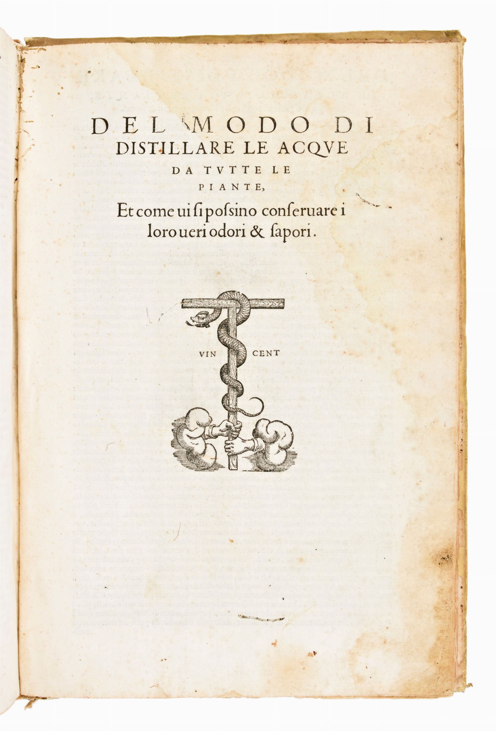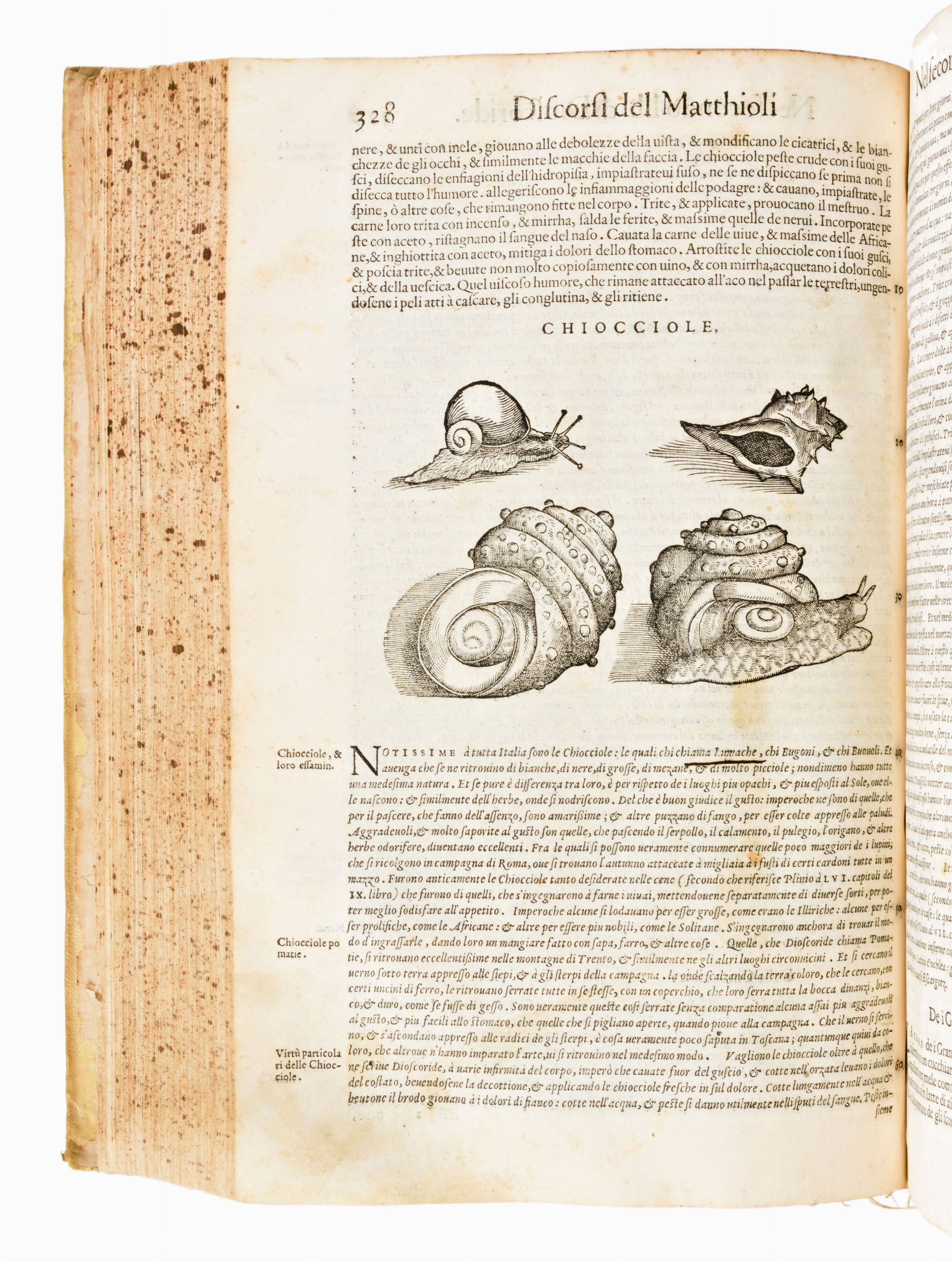 In-folio, mm. 345x235, pp. (180), 1527, (13). Completo. Rilegatura post. (XVII o XVIII sec.) in piena pergamena antica con 4 nervature e titoli manoscritti al dorso (difetti). Tagli delle cc. a spruzzo. Esemplare con solchi di tarli, a colpire principalmente le prime 90 carte (introduzione e indice), con mancanze e perdite di testo. Una delle principali edizioni accresciute del Mattioli, con oltre 1000 xilografie raffiguranti piante, animali e attrezzature per la distillazione. Al colophon : Stampato in Venetia nella bottega di Vincenzo Valgrisi, 1568. Ritratto xilografico dell'Autore alla carta m8v. Marca tipografica in xilografia al front. e al colophon. Testo in italiano. Iniziali xilografiche ornate. In fine con proprio frontespizio : Del modo di distillare le acque da tutte le piante, et come ui si possino conseruare i loro ueri odori & sapori.