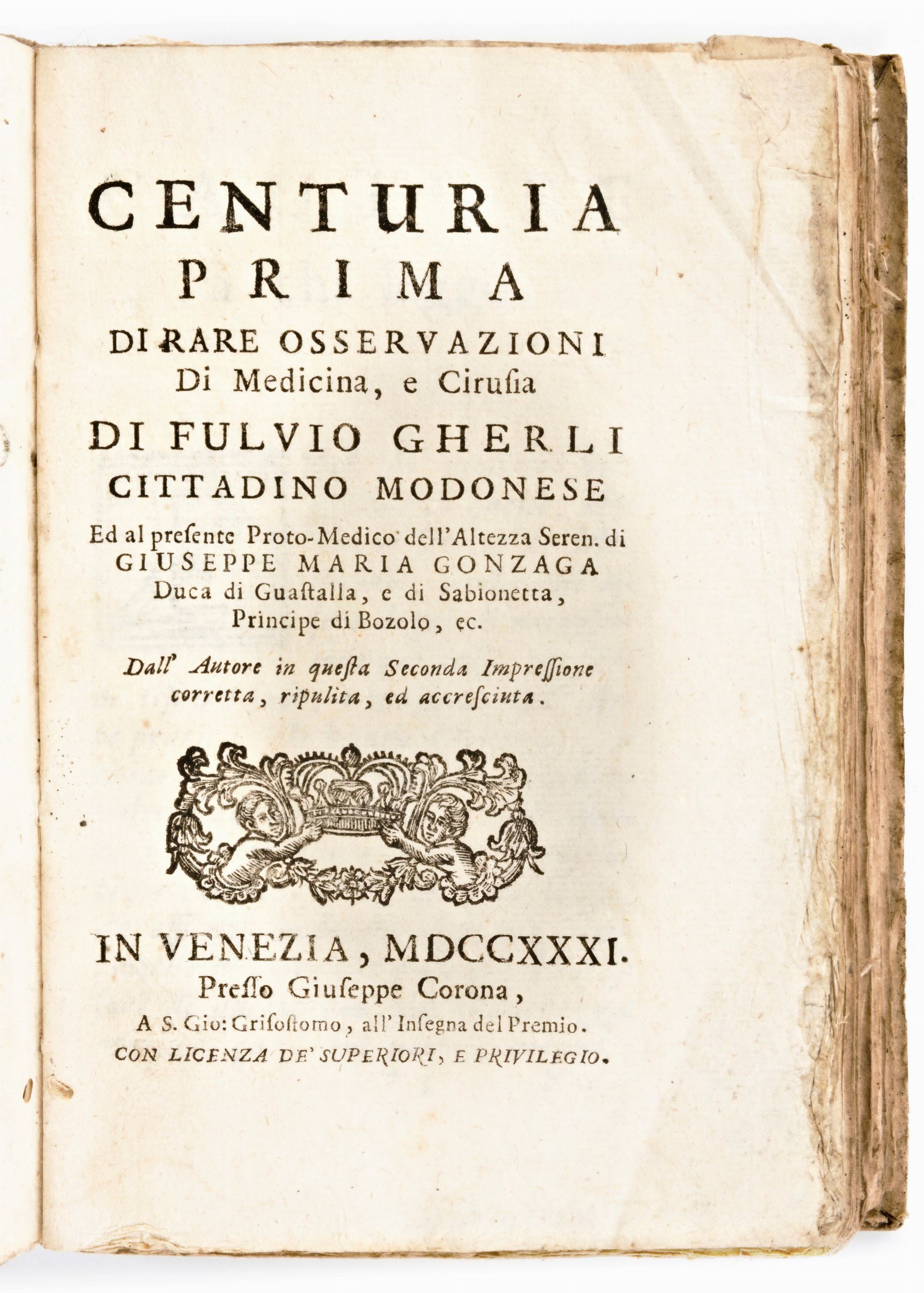 Formato in-8°, mm. 240x190, pp. (16), 328. Cartonato coevo flessibile con lievi difetti e macchie. Titoli manoscritti al dorso. Lievi fioriture e segni di gora ai margini delle carte. Piccolo foro al margine delle prime 4 carte. Seconda impressione corretta, ripulita, ed accresciuta. In Venezia il 1731 presso Giuseppe Corona, opera del medico e alchimista italiano Fulvio Gherli (1670-1735). Raccolta di cento osservazioni medico chirurgiche (Depressione e frattura del Cranio, dolore di capo acerbissimo, oftalmia, calcolo ne' reni, aborto con emorragia, febbre, tumori etc.) con annotazioni terapeutiche dell'autore. Testo italiano. Testatine, capilettere e finalini xilografici. Marca tipografica al front. (Corona sorretta da due putti in cornice floreale).