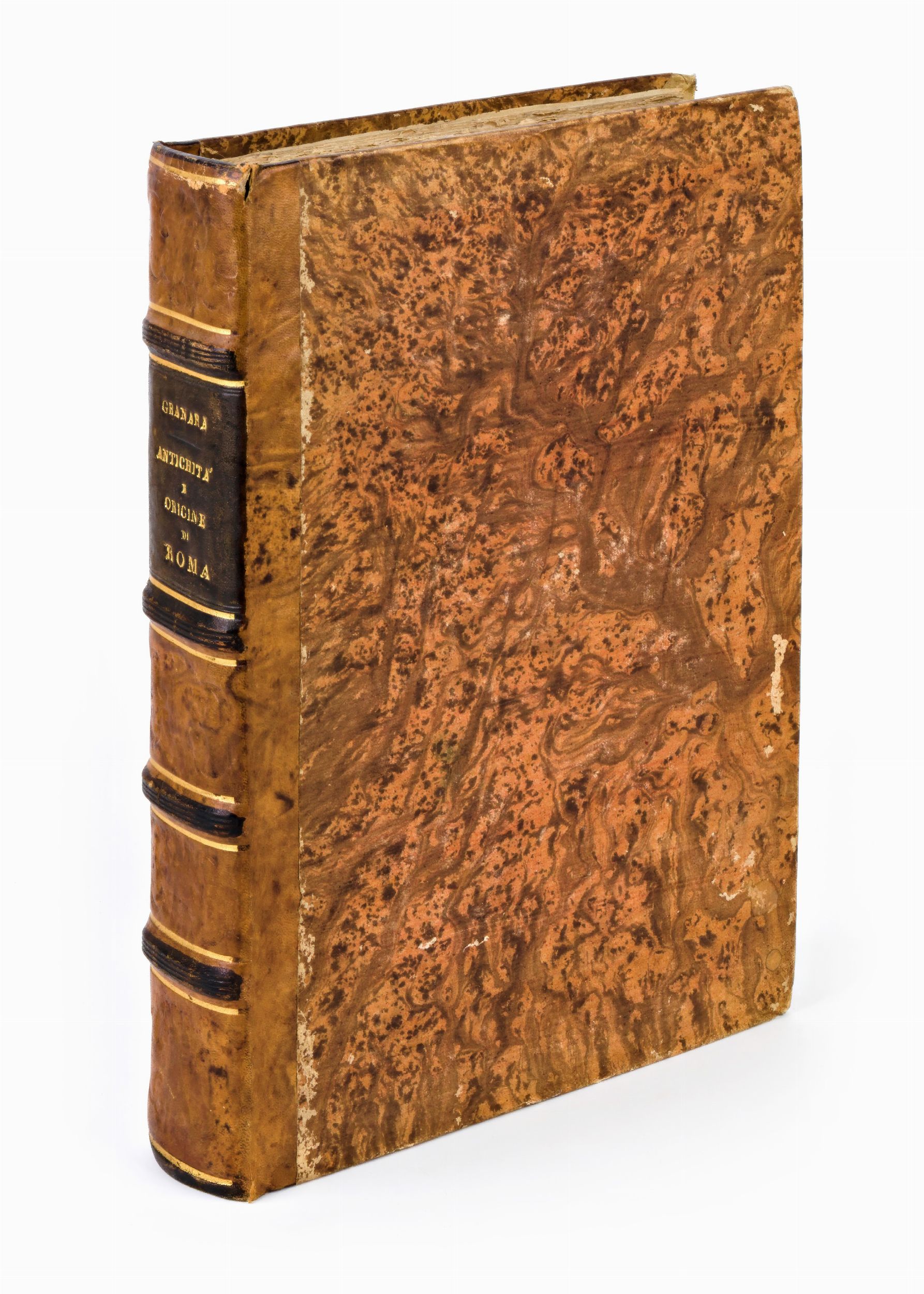 Formato in-4°, mm. 305x220, pp. (24), 756, (2) + 1 c. di tav. ripieg. Esemplare mancante dell'antiporta. Rilegatura post. (XIX sec.) in mezza pelle con 4 nervature, titoli in oro e fregi impressi a secco al dorso. Piatti in carta antica decorativa. Frontespizio (parzialmente distaccato) stampato in rosso e nero con vignetta calcografica. 1 tavola calcografica ripiegabile con monete romane. Testatine e finalini con vignette calcografiche. Testo nitido, con lievi fioriture alle carte. Antica edizione impressa in Venezia il 1734 per Giammaria Lazzaroni.
