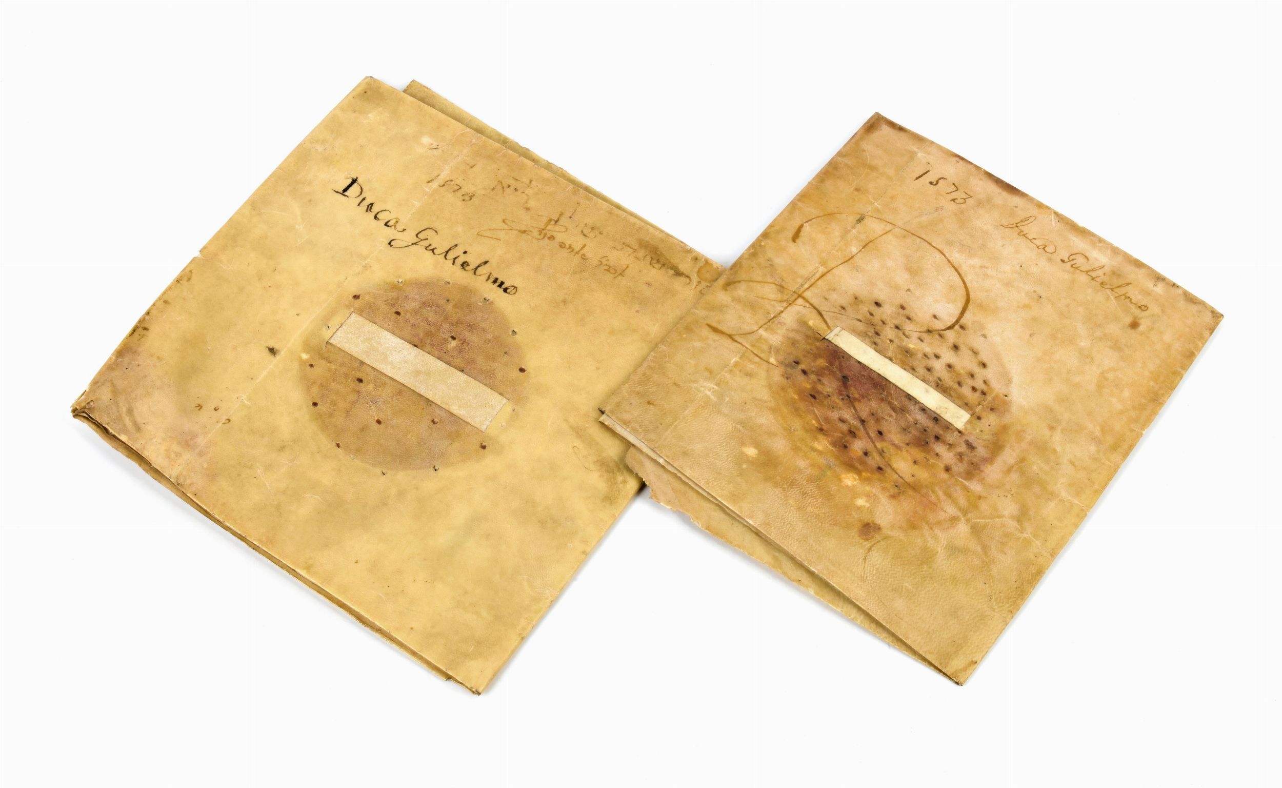 Guglielmo Gonzaga (Mantova 1538 β Goito 1587) terzo duca di Mantova e del Monferrato. Coppia di Pergamene Manoscritte datate 1573 a firma Guglielmus e altre firme tra cui il cancelliere. Uno dei sigilli in carta risulta conservato, l'altro in cera Γ¨ solo parzialmente conservato. Stato di conservazione molto buono (45x30 cm. + 36x29 ca.) (2)