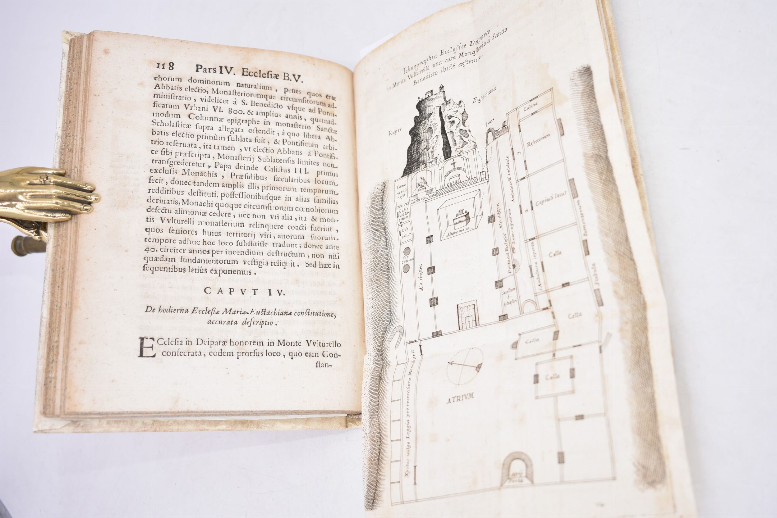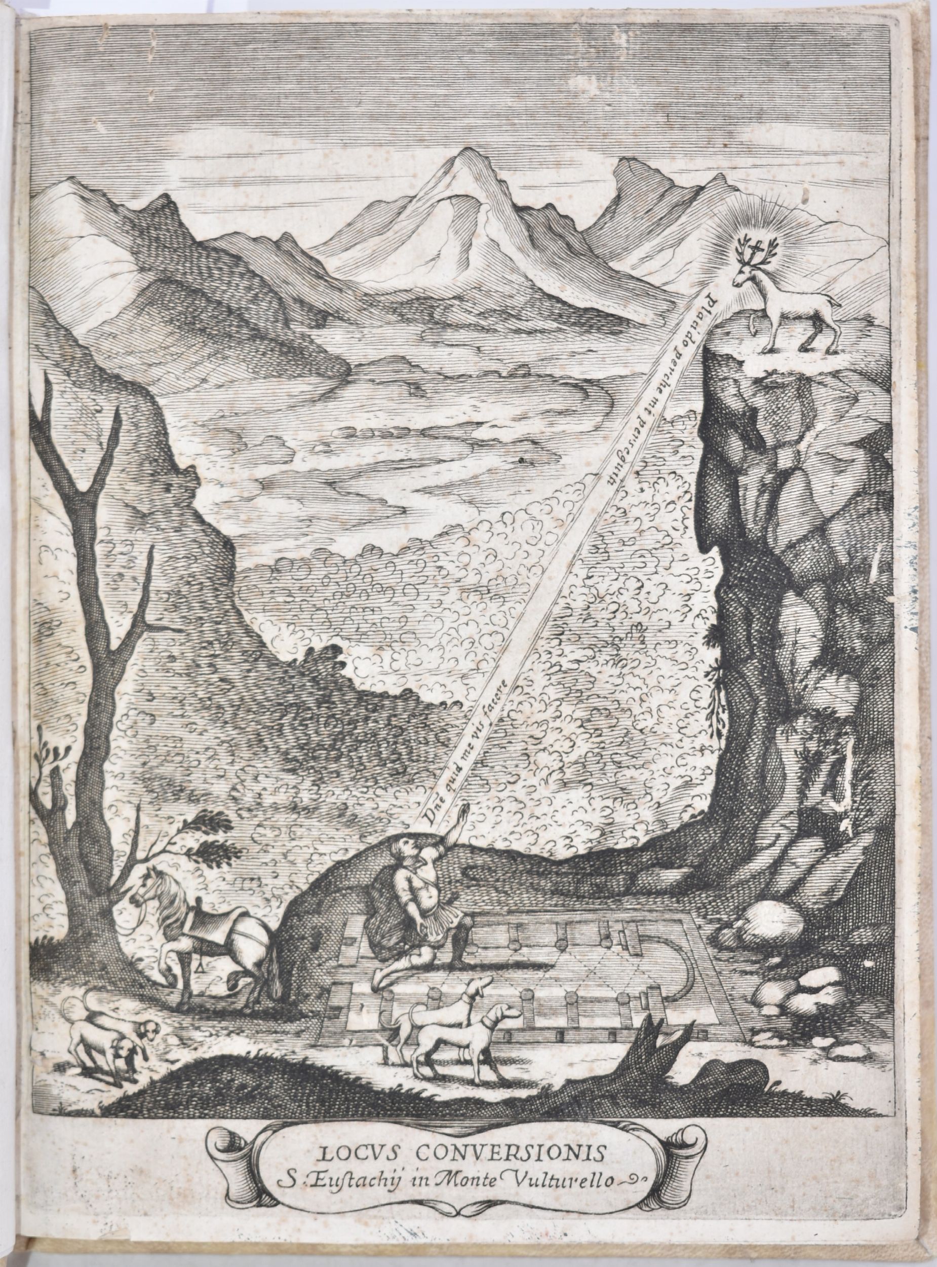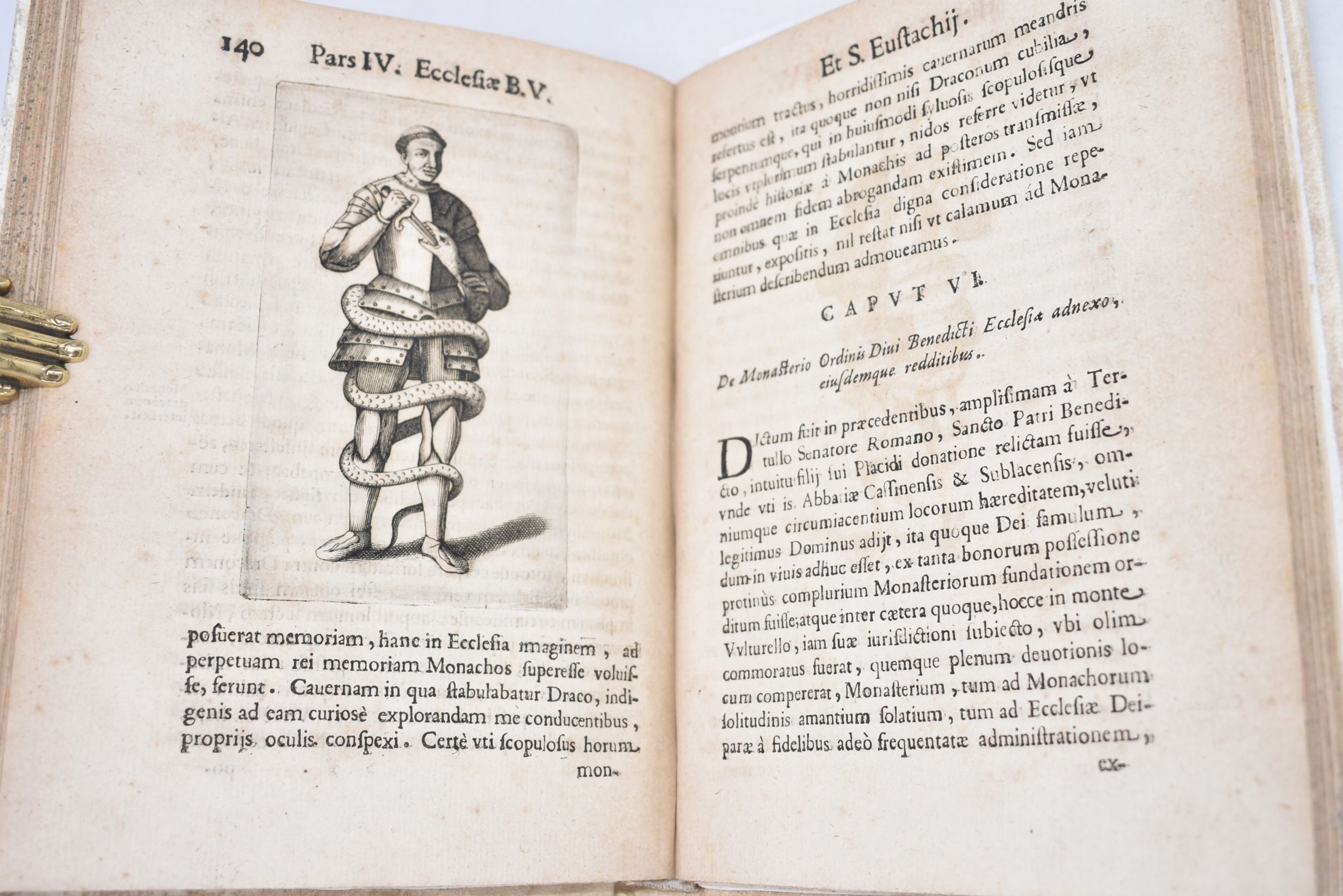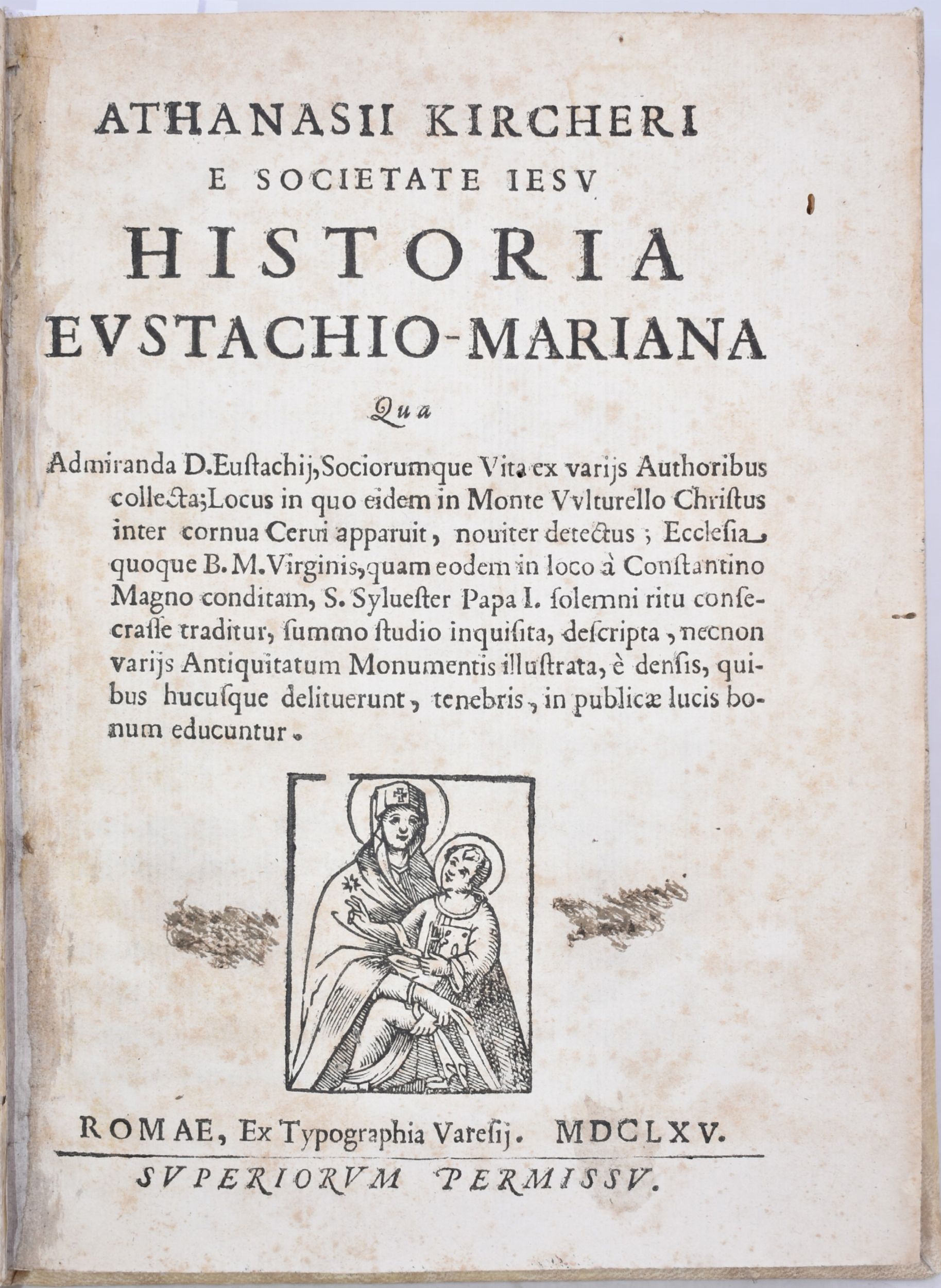Seicentina figurata con la rara edizione originale del trattato kircheriano sul casuale ritrovamento a Mentorella, nei pressi di Tivoli (RM), di un antico santuario dedicato alla Vergine Maria laddove sarebbe avvenuta la conversione cristiana di S. Eustachio martire. Opera corredata con diverse incisioni nel testo anche a pagina intera, e 7 tavole ripiegate raffiguranti vedute, prospetti e piante del santuario mariano, la Croce argentea donata da Costantino, una mappa a volo d'uccello che va dai castelli romani a Subiaco, e altro ancora; con antiporta calc. raffigurante la miracolosa conversione di S. Eustachio davanti al cervo inviato da Cristo, una vignetta al front. con Maria che tiene in braccio Gesù bambino, testatine e finalini xil. con iniziali finemente incise. Lievi segni del tempo come fioriture sparse, rari segni in china e piccoli forellini di tarlo alle carte preliminari.