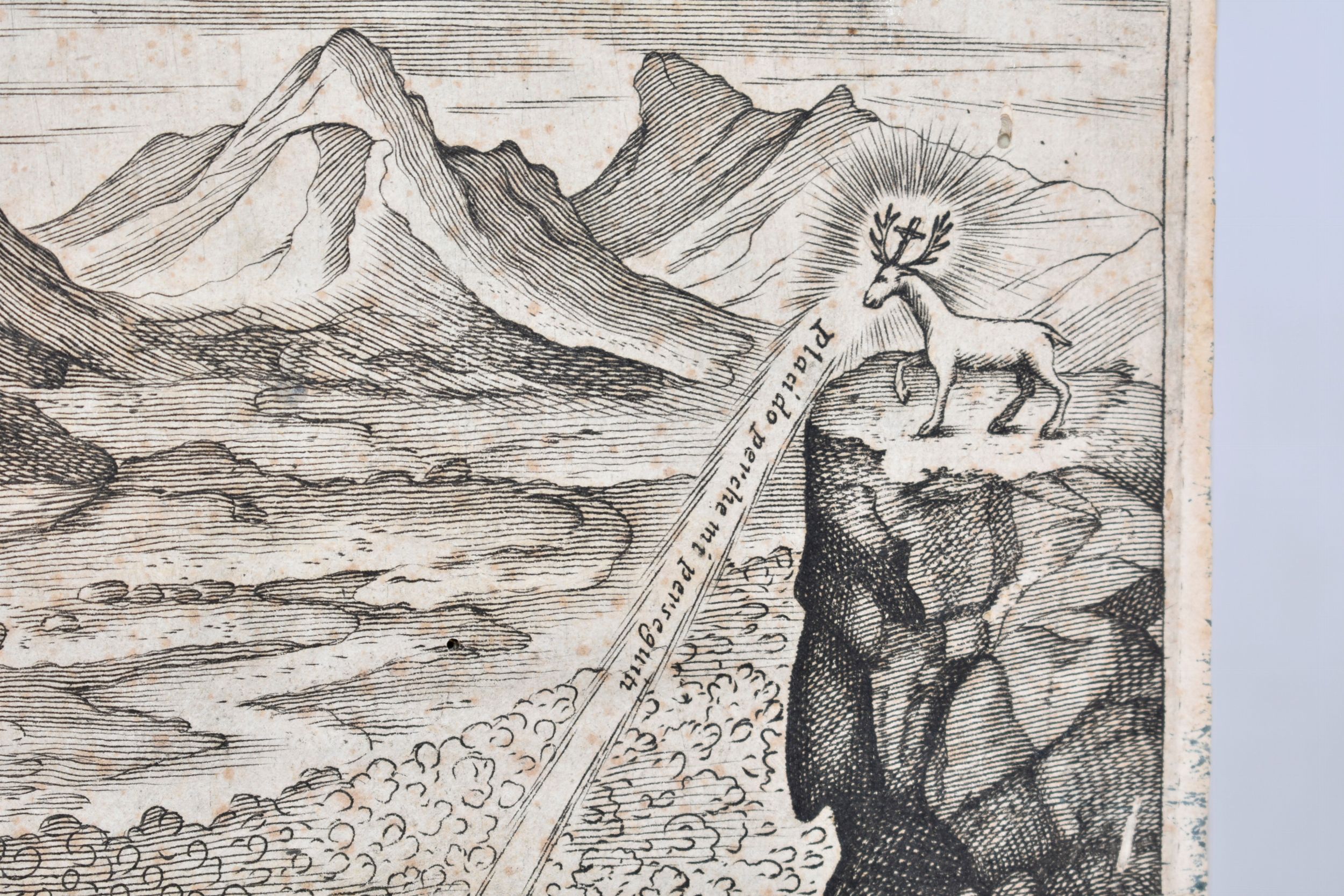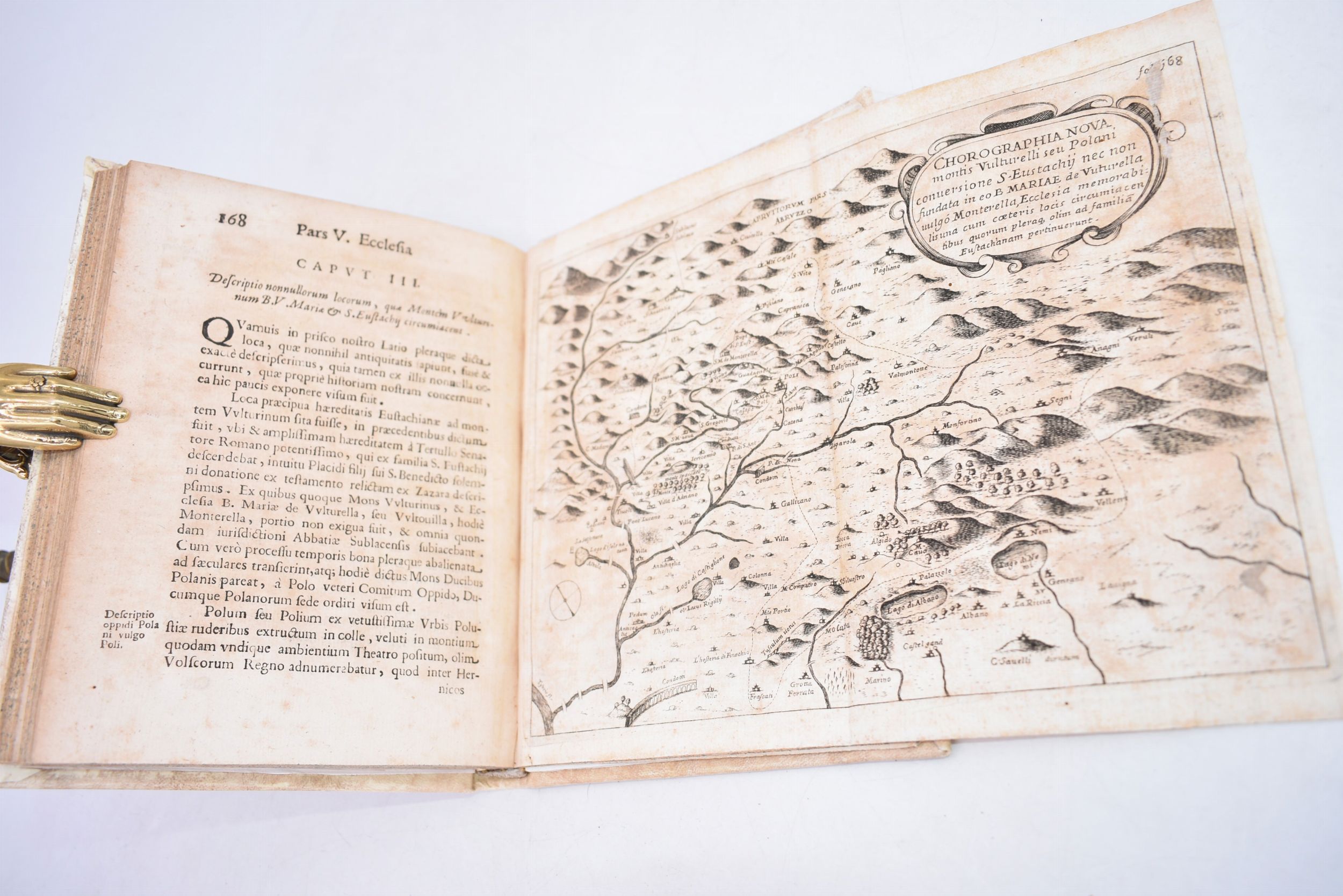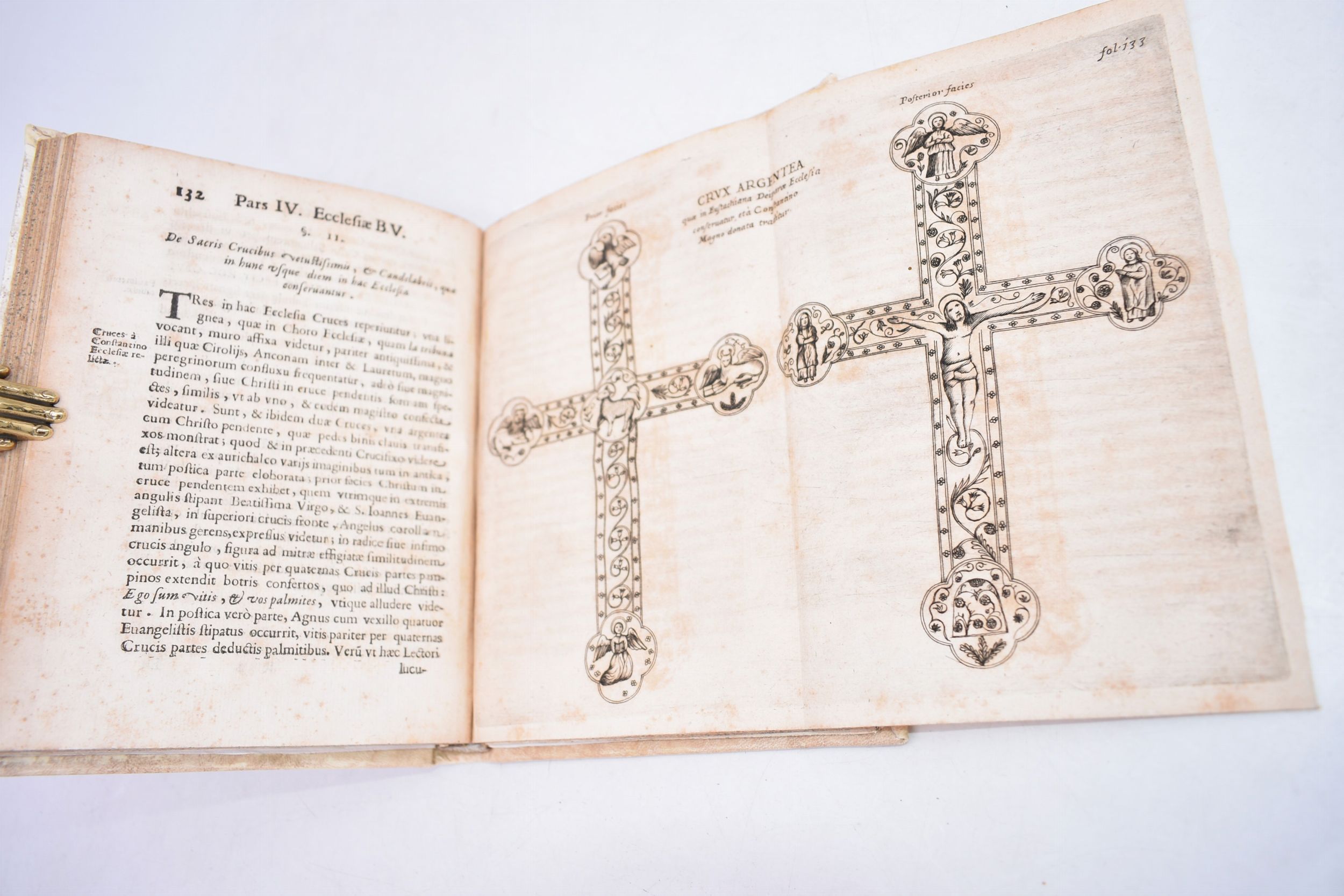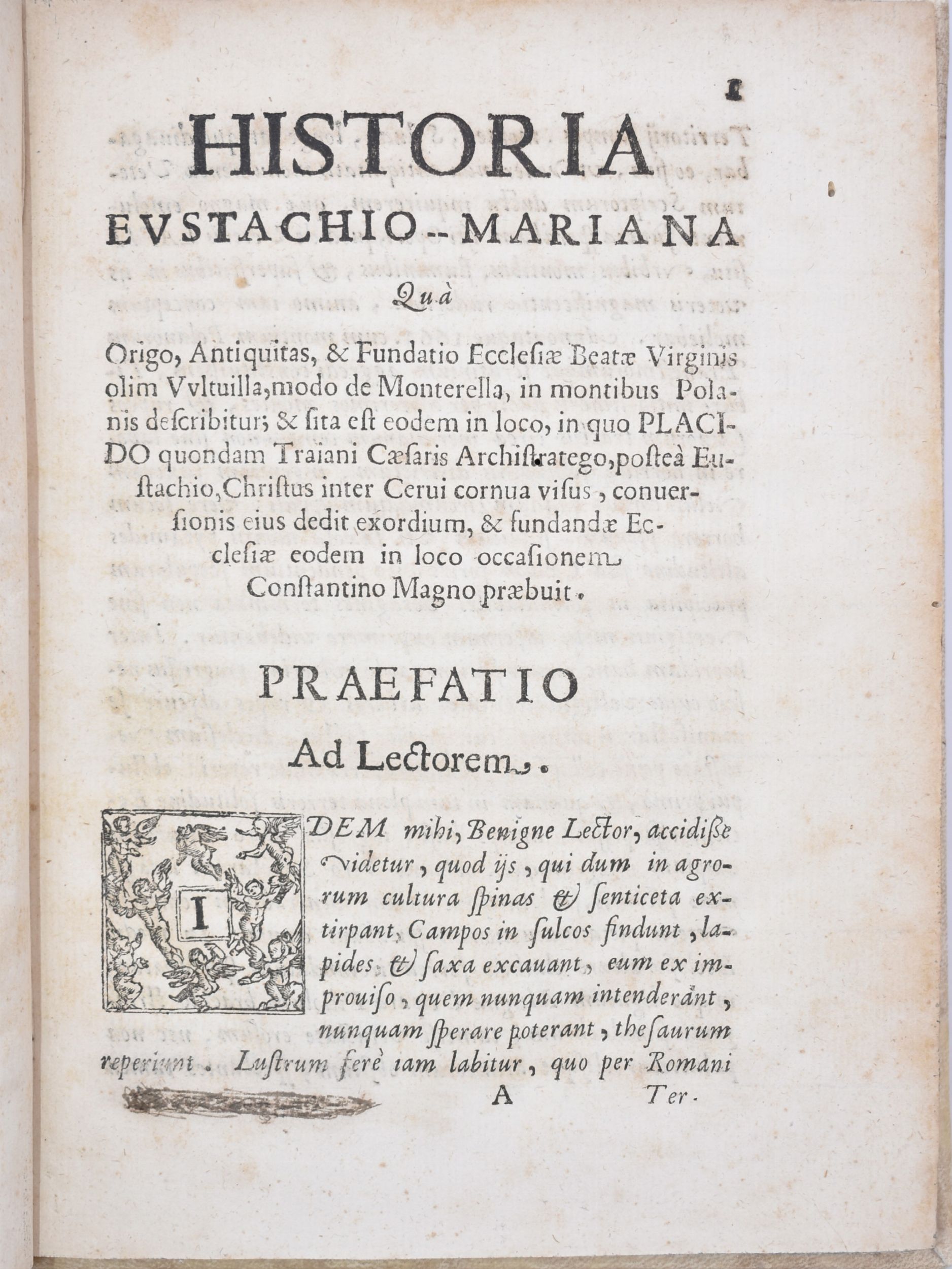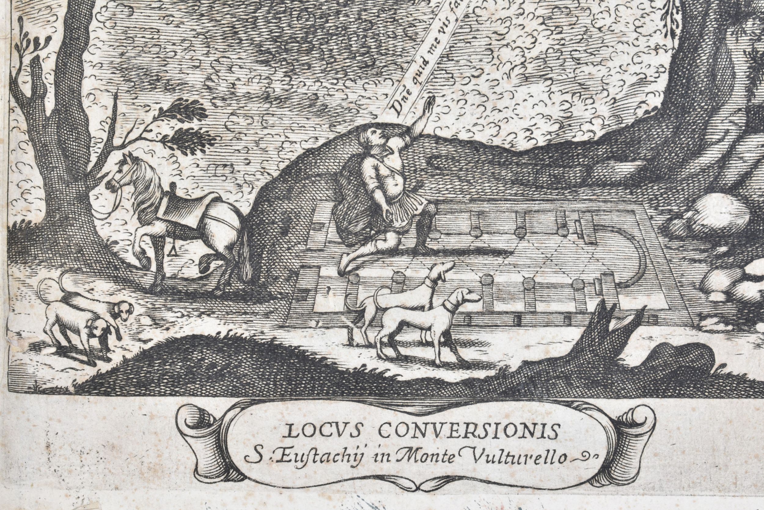 Seicentina figurata con la rara edizione originale del trattato kircheriano sul casuale ritrovamento a Mentorella, nei pressi di Tivoli (RM), di un antico santuario dedicato alla Vergine Maria laddove sarebbe avvenuta la conversione cristiana di S. Eustachio martire. Opera corredata con diverse incisioni nel testo anche a pagina intera, e 7 tavole ripiegate raffiguranti vedute, prospetti e piante del santuario mariano, la Croce argentea donata da Costantino, una mappa a volo d'uccello che va dai castelli romani a Subiaco, e altro ancora; con antiporta calc. raffigurante la miracolosa conversione di S. Eustachio davanti al cervo inviato da Cristo, una vignetta al front. con Maria che tiene in braccio Gesù bambino, testatine e finalini xil. con iniziali finemente incise. Lievi segni del tempo come fioriture sparse, rari segni in china e piccoli forellini di tarlo alle carte preliminari.