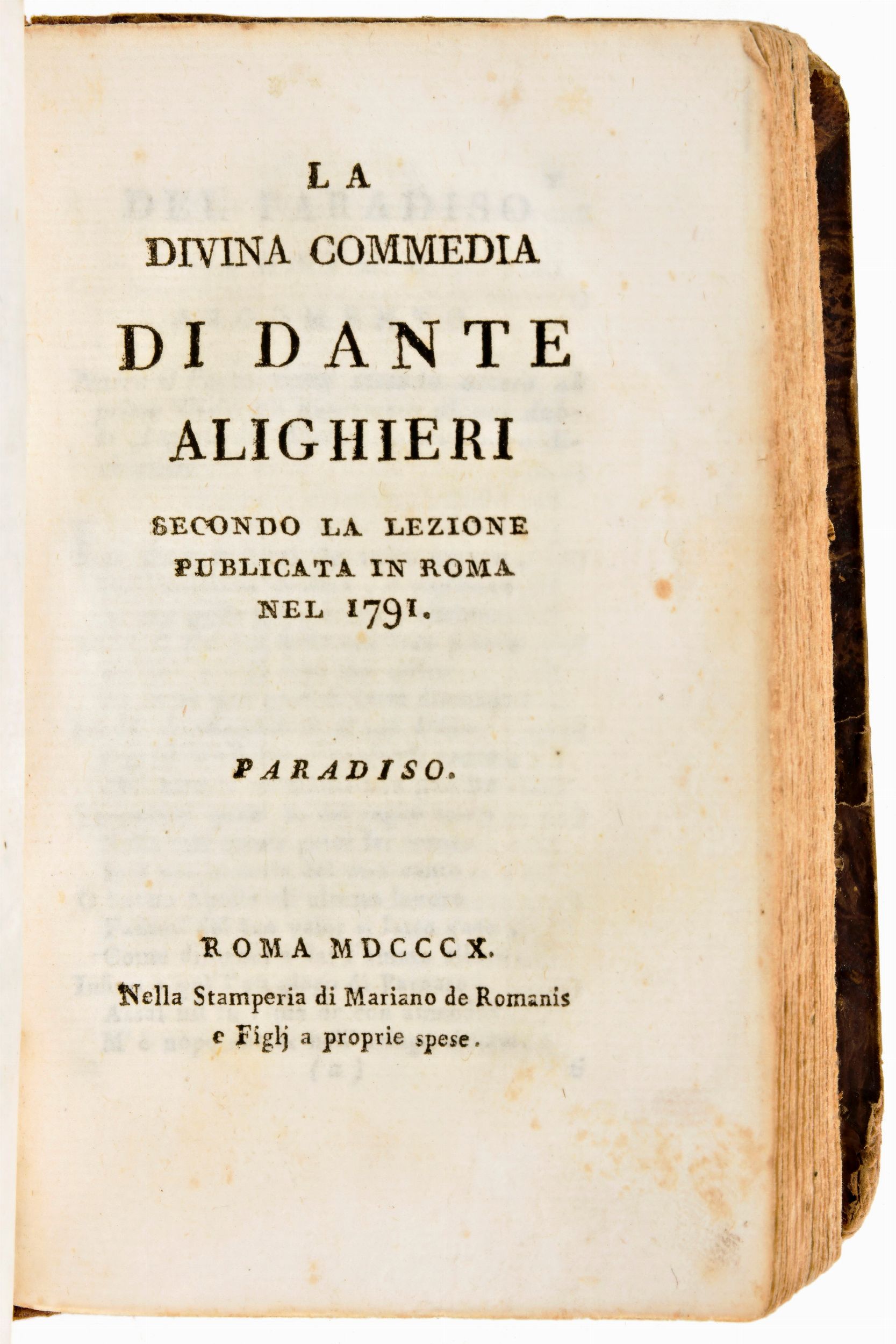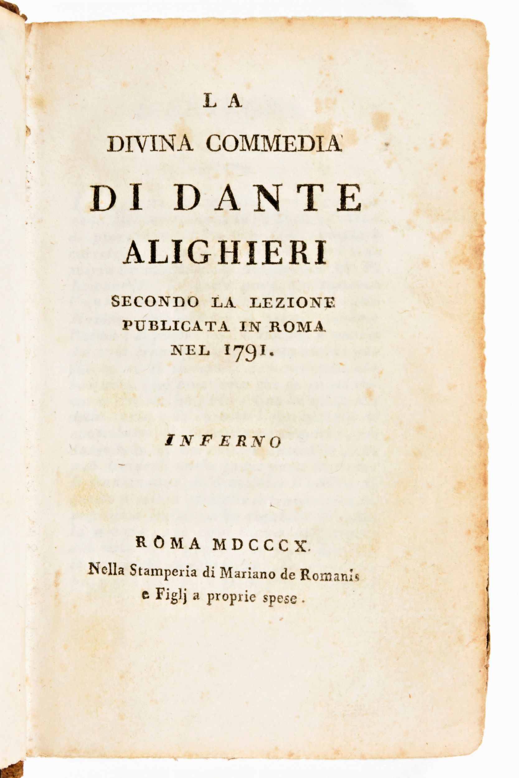 Formato in-12°, mm. 135x85, pp. (4), xii, 210 + 1 ritratto all'antiporta / (2), 206, / (2), 204. Completo. Rilegatura coeva in mezza pelle con titoli e fregi in oro al dorso. Disegni e note in china antica alle carte di guardia. Carte in ottime condizioni con lievi fioriture. Testo nitido. Antica edizione impressa in Roma il 1810 per Mariano De Romanis, 3 front. conservati (Inferno, Purgatorio, Paradiso). Con 1 ritratto di Dante Alighieri all'antiporta. Edizione tratta della versione del 1791 di Bonaventura Lombardi. Con una biografia di Dante di Pierantonio Serassi (1721-1791).