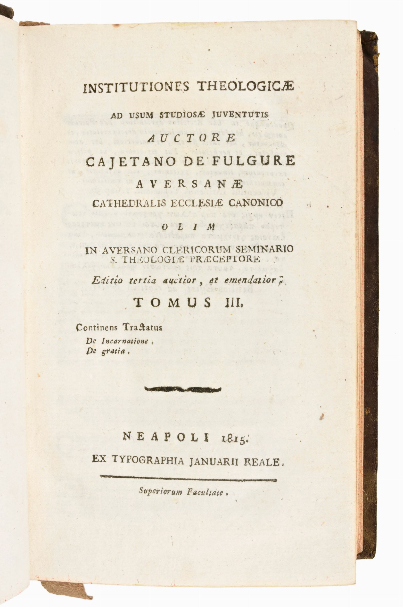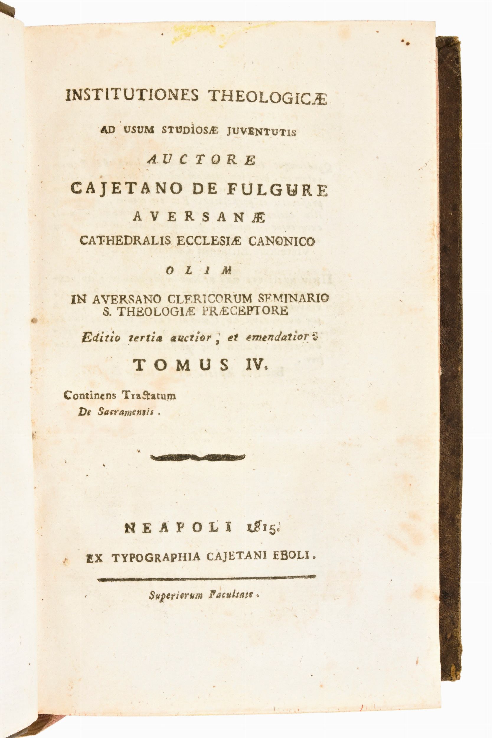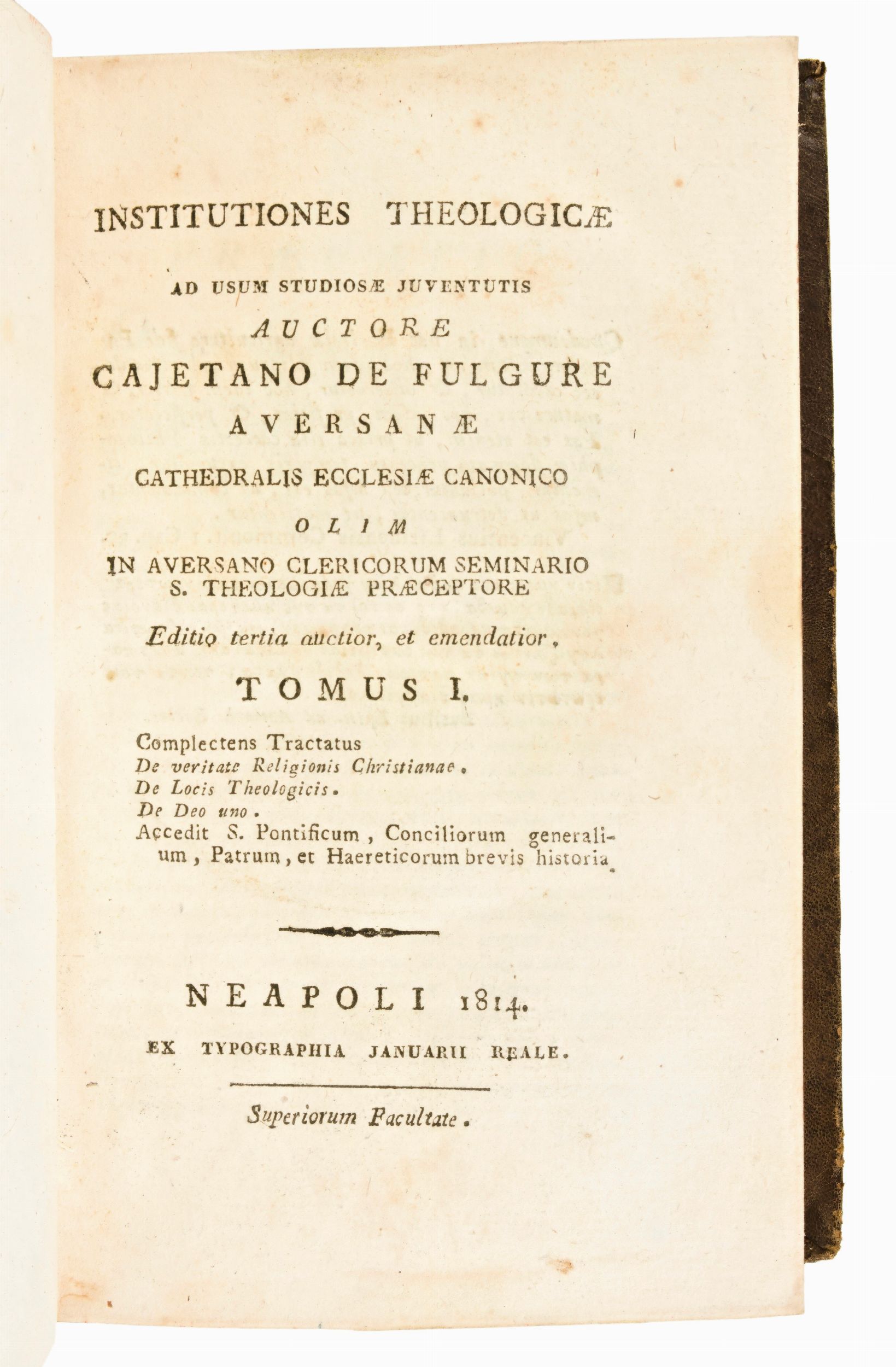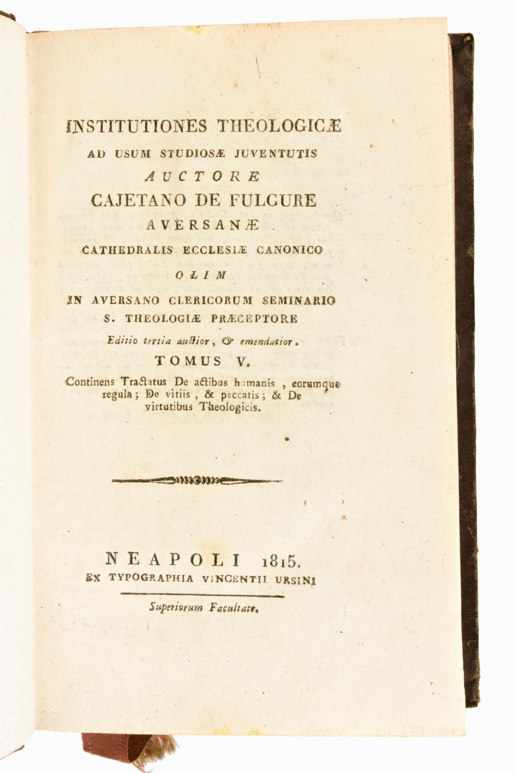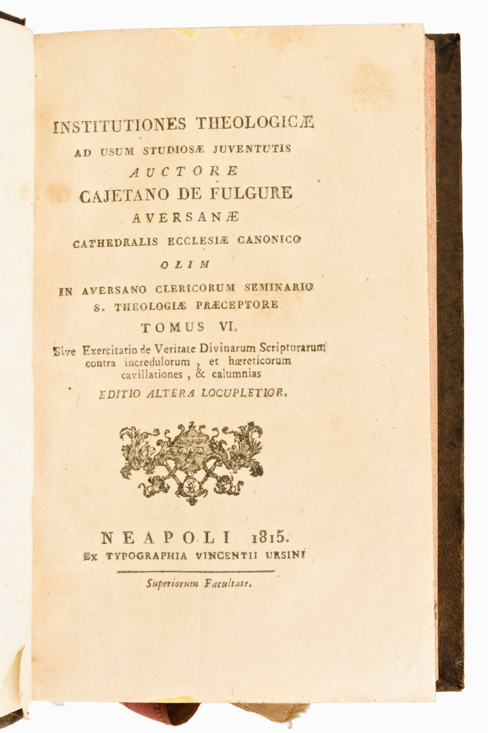 Set di 6 eleganti legature alle armi (XIX sec.), in piena pelle con decorazioni e stemma cardinalizio impresso in oro ai piatti, titoli e fregi in oro su tassello al dorso. Tagli a spruzzo. Risguardi in antica carta decorativa blu. In-8, mm. 195x130, pp. XVI, 540 / 395, (3) / 586 / 531, (5) / 512 / 290, (2). Testo completo. In ottimo stato di conservazione, con lievi fioriture alle carte. Antica edizione impressa in Napoli tra il 1814 e il 1815 da vari tipografi/editori ( V. Orsini, G. Eboli & G. Reale), completa in 6 volumi. Istituzioni teologiche ad uso didattico, opera del teologo italiano Gaetano De Folgore (1759-1841).