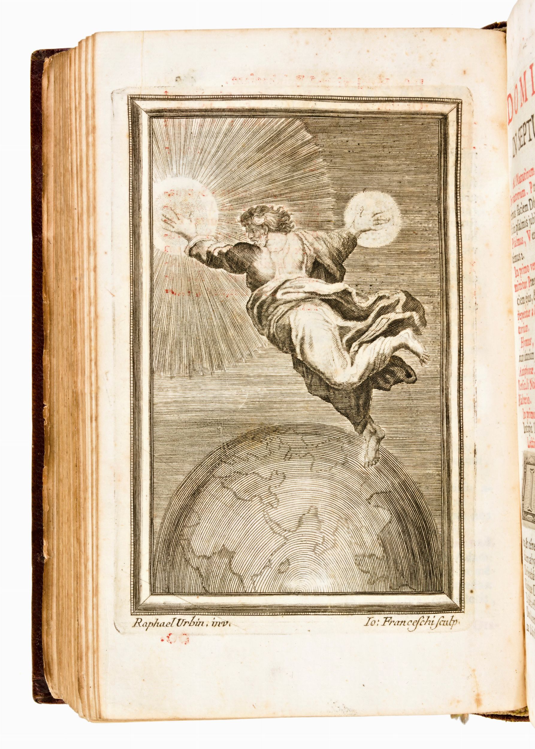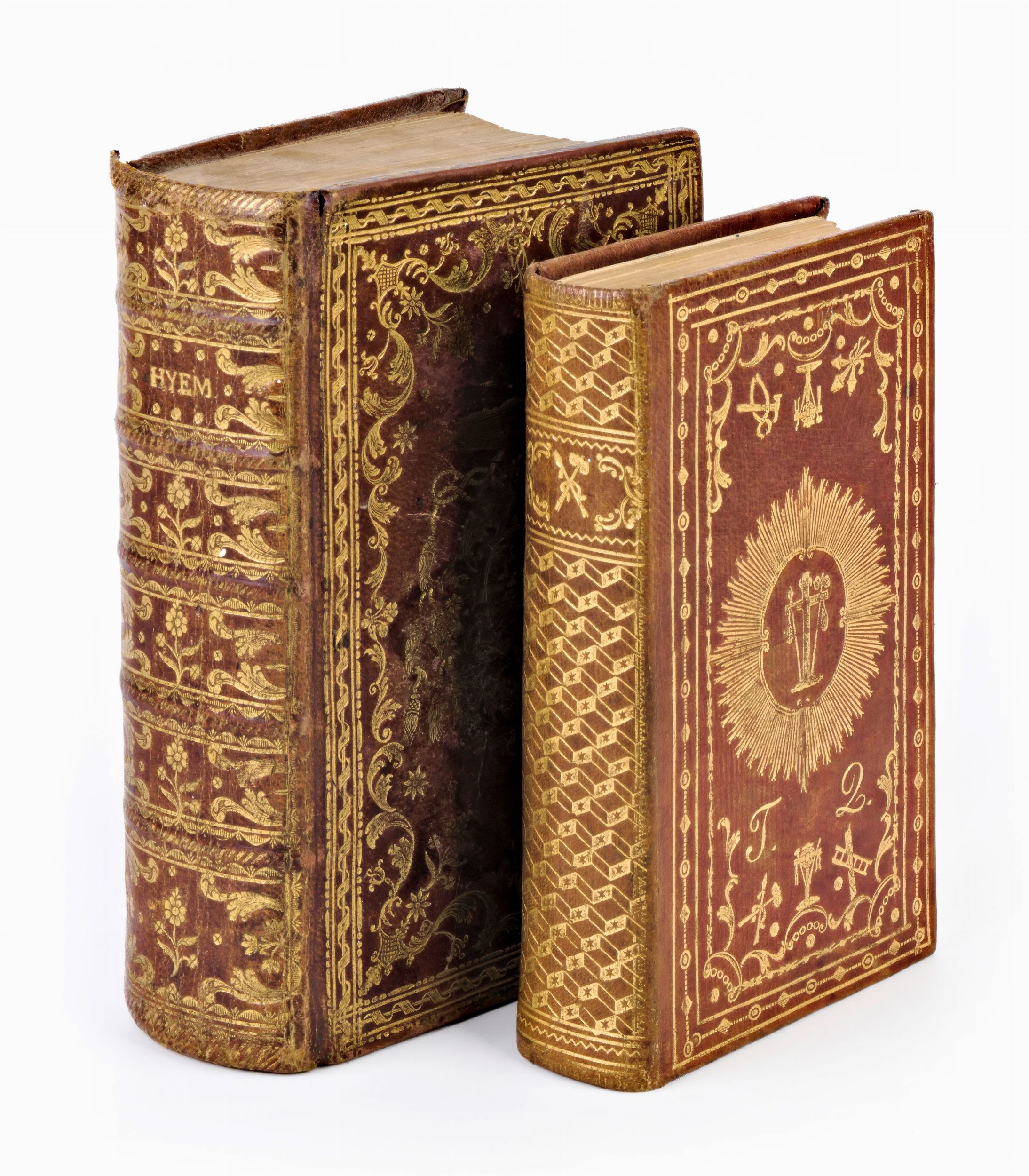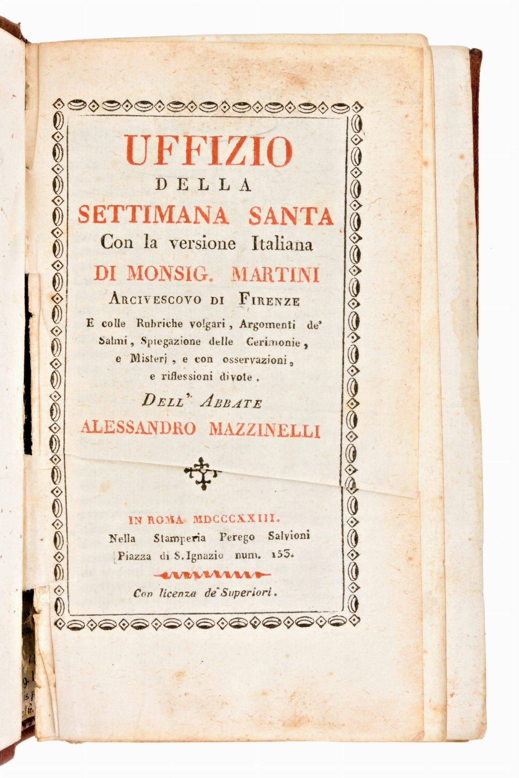 Set di 2 eleganti legature alle armi (del XIX sec.), in piena pelle marocchina con splendide decorazioni e stemmi cardinalizi impressi in oro ai piatti. Tagli delle carte in oro. Risguardi in carta antica decorativa. Contiene : - Breviarium Romanum cum Psalterio proprio, & Officiis Sanctorum. Ad usum cleri Basilicae Vaticanae Clementis 10. Auctoritate editum. Pars hiemalis (solo il Volume 1 di 4, Parte Invernale). Urbini, Ex Typographia Ven. Capellae SSmi Sacramenti : apud Hieronymum Mainardi, il 1740. In-8, mm. 185x125, pp. (40), 764, ccxliv. Completo. Testo nitido, stampato in rosso e nero su due colonne, con alcune figure in calcografia fuori testo. Piccolo difetto alla cuffia, lievi spellature ai piatti e al dorso. Minimi segni del tempo. Frontespizio in rosso e nero con stemma papale inciso in calcografia. - Uffizio della settimana santa con la versione italiana di Monsi. Martini... E colle rubriche volgari, Argomenti de' Salmi ... dell'abate Alessandro Mazzinelli Roma, Perego Salvioni, 1823. In-12°, mm. 170x110, pp. (2), XII, 594, 1 c. di tav. Mancante dell'ultima carta Bb10. Cerniera anteriore distaccata, con le prime 8 carte parzialmente distaccate. Macchie d'inchiostro blu nel testo alle carte I2, I3 e al verso della c. Aa12 (piccola macchia al taglio). Frontespizio stampato in rosso e nero. Testo disposto su due colonne con la versione in latino e italiano a fronte. 1 Tavola calcografica rappresentante l'ingresso di Gesu in Gerusalemme di Antonio Nessi e Alessio Giardoni.