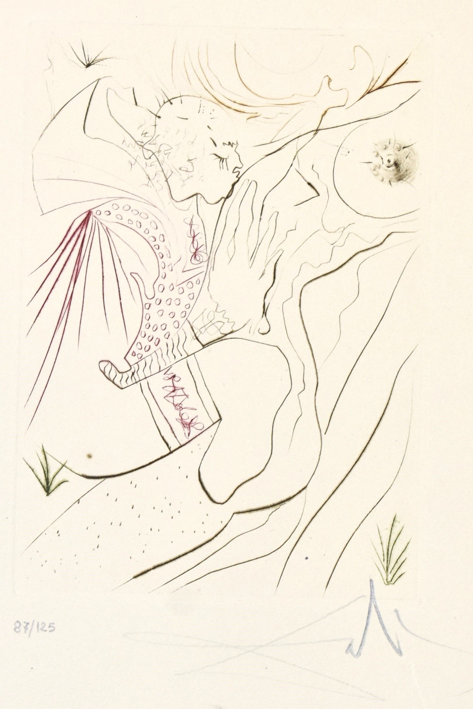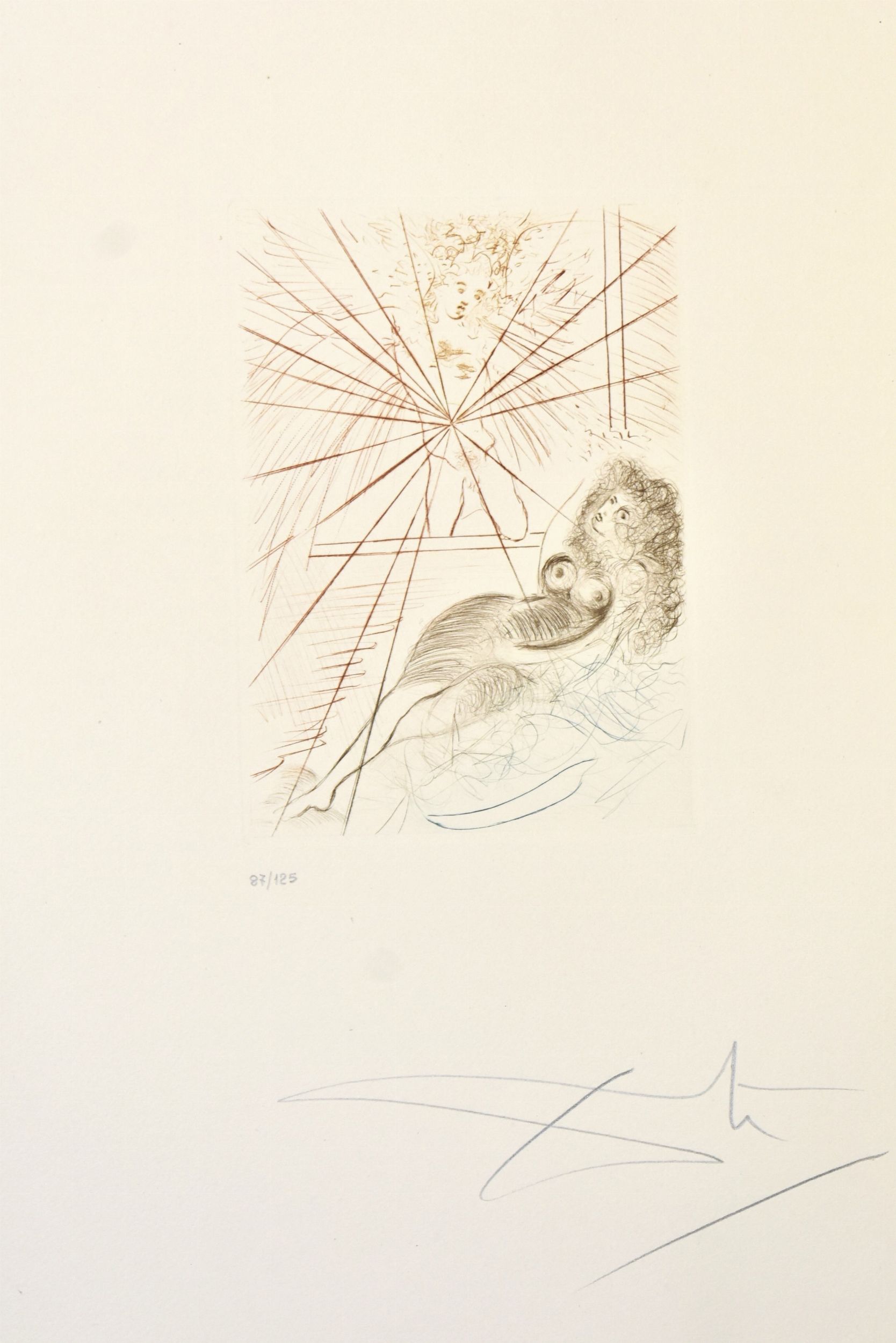 Custodia editoriale ad astuccio in tela rossa con titoli in argento al dorso (mm. 470x335) Contiene cartella editoriale flessibile che racchiude il testo a fogli sciolti, composto da 34 quaderni con carte sciolte. Pp. 136, (4). Edizione a tiratura limitata di 150 esemplari numerati, copia n. 87 (su carta Moulin Richard de Bes) Testo italiano. 10 incisioni originali a colori alla punta secca di Salvador Dalì, firmate e numerate dall'artista, accompagnate con una velina protettiva in plastica. Splendida raccolta di incisioni originali a colori di stile surrealista incise su rame dall'artista stesso col rubino e il diamante, ispirandosi al capolavoro di Giovanni Boccaccio.