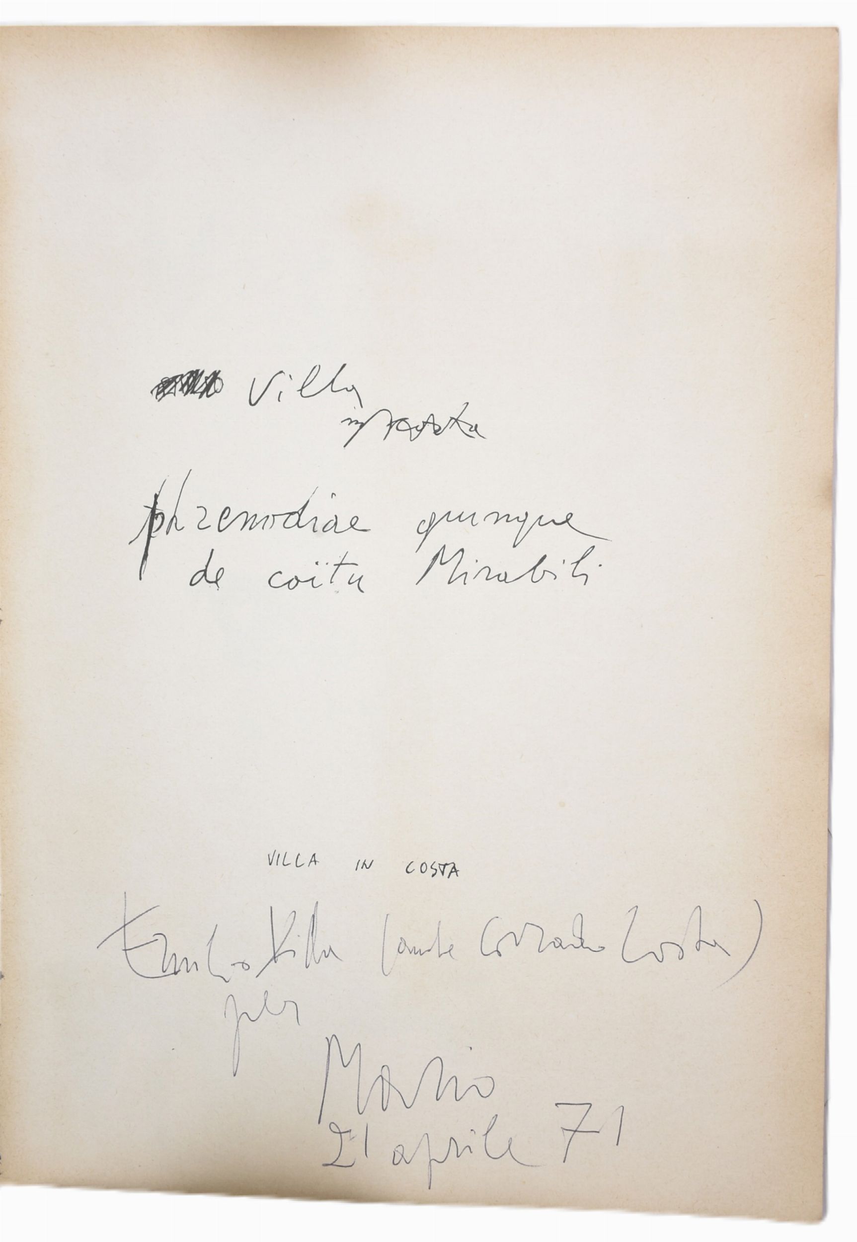 Esemplare con dedica autografa originale dell'artista Emilio Villa datata 1971 alla prima carta bianca. Brossura editoriale, in-4°, cm. 34x24, pp. (62) non num. Scoloritura al piatto anteriore. Lievi segni del tempo. Libro d artista composto da due serie tipologiche di lavori, moltiplicate per i due autori e mescolate tra loro nel volume: componimenti sia di Villa sia di Costa riprodotti e manuscriptu (parolibere, formule, testi asemantici); tavole con numerosi disegni figurativi di Costa, nel tipico stile; tavole con disegni astratti di Villa, caratterizzate dal grosso tratto nero (due delle quali sono stampate anche sui piatti della copertina); i testi 'e manuscripto' sono stampati su carta uso mano di normale grammatura; le tavole invece su carta pesante.