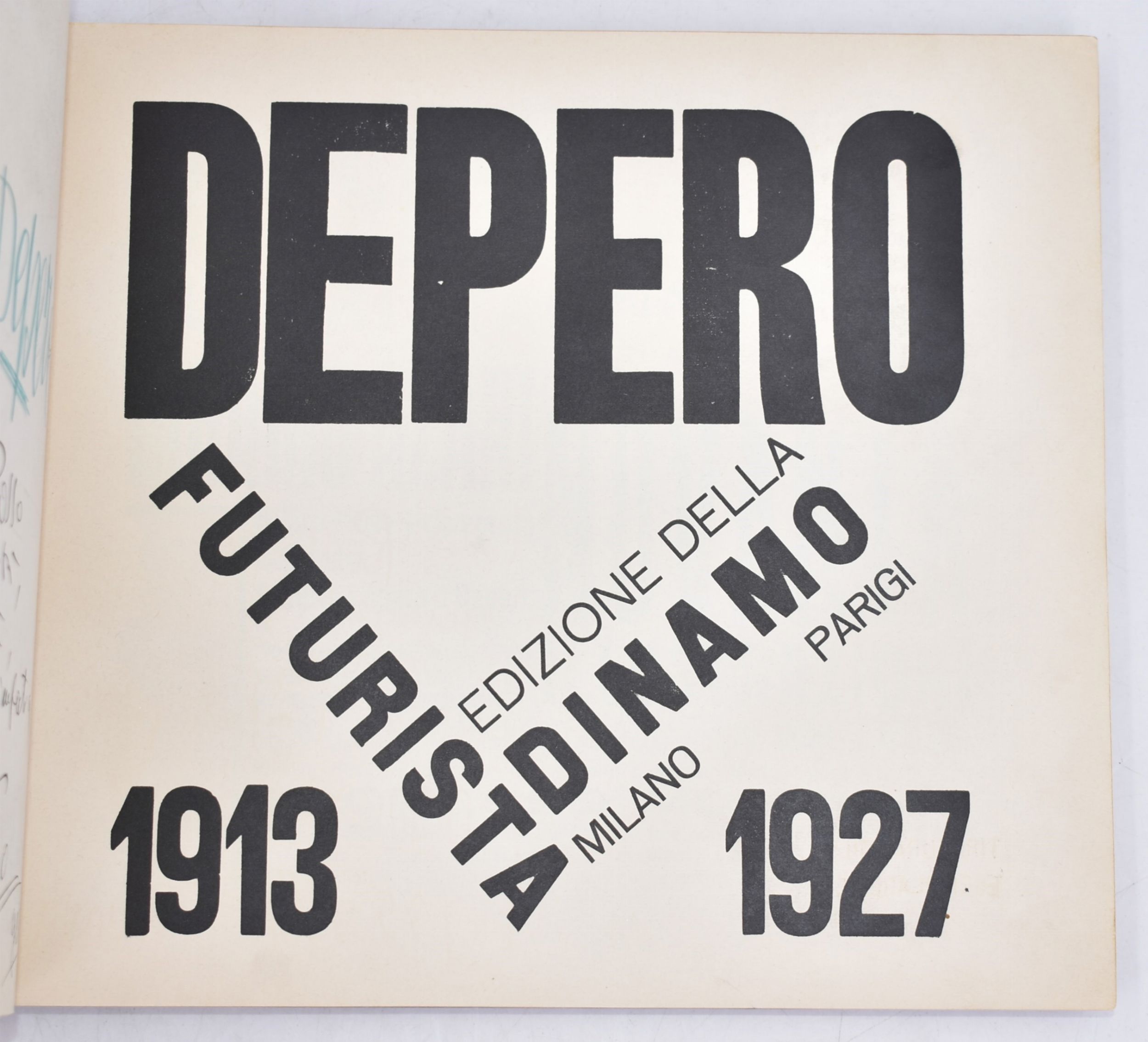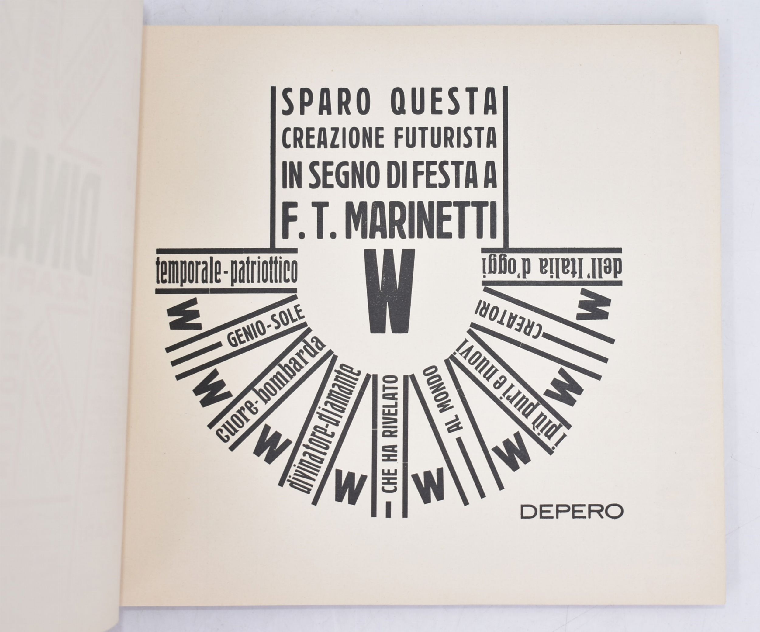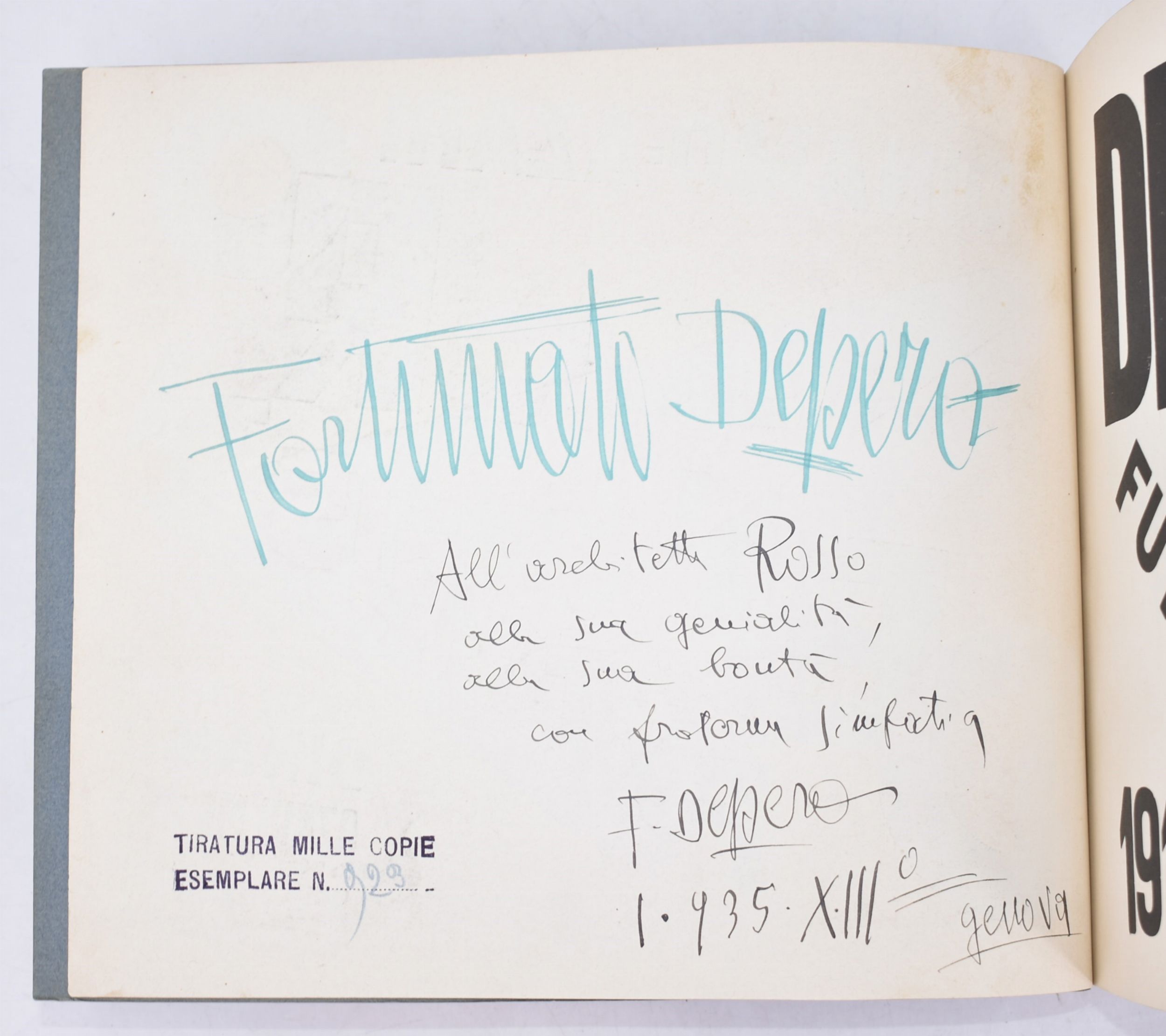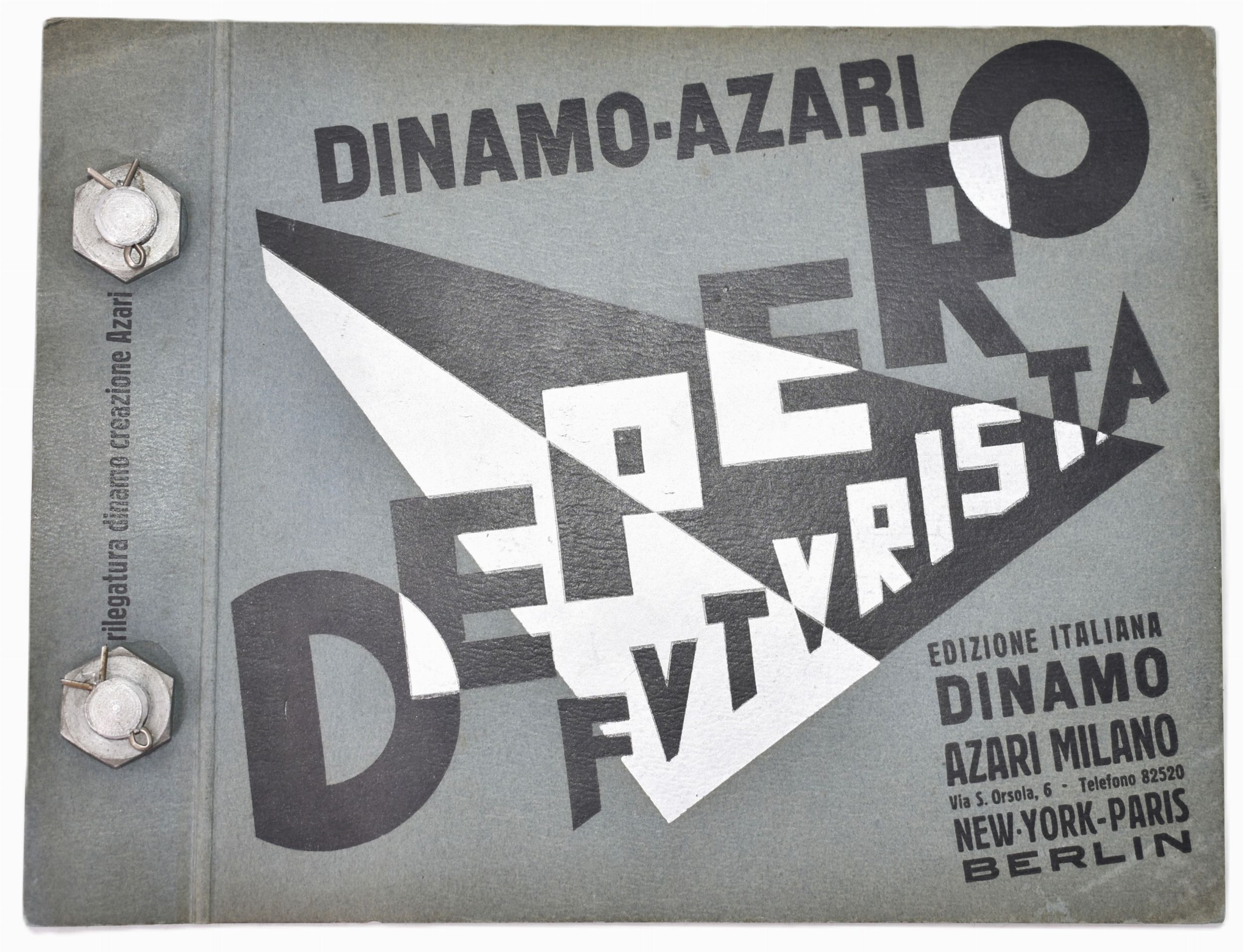 Tiratura limitata di 1000 copie numerate, questo è l'esemplare n. 923. Con grande firma autografa in verde di Fortunato Depero al verso dell'antiporta, sotto una dedica con altra firma autografa di Depero datata 1935-XIII. Oblungo, cm. 24,5x32. Cartone editoriale, con due bulloni metallici fissati da copiglie. Copertina e grafica dell'Autore. Pagine 234 non numerate + 4 fogli di carta velina + 2 fogli di guardia. Alcuni fogli sono in cartoncino colorato, moltissimi disegni e bozzetti al tratto, alcune bicromie; una tavola ripiegata; 44 riproduzioni fotografiche di cui 2 a colori. Splendida copia, in ottimo stato di conservazione. 'Capolavoro d'applicazione della 'deformazione' tipografica 'paroliberista' (Futurismo & Futurismi). 'Policromo, libero ed ardito, il libro bullonato, così chiamato dall'idea del suo editore Fedele Azari di imbullonare la copertina, è il manifesto dell'epoca delle macchine e della loro influenza sul movimento futurista'. Salaris, Bibliografia del Futurismo, 35; Andel, Avant-Garde Page Design, 112: “La glorification de la machine et de la technologie inspire aussi les futuristes quand ils recourent à des matériaux industriels […] qui donnent à sentir de manière tactile les caractéristiques de l'impression”; Jentsch, The Artist and the book in Twentieth- Century Italy, 177: “One of the avant-garde masterpieces in the history of the book-object”.