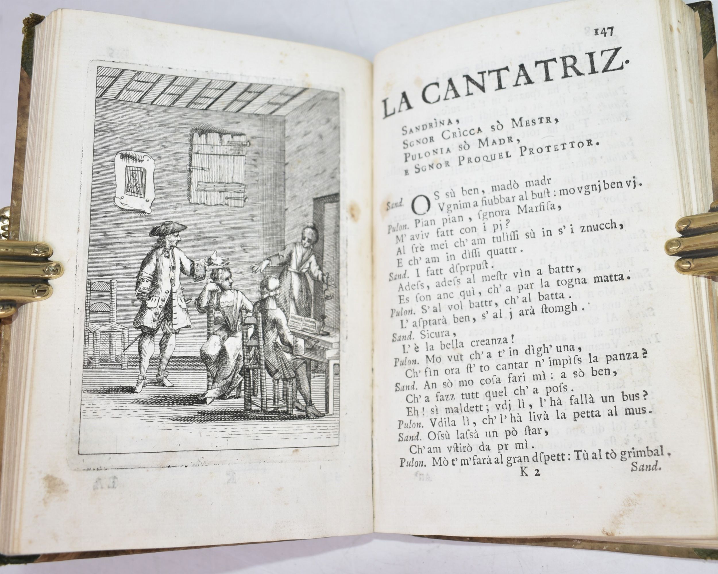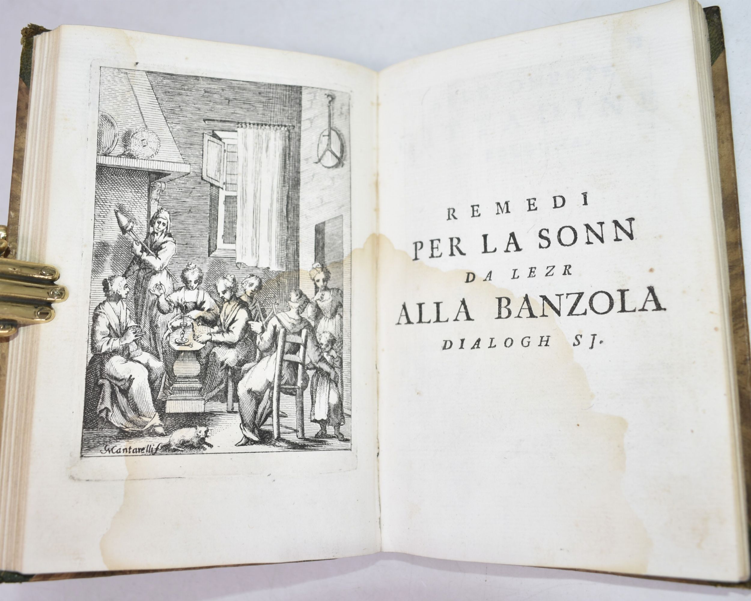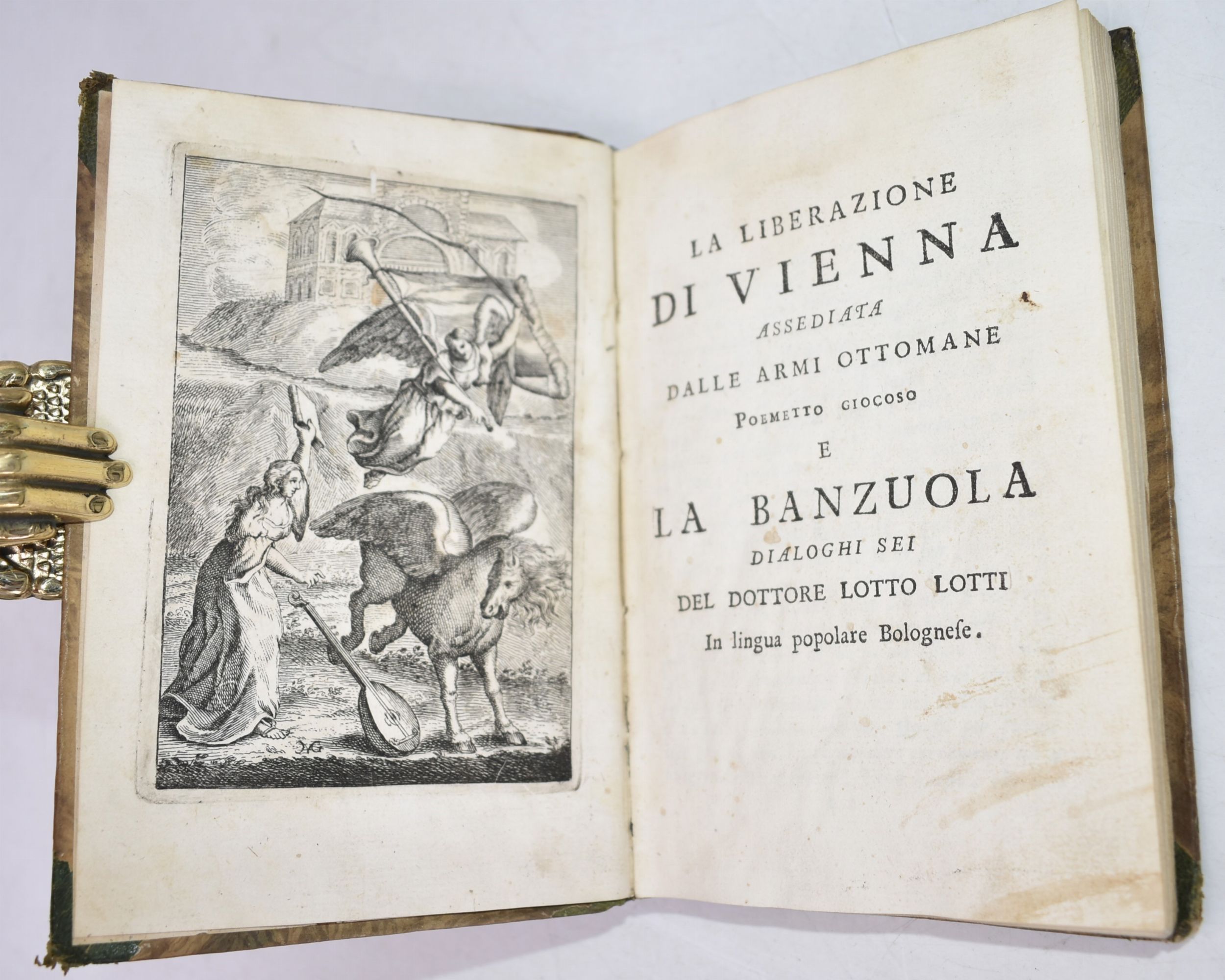 1 vol., in 8°, cm 17,5x12, p. [8], 248 p. + 1 tav. ill. Legatura antica in mezza pelle con angoli, dorso con titoli e raffinati fregi in oro. Poema figurato Settecentesco in dialetto bolognese, edizione priva di dati tipografici ma metà del XVIII secolo. Con una bella antiporta allegorica e 11 tavole ill. finemente incise nel testo. Completo, con una macchia alle carte.