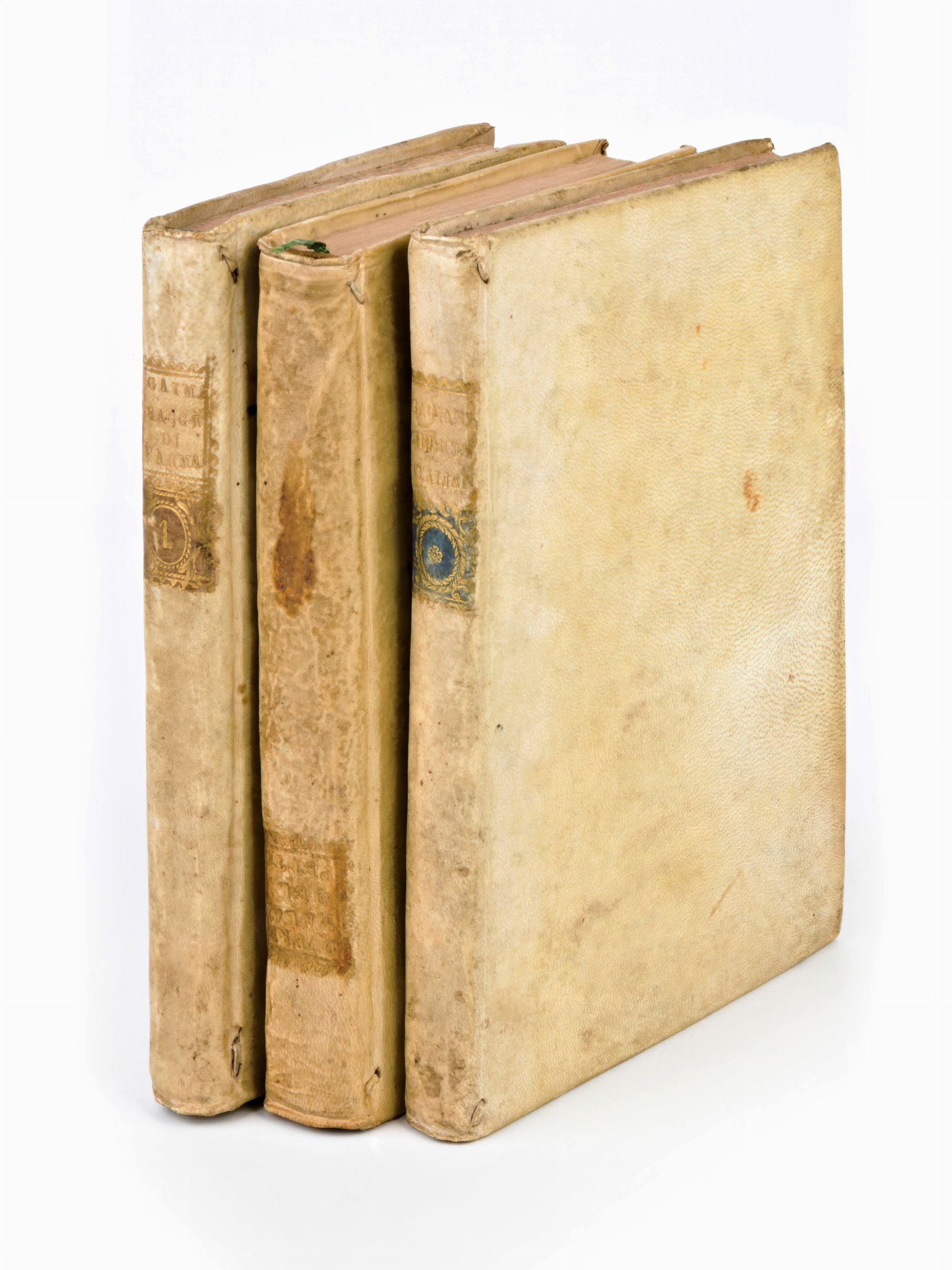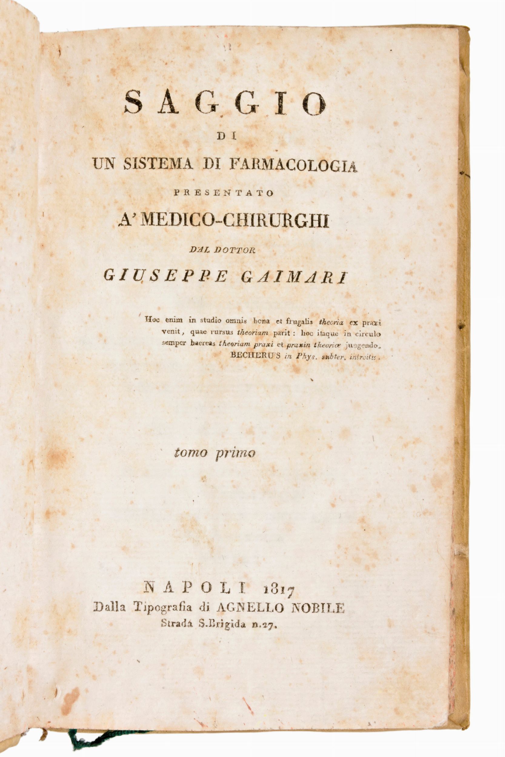 - DE LISLE, DUPRÈ : TRATTATO DELLE MALATTIE DEL PETTO,.. NAPOLI, PRESSO GIUSEPPE MARIA PORCELLI, 1778. In-8°, mm. 185x115, pp. XVI, 248. Completo. Legatura coeva in piena pergamena antica con titoli in oro al dorso. Ottimo esemplare con lievi fioriture alle carte, piccolo foro alle carte di sguardia e alle cc. a1 (Front.) e a2. Prima edizione italiana del 1778 impressa in Napoli per Giuseppe Maria Porcelli, traduzione dal francese a cura di Gaetano Grimaldi. - GAIMARI, GIUSEPPE : SAGGIO DI UN SISTEMA DI FARMACOLOGIA …NAPOLI 1817. In-8°, mm. 185x120, pp. (4), 201, (3). Solo la prima parte di 3. Legatura coeva in piena pergamena con titoli in oro al dorso. Tagli delle cc. a spruzzo. Carte in buone/ottime condizioni generali con lievi fioriture e piccole macchie n.t. Opera del medico italiano Giuseppe Antonio Gaimari (1779-1839). Medico mi-litare, insegnò medicina privatamente e all'Università di Napoli. - Guani, Giovanni Battista : Idee su la novella dottrina medica italiana messa in confronto con quella del dot-tore Brown… Napoli : per i Tipi di Zambraia, 1822. Formato in-8°, pp. 232. Legatura coeva in piena pergamena con titoli e fregi in oro al dorso. Tagli delle cc. a spruzzo. Ottimo esemplare, con lievi fioriture e piccole macchie ai margini del testo. Antica edi-zione impressa in Napoli il 1822 con doppio frontespizio. Epistolari con le osservazioni dei medici Gio-vanni Battista Guani (1788-1859) e Giuseppe Gaimari (1779-1839) sulla Nuova Dottrina Medica Italiana messa a confronto con la teoria dell'eccitabilità del medico scozzese John Brown (1735-1788).