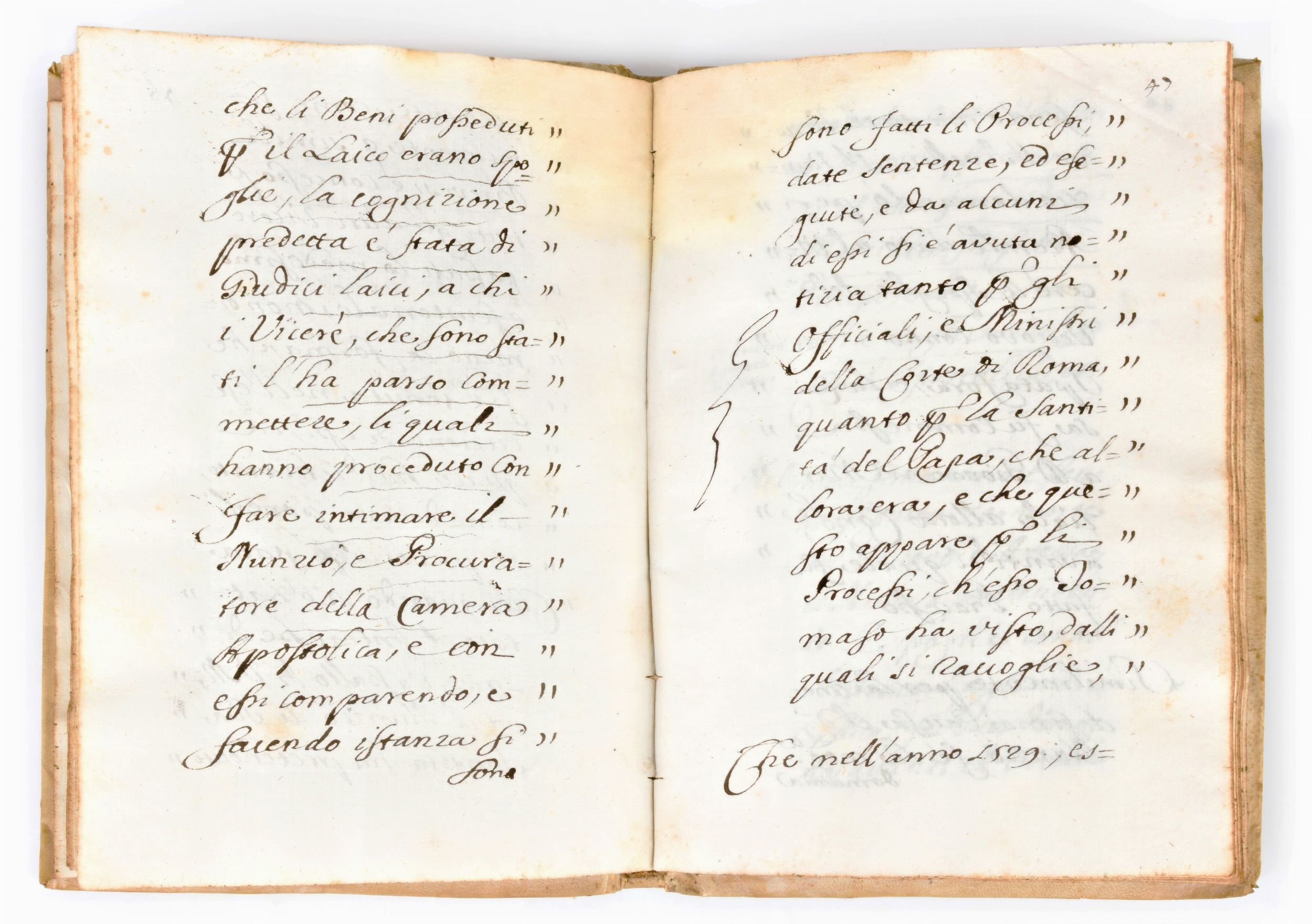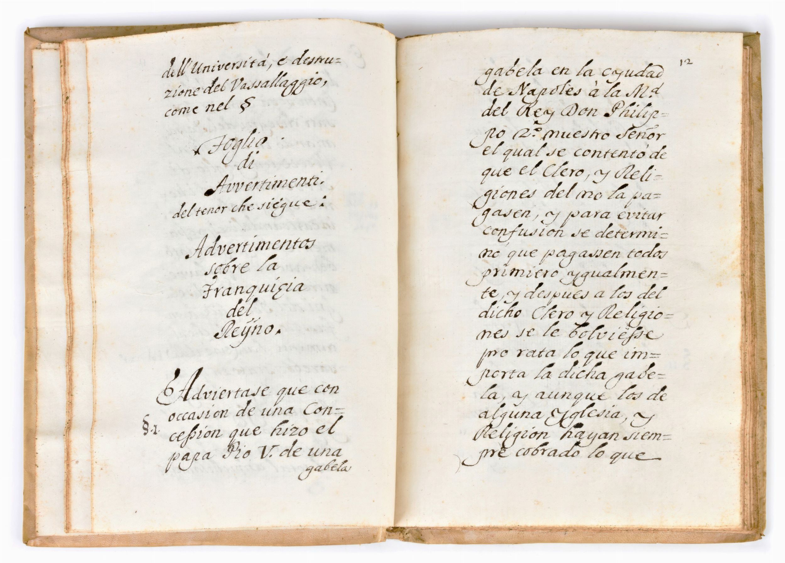 In-8°, mm. 225x160, carte 65 (numerazione manoscritta). Rilegatura coeva in piena pergamena con titoli manoscritti al dorso. Leggero alone al margine superiore del testo. Lievi difetti e segni del tempo. Antico manoscritto databile circa 1750 con le notizie politiche ed economiche riguardanti la Nunziatura Apostolica a Napoli (rappresentanza diplomatica permanente della Santa Sede nel Regno di Napoli). Testo italiano & spagnolo.
