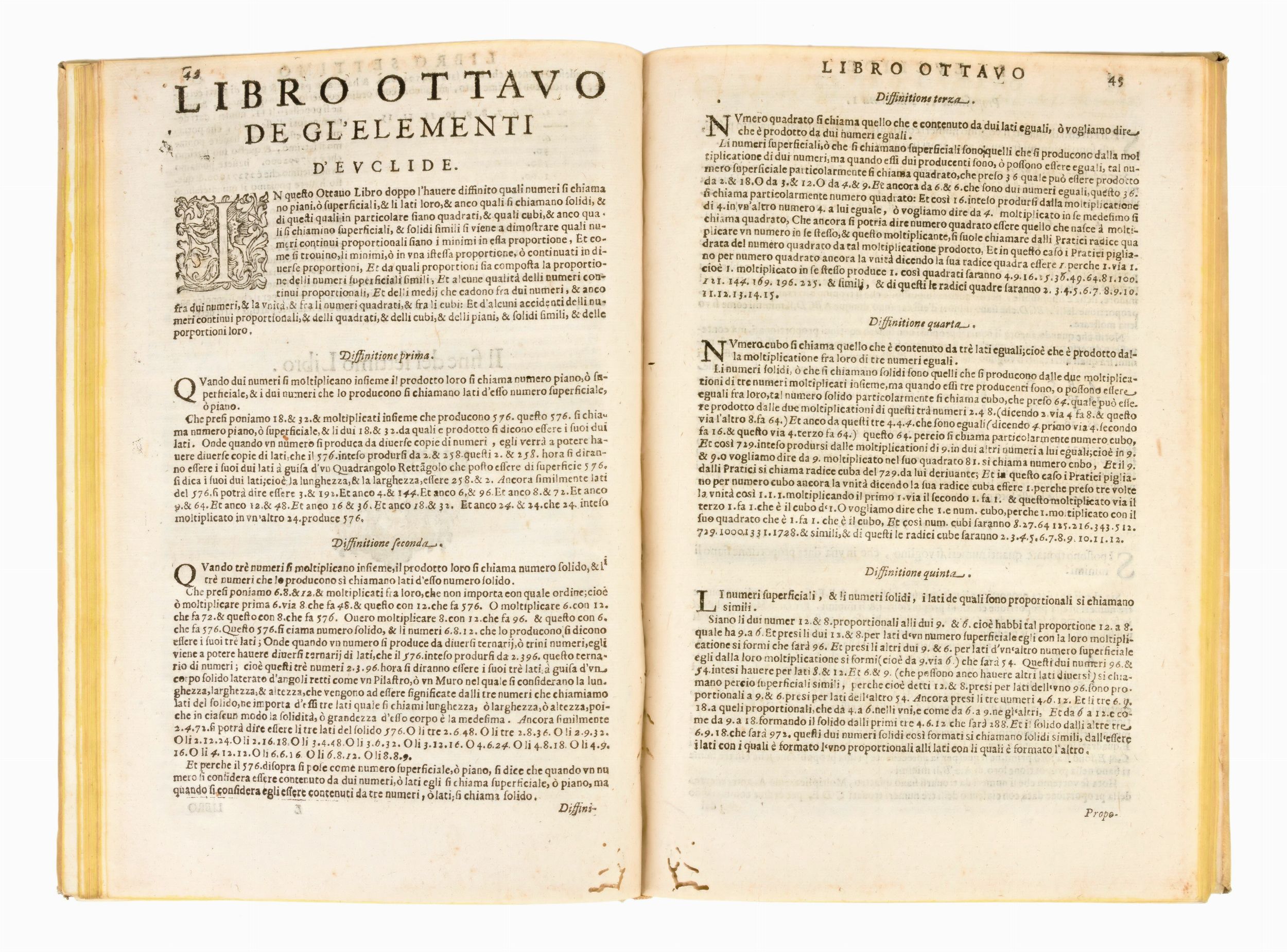 In-folio, mm. 285x200, pp. (4), 104. Completo. Rilegatura coeva in piena pergamena rigida con 4 nervature e titoli manoscritti al dorso. Tagli rifilati. Lavori di tarlo ai margini delle carte, a toccare alcune lettere e con piccola perdita di testo alla c. A2 ( le cc. A1 e A2 sono parz. distaccate). Testo nitido, italiano. Lievi fioriture alle carte. Front. stampato in rosso e nero con stemma del dedicatario, Gregorio Malvezzi.