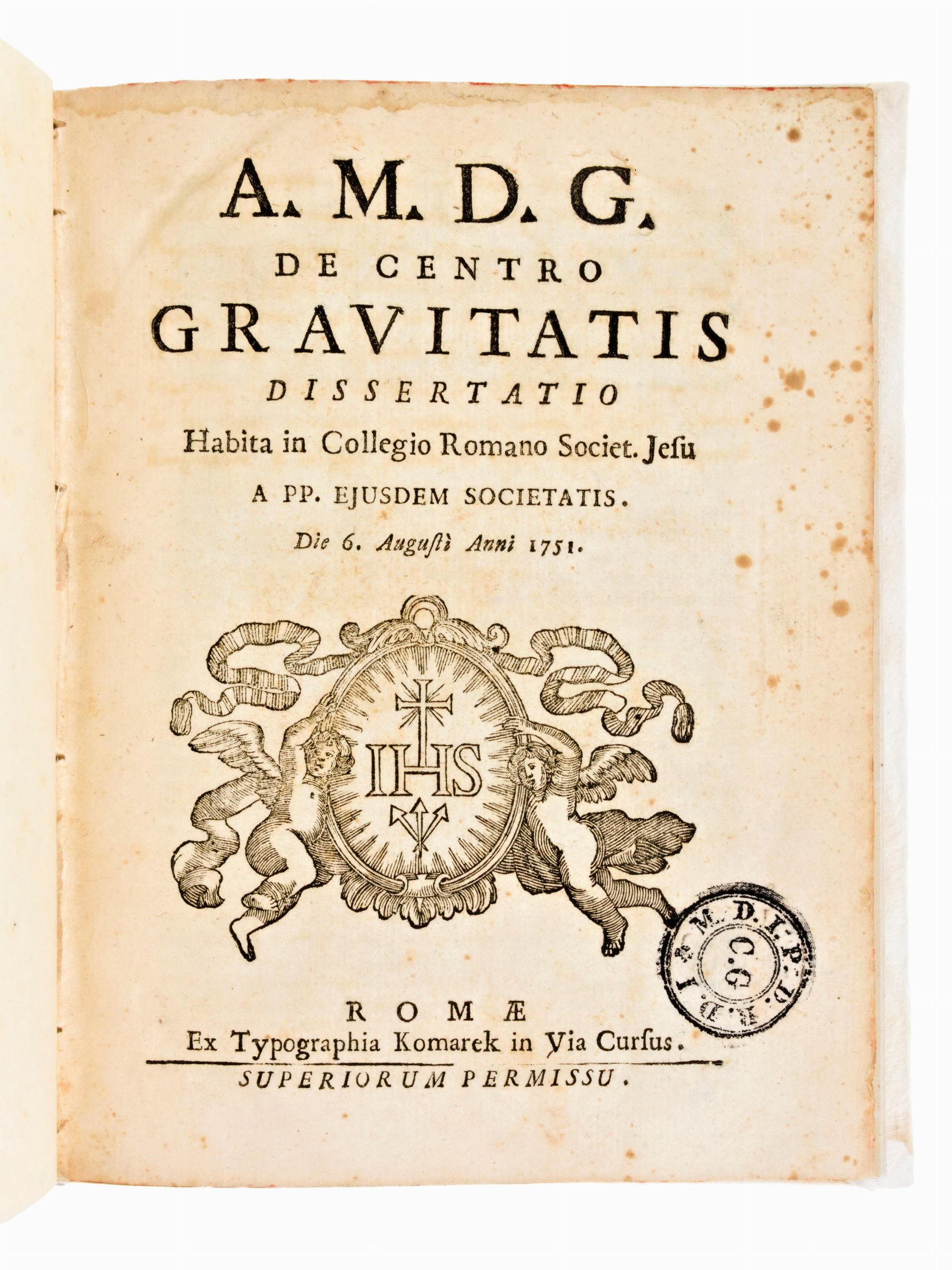 A. M. D. G. De centro gravitatis dissertatio habita in Collegio Romano Societ. Jesu PP. eiusdem societatis. Die 6. Augusti anni 1751. Roma ex typographia Komarek in via Cursus. Prima edizione del trattato sulla gravità del celebre astronomo e matematico Ruggero Giuseppe Boscovich (1711-1787). Formato in-8°, pp. 27, (1) + 1 c. di tav. ripieg. Completo. Cartonato bianco post. muto. Frontespizio con marca tipografica dei Gesuiti. Testatina e capilettera alla c. A2. In fine 1 tavola ripiegabile con figure geometriche. Boscovich in questo libro fluttua attraverso la filosofia naturale di Isaac Newton e Leibniz da un estremo e Faraday nella teoria dei campi dall'altro. l presente trattato sulla gravità fu pubblicato pochi anni dopo il suo De viribus vivis dissertatio, opera sul tema della forza vivente nella quale espone la sua prima enunciazione della legge della forza universale.