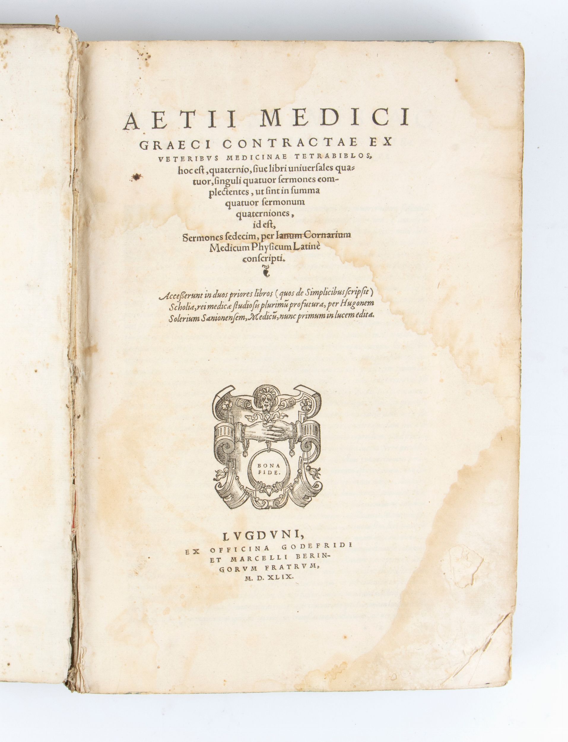 In-folio, mm. 325x225, (18 c.), pp. 1032 (num. per colonna), (c. 9). Grande volume con rilegatura coeva in piena pergamena con titoli manoscritti al dorso. Difetti e mancanze al dorso, il piatto anteriore è distaccato. Carte con leggera macchia di gora. Prime 4 carte slegate, parzialmente distaccate. Testo nitido, latino, impresso su due colonne. Lievi fioriture alle carte. Marca tipografica in xilografia al front. e al verso dell'ultima carta. Margini rifilati, tagli in blu, Aetius manoscritto in china antica al taglio laterale. Piccolo strappo al front. e all'ultima carta.