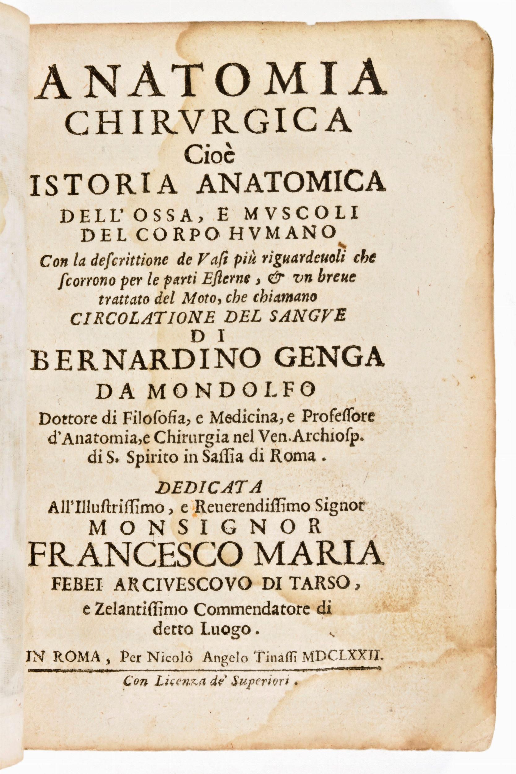 Formato in-8°, mm. 160x110, pp. (24), 455, (1) + 1 Antiporta calcografica. Completo. Rilegatura coeva in piena pergamena con titoli manoscritti al dorso. Lieve macchia di gora ai margini delle carte, esemplare mancante del risguardo posteriore, risguardo anteriore riapplicato discretamente in carta antica. Testo nitido, con lievi fioriture e bruniture alle carte. Prima edizione originale del 1672, impressa in Roma per Nicolò Angelo Tinassi, manuale di anatomia del medico e anatomista italiano Bernardino Genga (1620-1690), prima edizione di una delle prime opere dedicate interamente all'anatomia chirurgica, il Genga fu anche tra i primi a pronunziarsi a favore della circolazione del sangue, la scoperta della quale attribuì a fra Paolo Sarpi. Testo italiano. Con capilettera e finalino in xilografia n.t.