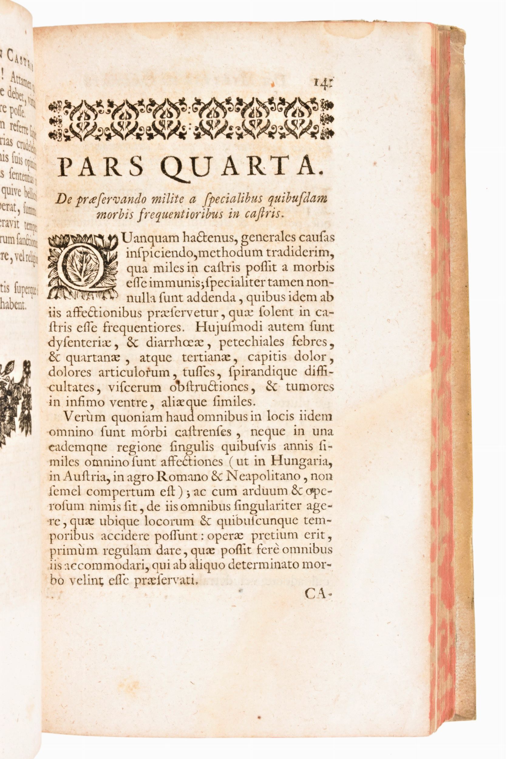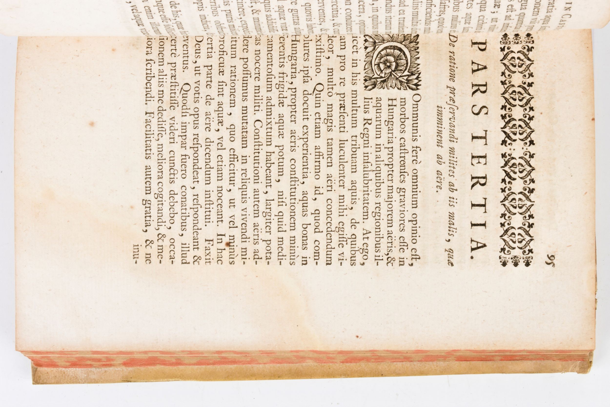 Formato in-8°, mm. 195x125, pp. (28), 195, (1), 1 c. di tav. ripieg., 105, (23). Manca l'ultima c. bianca i8. Rilegatura coeva in piena pergamena con titoli in oro al dorso. Tagli delle carte marmorizzati. Ex libris manoscritto al risguardo anteriore. Frontespizio stampato in rosso e nero con marca tipografica in calcografia. Testatina, capilettere e finalini xilografici. Seconda parte introdotta con occhiello. Testo latino. Edizione impressa in Aia (Paesi Bassi) il 1739 (la prima Vienna, 1685) per Pierre Gosse (XVIII sec.). Manuale di medicina del medico italiano Luca Antonio Porzio (1639-1723), nuova edizione corretta con l'aggiunta del trattato sopra le malattie del medico Johann Valentin Wille, curata da Johann Christoph Rieger.