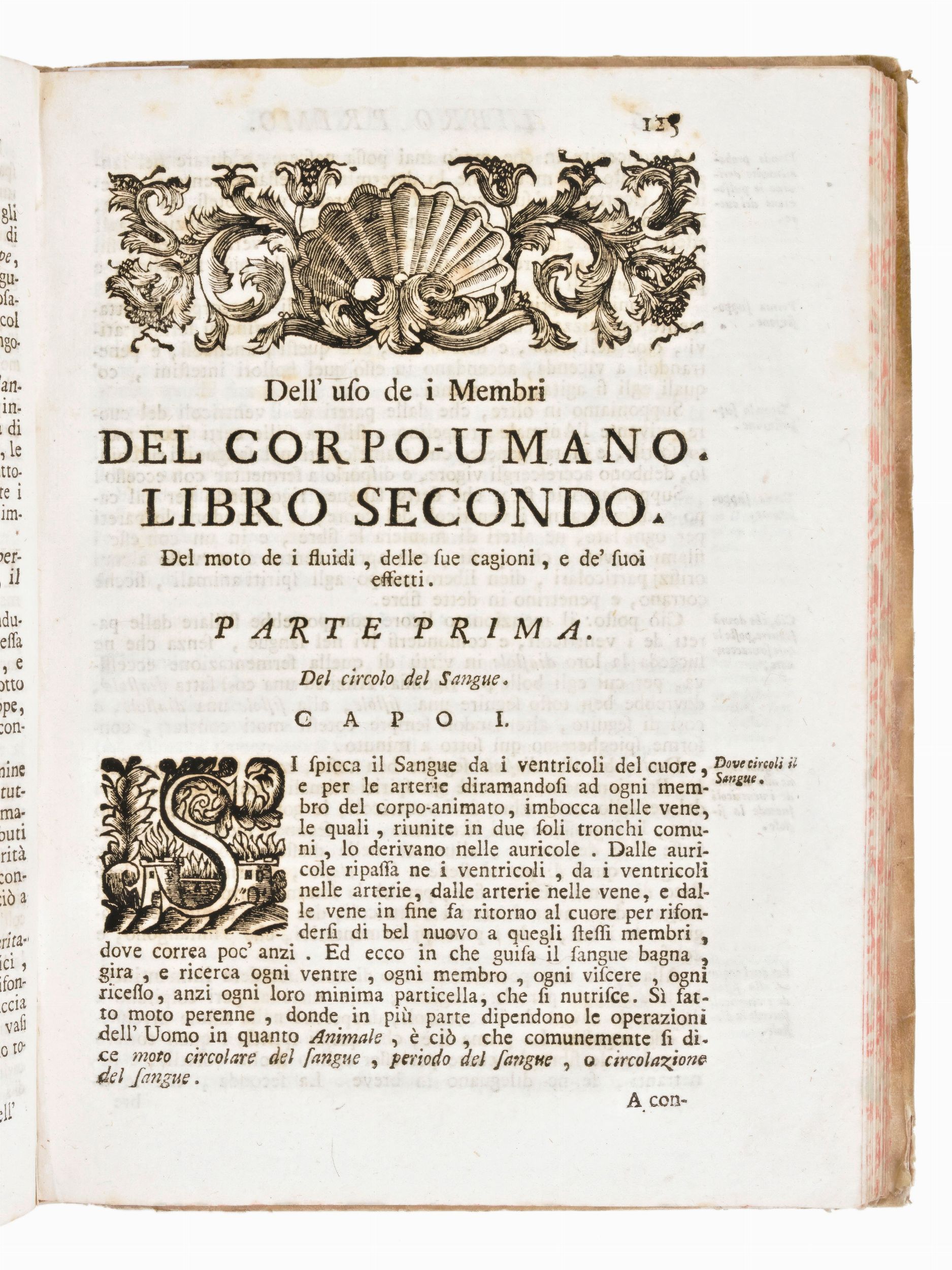 Formato in-8°, mm. 235x175, pp. (8), 255, 52, 21 cc. di tav. Completo. Rilegatura post. In piena pergamena antica con titoli in oro al dorso. Tagli delle carte a spruzzo. Frontespizio stampato in rosso e nero con vignetta xilografica, restaurato con antica carta riapplicata al verso. Capilettera, testatine e finalini in xilografia nel testo. Antiporta calcografica rilegata in fine insieme alle 20 tavole fuori testo di anatomia. Opera di Alessandro Pascoli Perugino (1669-1757), medico e anatomista, insegnò a Roma e Perugia. Teneva dimostrazioni anatomiche mediante dissezione di cadaveri, come il suo collega e concorrente Andrea Vesalio. Intrattenne una vasta corrispondenza con intellettuali di tutta Europa. Le sue opere filosofiche e scientifiche seguono i metodi di René Descartes et Nicolas Malebranche. I suoi trattati di metafisica, medicina e matematica esibiscono un pensiero coerente e metodico che dimostra la vitalità filosofica della cultura italiana del periodo. Presentato come uno dei trattati più approfonditi ed esaustivi sugli organi del corpo umano e sulle loro specifiche funzioni, pubblicato la prima volta nel 1700, riscosse un notevole successo tanto che seguirono numerose ulteriori edizioni.