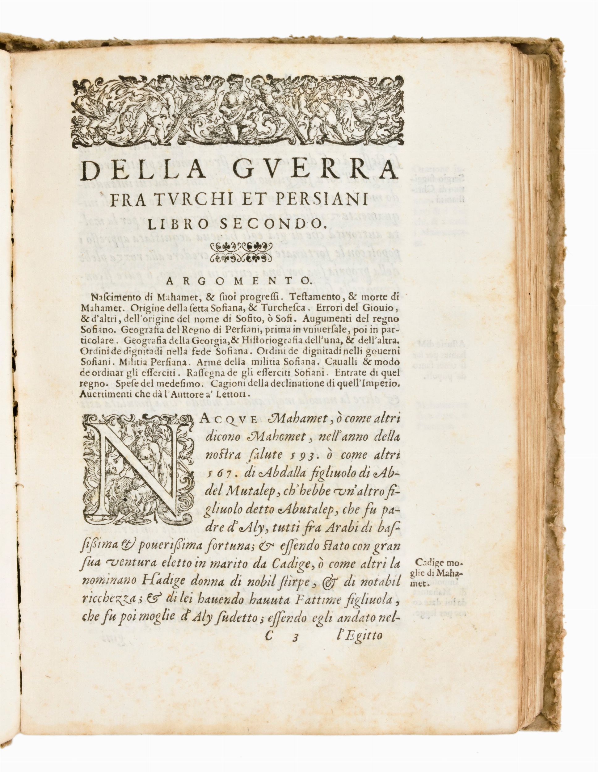 In-8°, mm. 220x170, pp. (32), 365, (41). Mancano : la tavola ripieg. con mappa e le carte Q8, R1 e Z8, . L'ultima carta Cc4 è restaurata con antica carta applicata al verso. Carta A2 con angolo inferiore tagliato. Cartonato coevo. Titoli manoscritti al dorso e al taglio inferiore. Testo italiano, corsivo romano. Legatura allentata con alcune carta parzialmente distaccate. Lievi fioriture leggere macchie in alcune carte. Testatine e capilettera xilografici n.t.
