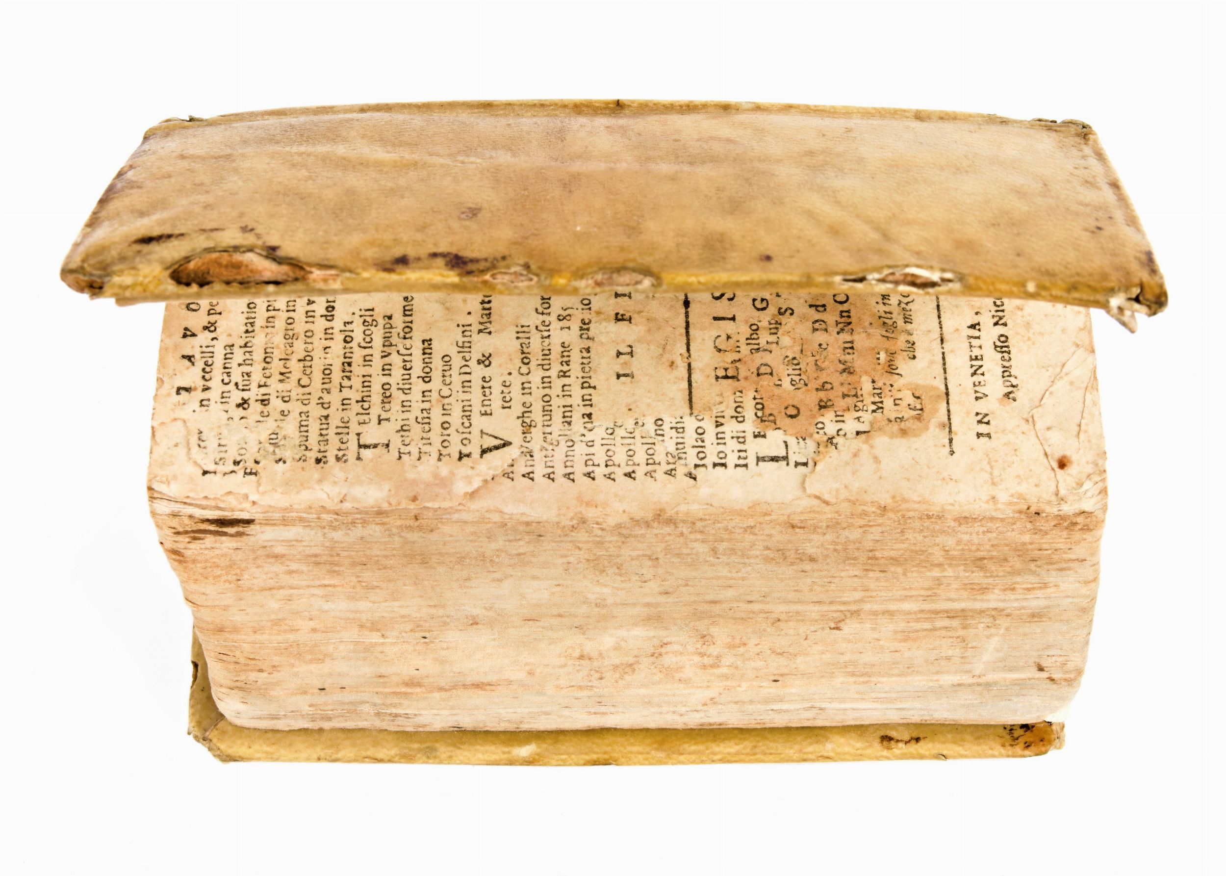 Formato in-12°, libro miniatura, mm. 110x59, pp. 486, (5). Rilegatura coeva in piena pergamena. Frontespizio restaurato con antica carta riapplicata al verso, piccole mancanze alle carte A2, e ultime 4 (cc. Ss 5-8). Cerniere parzialmente distaccate. Minimi difetti, segni del tempo e sporadiche fioriture. Antica edizione impressa il 1624 in Venezia per Niccolò Misserini, celebre poema epico-mitologico di Ovidio con la traduzione in italiano di Giovanni Andrea dell'Anguillara (1517-1572), introduzione dei capitoli del letterato Giuseppe Turchi (1515-1599). Con 15 figure in xilografia nel testo (per capitolo).