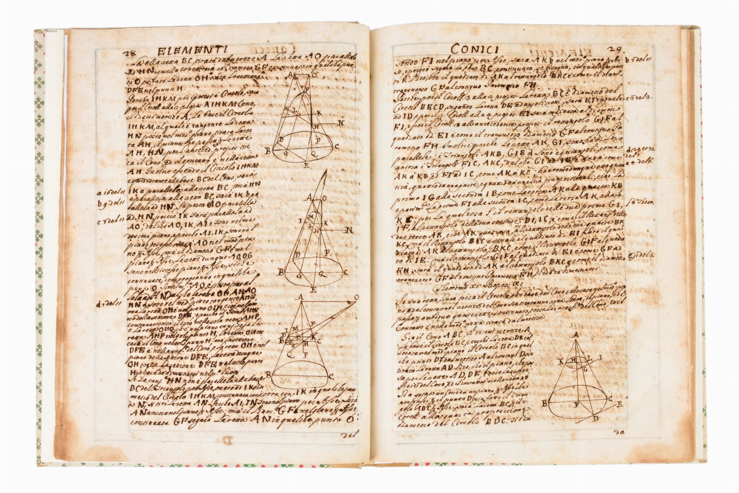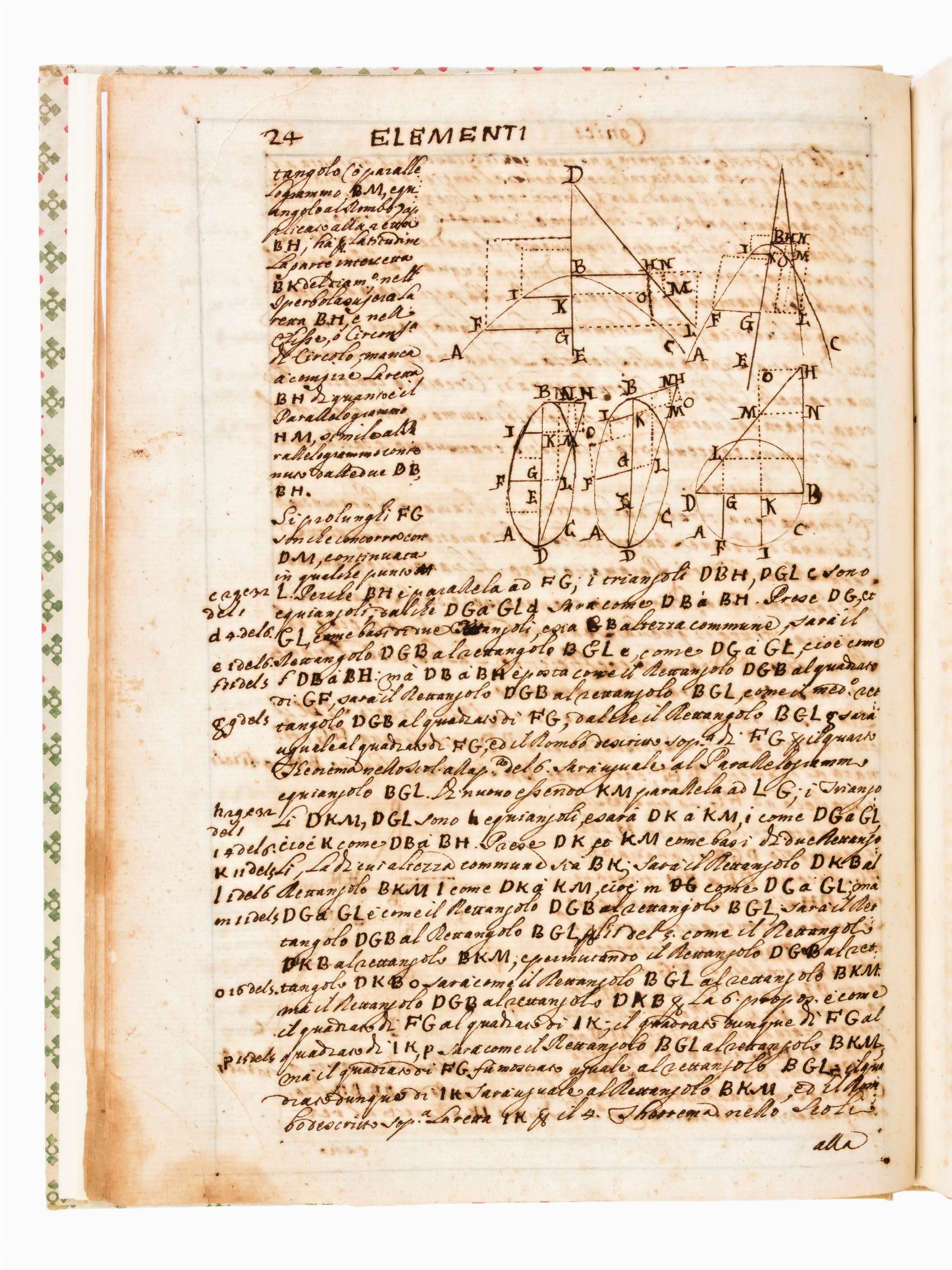 Elementi canonici overo il primo libro de catoptrici di Claudio Midorsi ristaurato da Vitale Giordano Bitontino. In Roma, Tip. Komarek 1685. Formato in-4°, pp. 96. (segn. A4-M4). Rilegatura post. muta in mezza pergamena con piatti rivestiti in carta decorata. Esemplare privo di Frontespizio, le pagine da 17 a 24 e da 27 a 30 risultano mancanti e reintegrate con copie di mano antica che riportano testo e alcuni disegni manoscritti a china, il testo termina a pag 96. che conclude la prima parte dell'opera che ne prevedeva una seconda. Buono stato di conservazione testo con rare e lievi fioriture. L'esemplare che qui si propone è analogo se non il medesimo rispetto alla descrizione del Riccardi (1828-1898) che nella sua 'Biblioteca di matematica italiana' (Ristampa, Milano 1952), alla voce Giordano Vitale descrive l'opera in questi termini 'l'esemplare da me posseduto manca di frontespizio... in folio... dalle quali (pagine) le 17-24 e 27-30... sono diligentemente copiate a mano con le rispettive figure...'. Come il presente esemplare che non ha frontespizio e le pagine sono manoscritte coeve (fine '600) corrisponde in ogni particolare (paginatura, testo, figure e disegni). Esemplare unico, conosciuto solo di nome e non certo per il contenuto, né dagli studi sulla storia della matematica né da quelli più specialistici su Vitale Giordano e sul Midorsi (Claude Midorge 1585-1647).