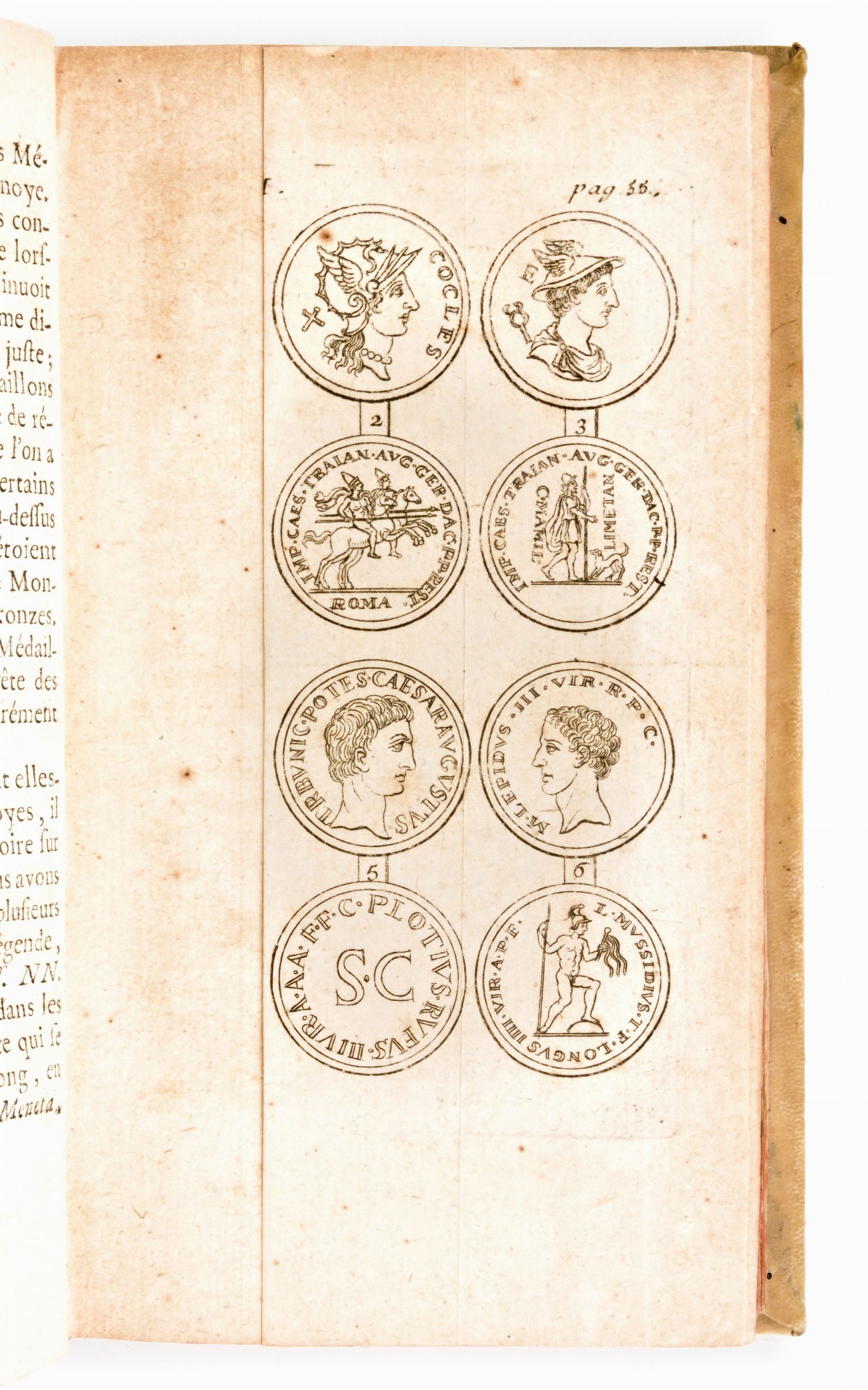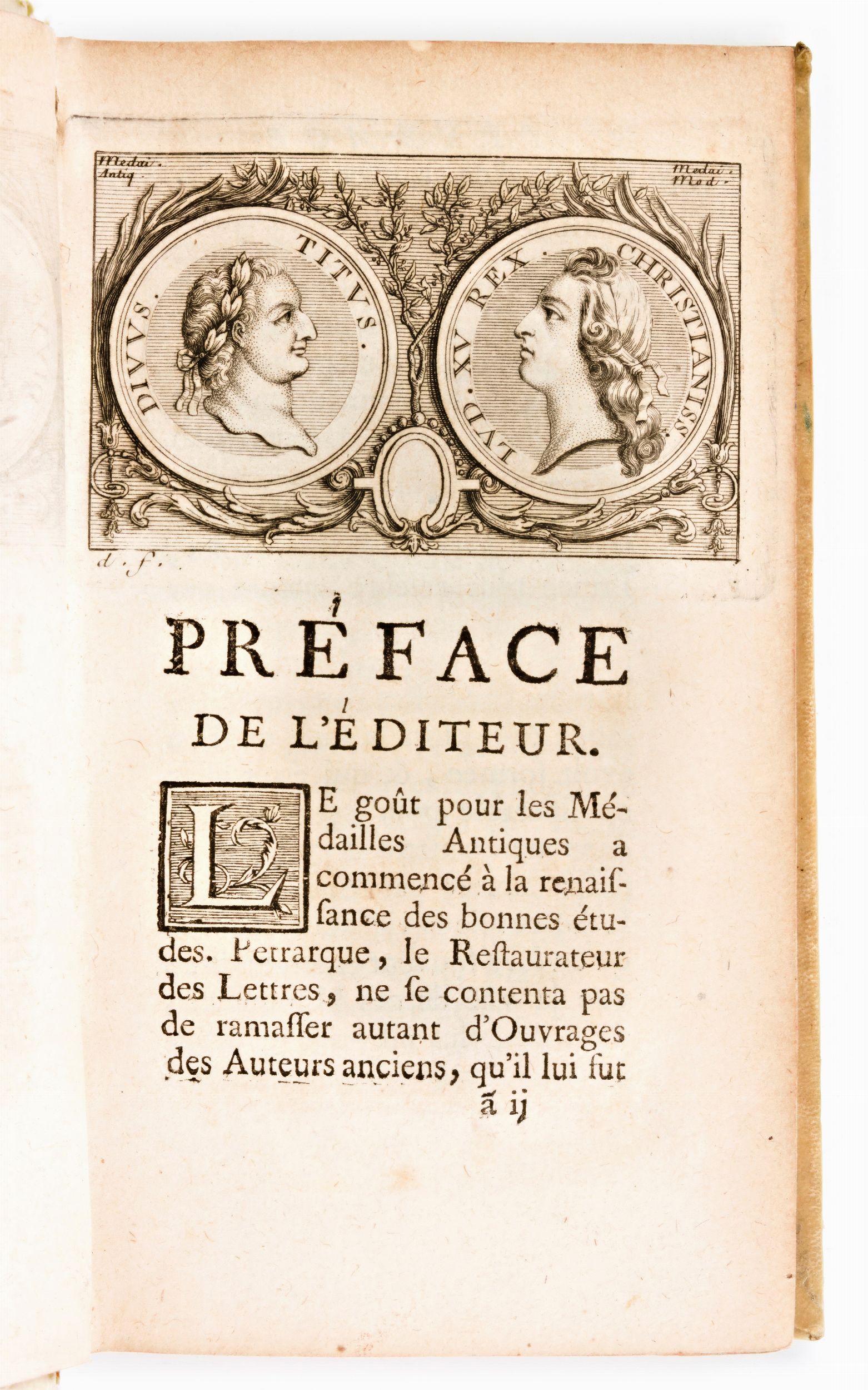 Formato in-12°, mm. 170x100, pp. xliv, (4), 464, (2), 11 cc. di tav. ripieg. / (4), 446, (34), 1 c. di tav. ripieg. Completo. Rilegatura coeva in piena pergamena con titoli e fregi in oro al dorso. Tagli delle carte a spruzzo. Difetti ai dorsi, lavori di tarlo anche alle cerniere interne con risguardo anteriore parz. distaccato al vol. 1. Leggera brunitura e sporadiche fioriture. Antica edizione parigina completa in 2 volumi. Impressa il 1744 per Jean Debure (1721-1786). Frontespizi stampati in rosso e nero. 1 antiporta calcografica al primo volume. Opera del numismatico francese Louis Jobert (1637-1719), con 12 tavole ripiegabili incise fuori testo raffiguranti medaglie con ritratti degli imperatori romani e dei rispettivi papi. Testatine, capilettera e finalini xilografici.