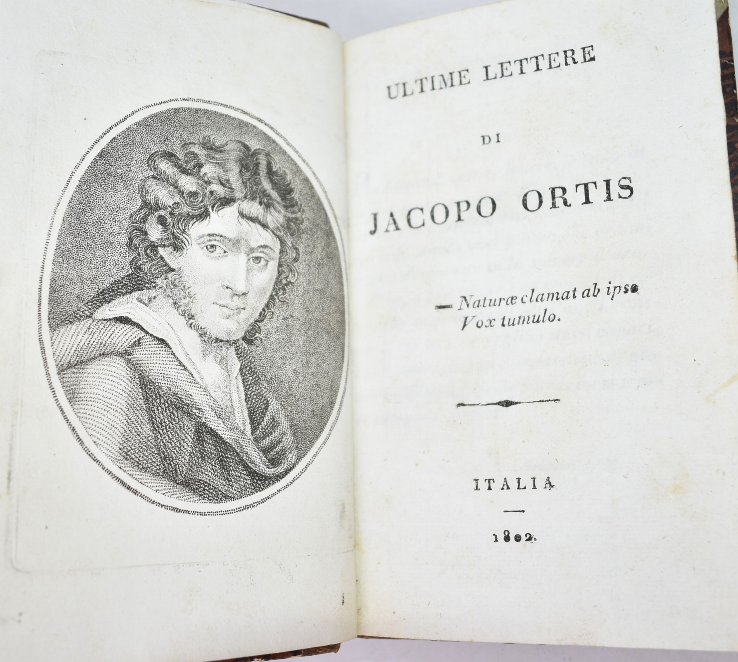 1 vol., in 8°, cm 17x11, p. 187, (3) + 1 carta di ritr. Rilegatura coeva in mezza pelle, dorso con titoli in oro. Una tra le diverse composizioni di quest'edizione datate 1802, tutte differenti per formato e numero di pagine; esemplare della variante di stampa con un ritratto di Jacopo Ortis in antiporta (non firmato), motto sul front. 'Naturae clamat ab ipso Vox tumulo'. Ottimo esemplare, parzialmente stampato su carta celestina; l'ultima carta è bianca.