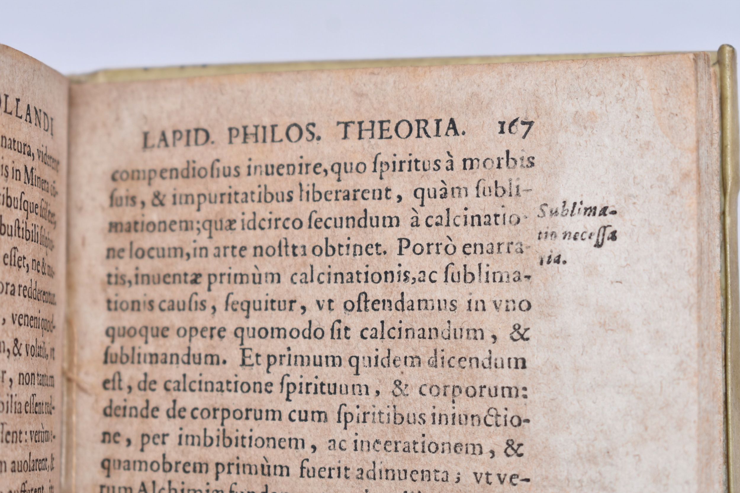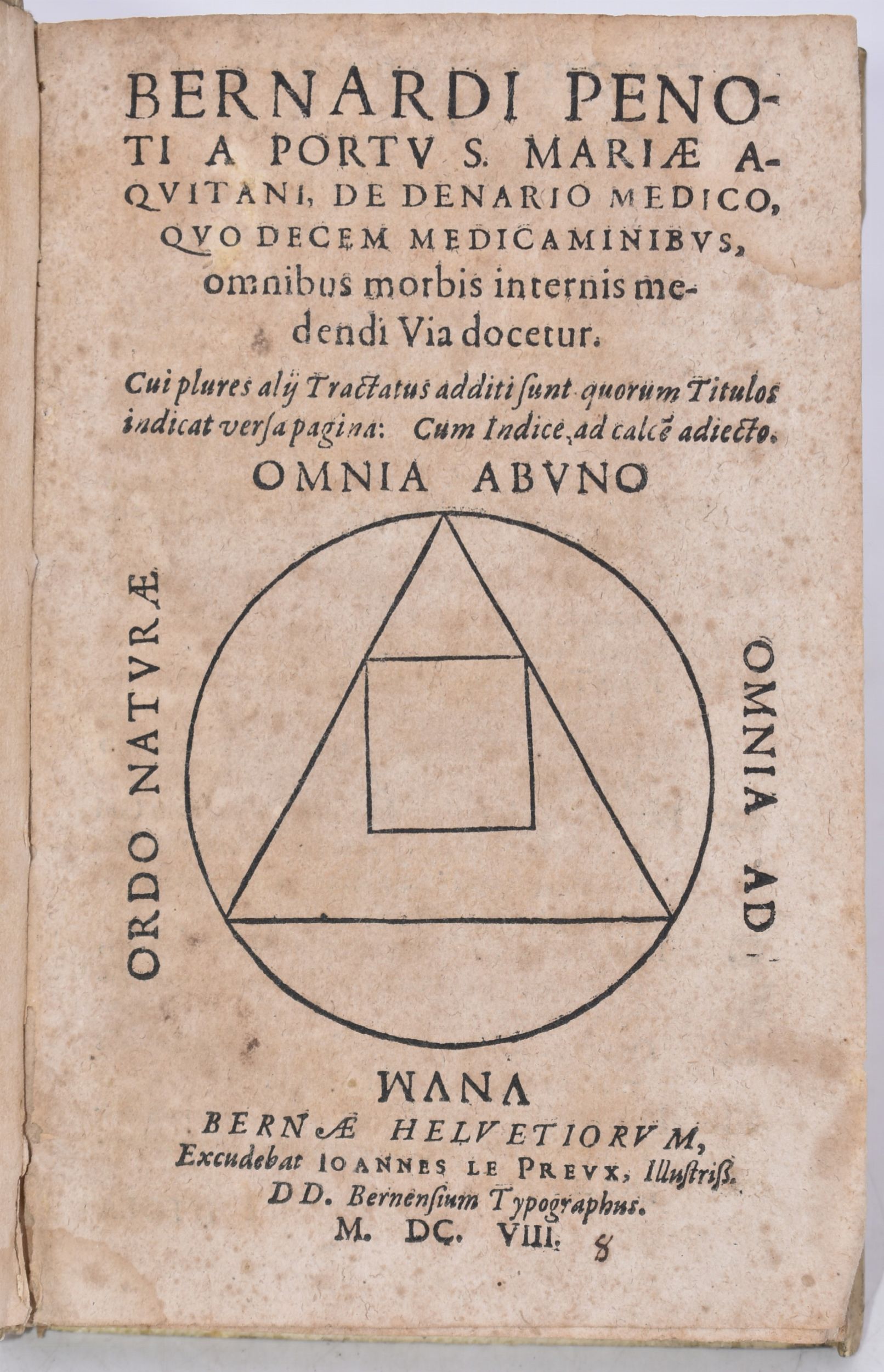 Opera dell'alchimista francese G. B. Penot (1519-1617), trattato di chimica, alchimia e medicina spesso omesso da bibliografie e cataloghi nonostante possa vantare ampie sezioni dedicate alla Pietra Filosofale. Rara edizione originale svizzera; stampata sul frontespizio una vignetta xil. (un cerchio con un triangolo e un quadrato all'interno, e motto: Ordo naturae omnia ab uno omnia ad unum); testatine e iniziali xil. incise nel testo. Esemplare brunito.