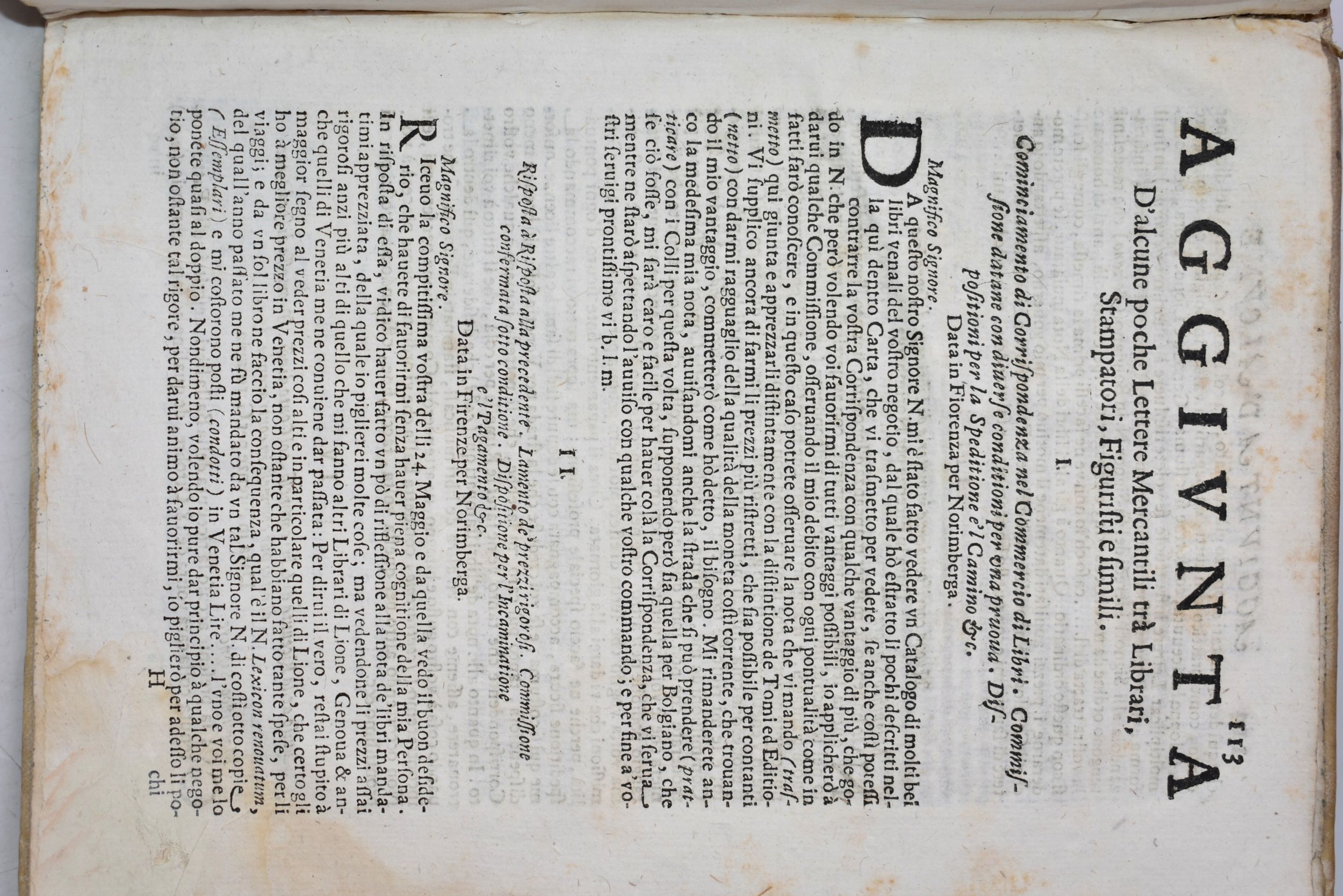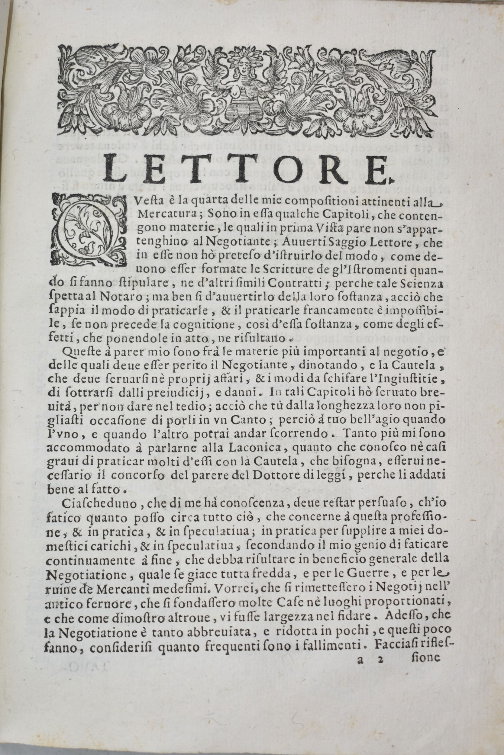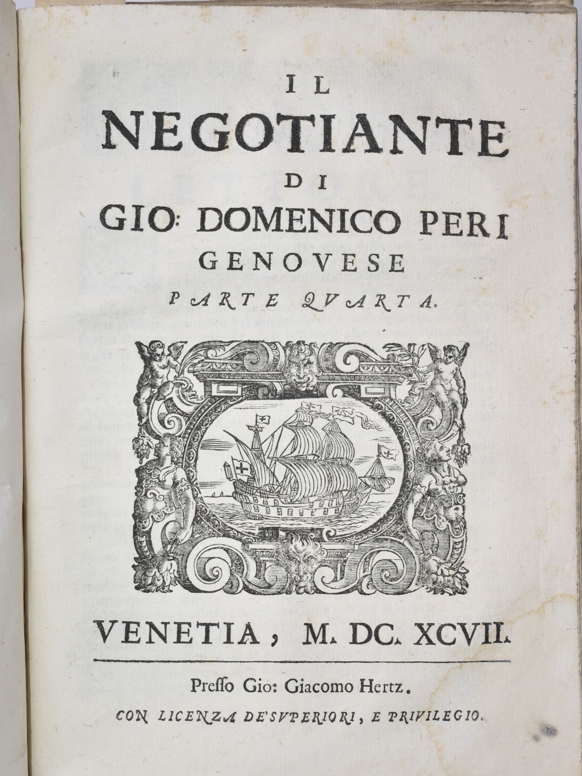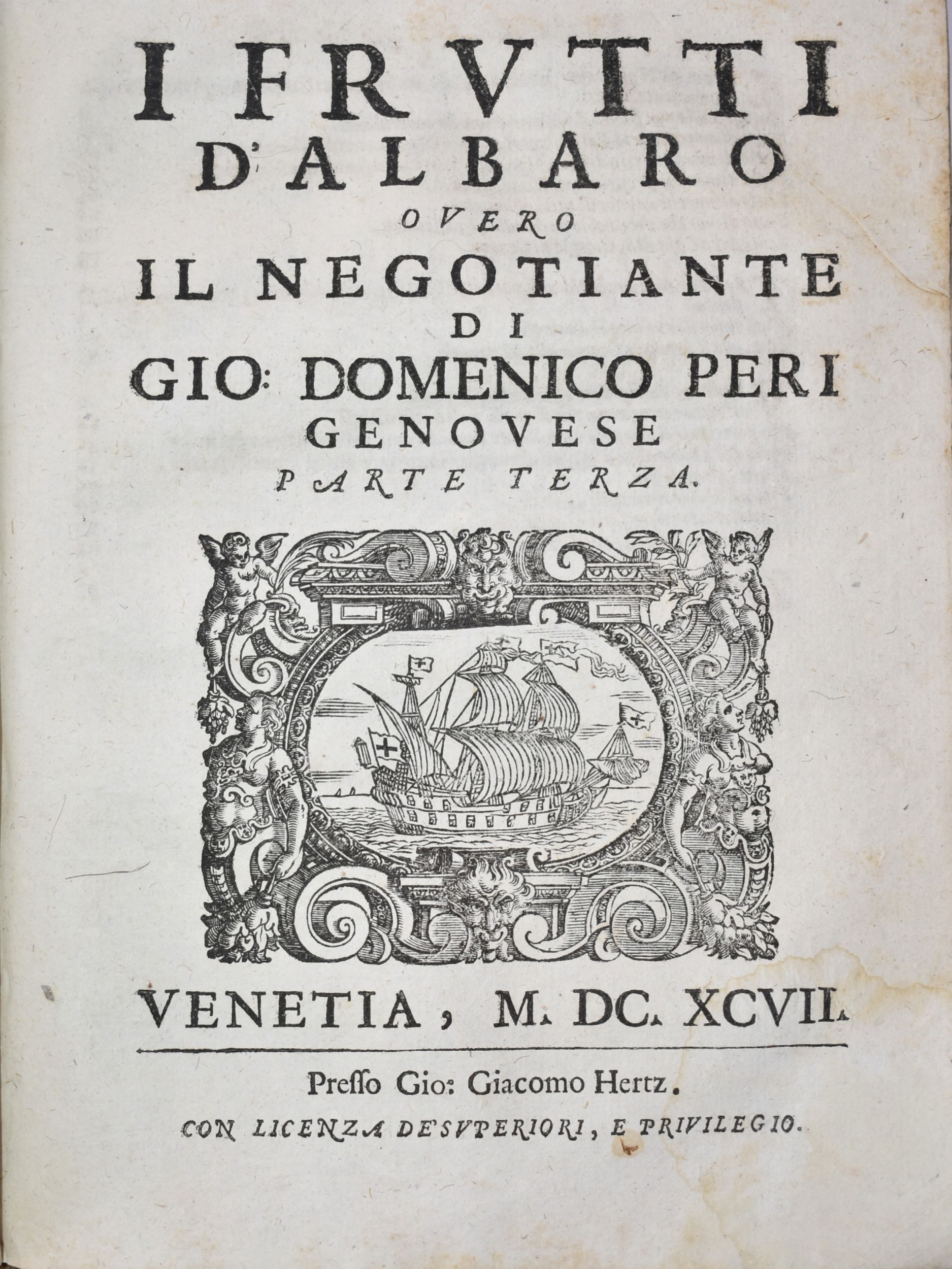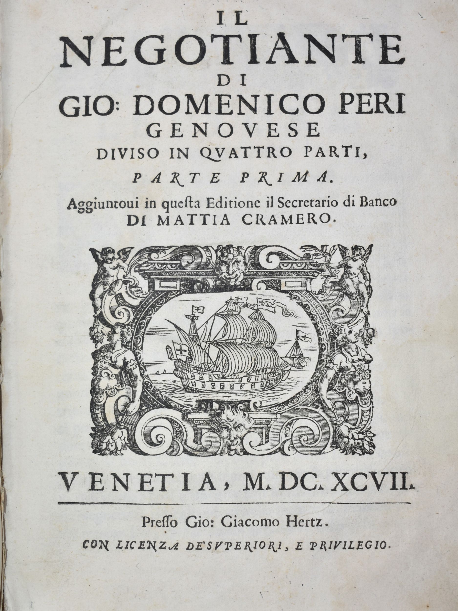 Il ricco e colto mercante genovese G.D. Peri scrisse questo trattato, “una delle opere più interessanti di tecnica bancaria†(Riccardi), basandolo sulla sua notevole esperienza personale. Le varie parti formano un repertorio completo di tecnica mercantile e bancaria, con interessanti informazioni ed utili consigli sulla contabilità , il diritto, la corrispondenza, le contrattazioni e altro. Cinque parti con front. propri rilegate in 1 volume, una grande marca tip. a ciascun front. (Veliero in mare a vele spiegate, in cornice figurata), raffinate iniziali con testatine e finalini xil. nel testo. Sul recto della seconda carta, sigillo in ceralacca con iniziali F. V. entro cruore tripartito sormontato da croce patriarcale. Esemplare fresco con lievi fioriture su poche carte, cerniere interne un po' lente.