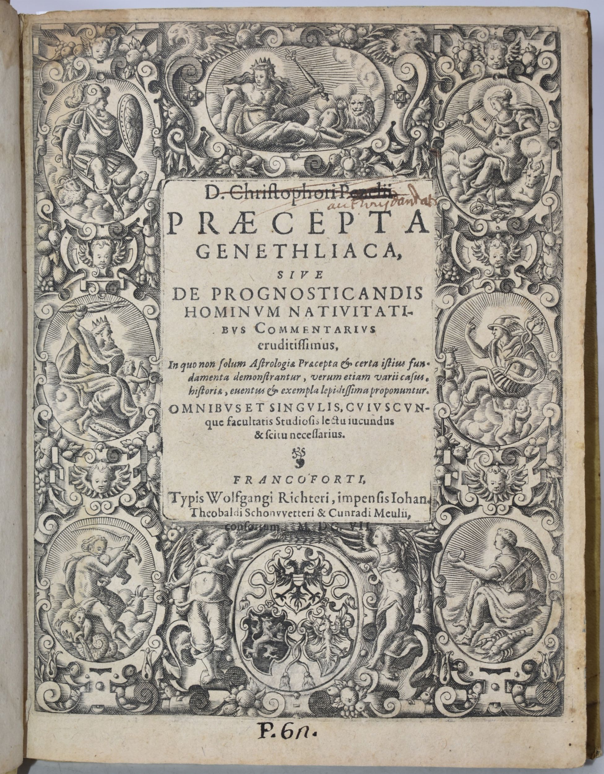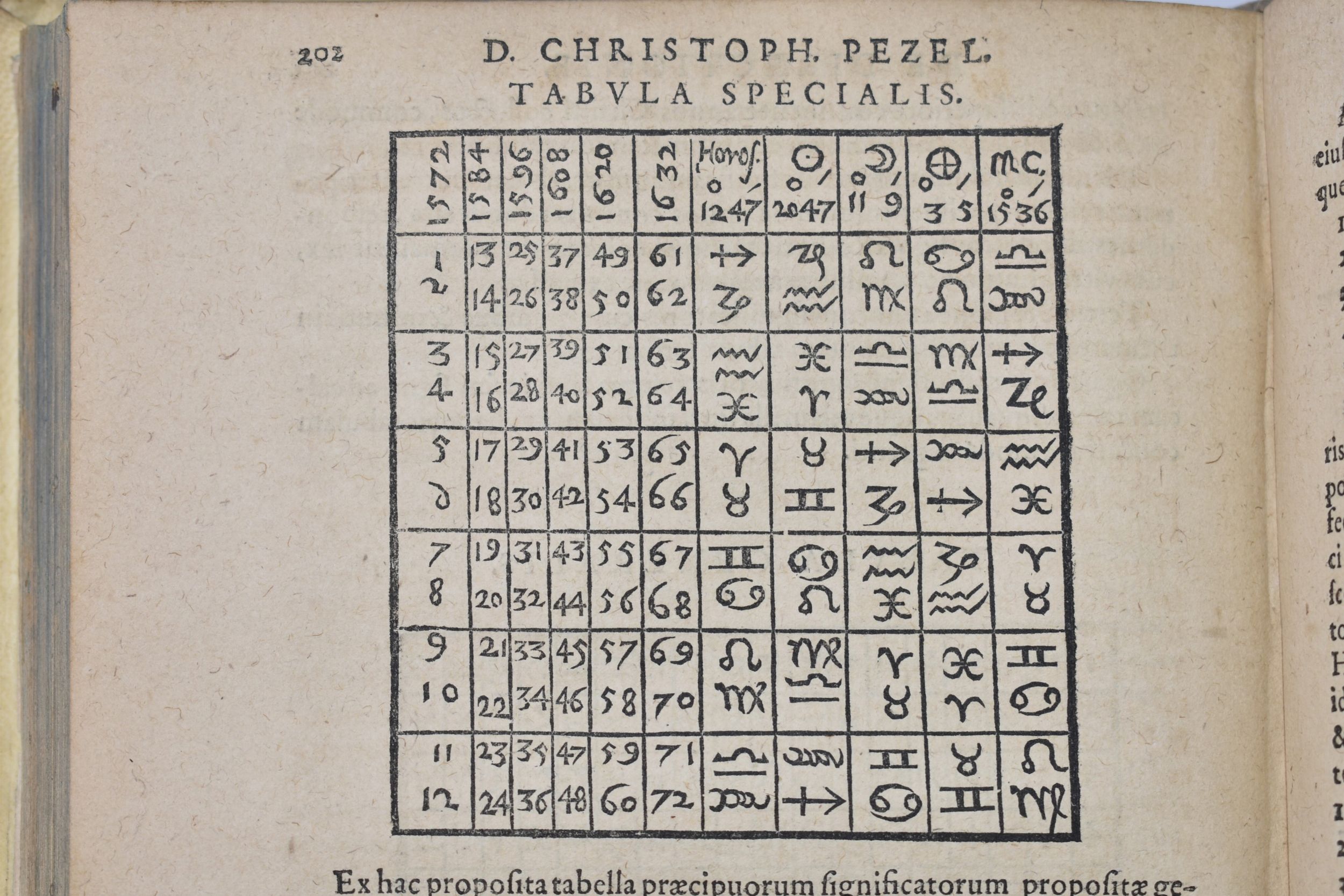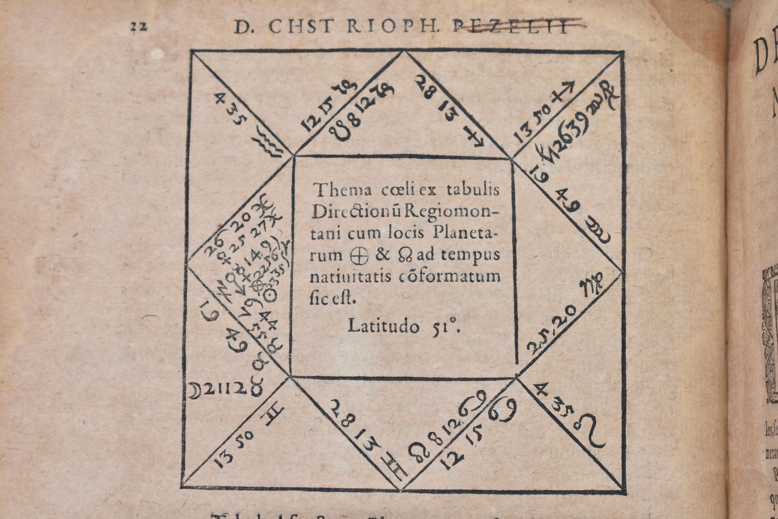 Trattato astrologico figurato, inizio XVII secolo. Edizione originale di quest'opera poco nota, ma molto ricercata, del teologo germanico C. Pezel (1539-1604) pubblicata postuma. Con frontespizio calc. e incisioni nel testo raffiguranti alcuni diagrammi zodiacali necessari a calcolare gli influssi celesti sulla predestinazione delle vite umane, aspetto che rivela le origini degli studi del Pezel, da lui sviluppati intorno alle teorie di Melantone.