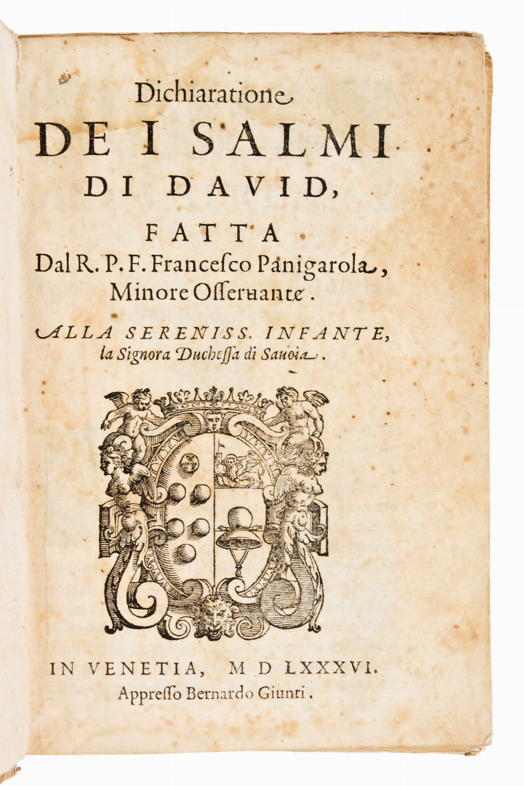 Dichiaratione de i salmi di Dauid, fatta dal R.P.F. Francesco Panigarola, alla Serenissima Infante, la Signora Duchessa di Savoia. In Venezia il 1587 per Bernardo Giunti. Opera del vescovo Francesco Panigarola (1548-1594). Stemma inciso al frontespizio, testatine e capilettera nel testo. Presente 1 tavola incisa fuori testo raffigurante re Davide in preghiera. Formato in-8°, pp. (8), 501, (3). Rilegatura coeva in piena pergamena antica con titoli manoscritti al dorso. Presente strappo all'angolo basso con piccola perdita di testo alla carta Aa1 (Salmi 369-370). Piccole mancanze ai piatti. Sporadiche fioriture e bruniture.