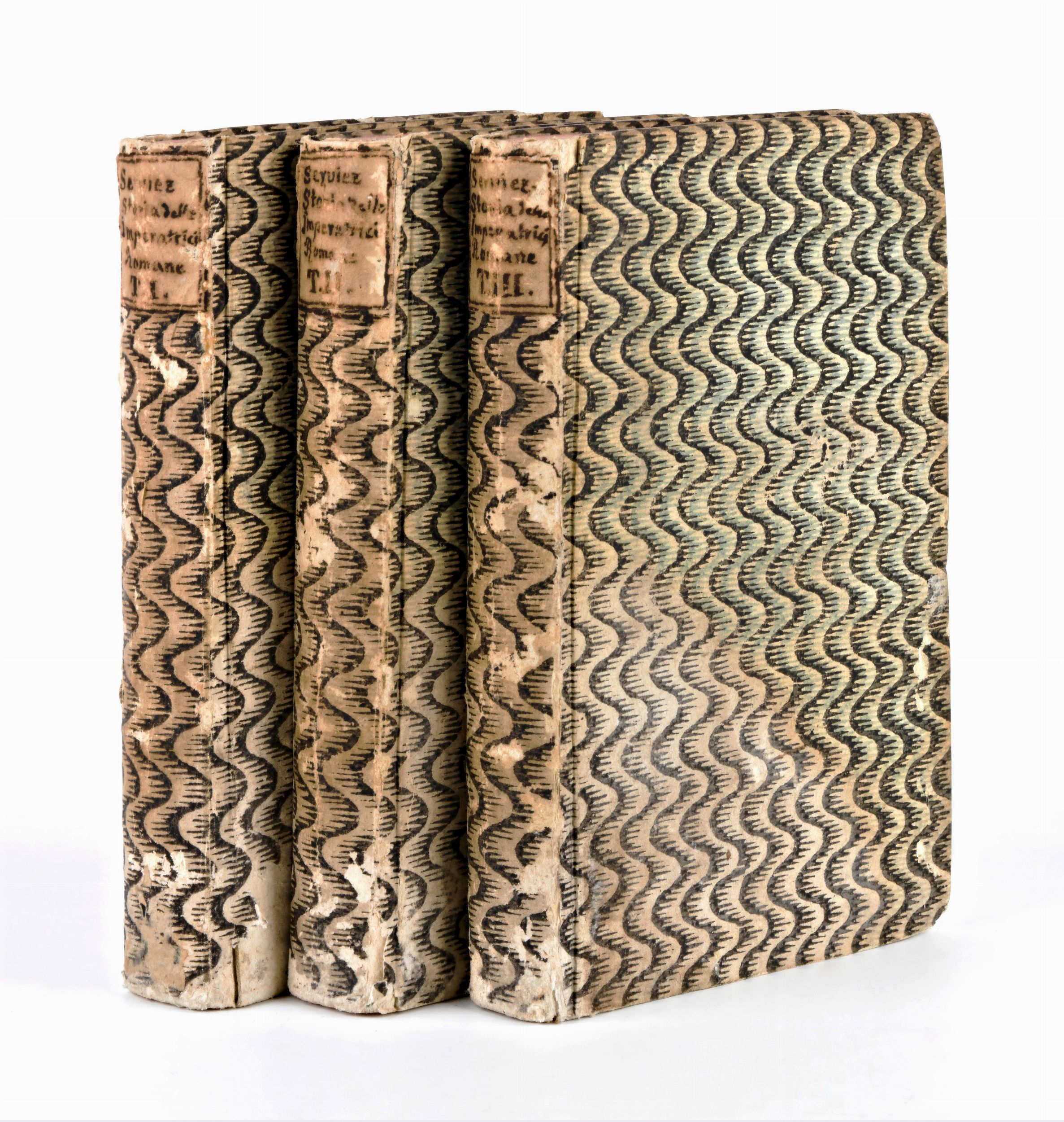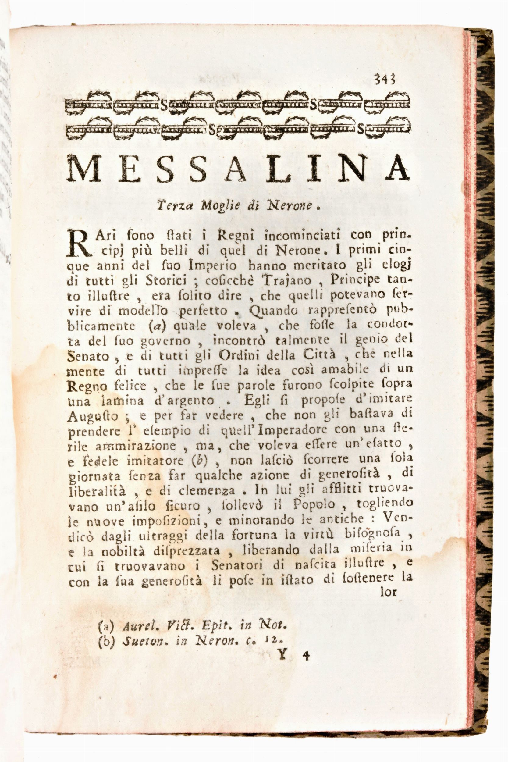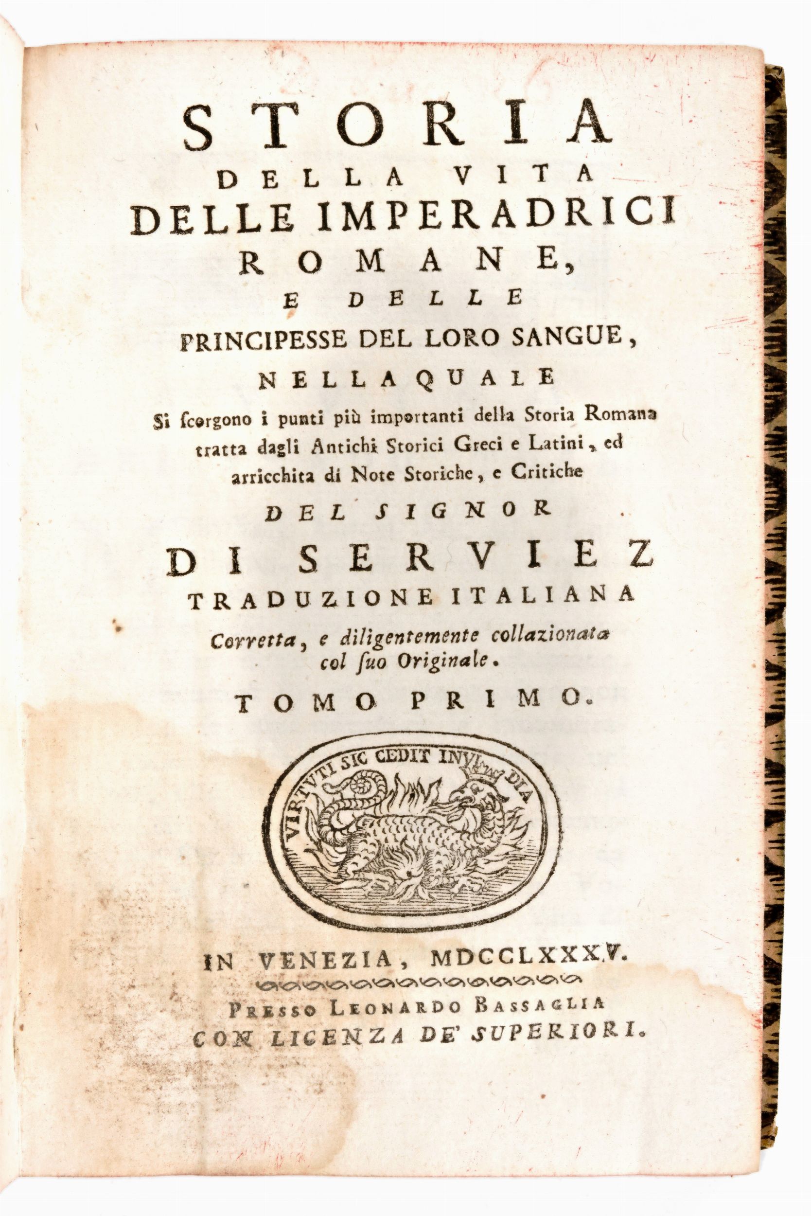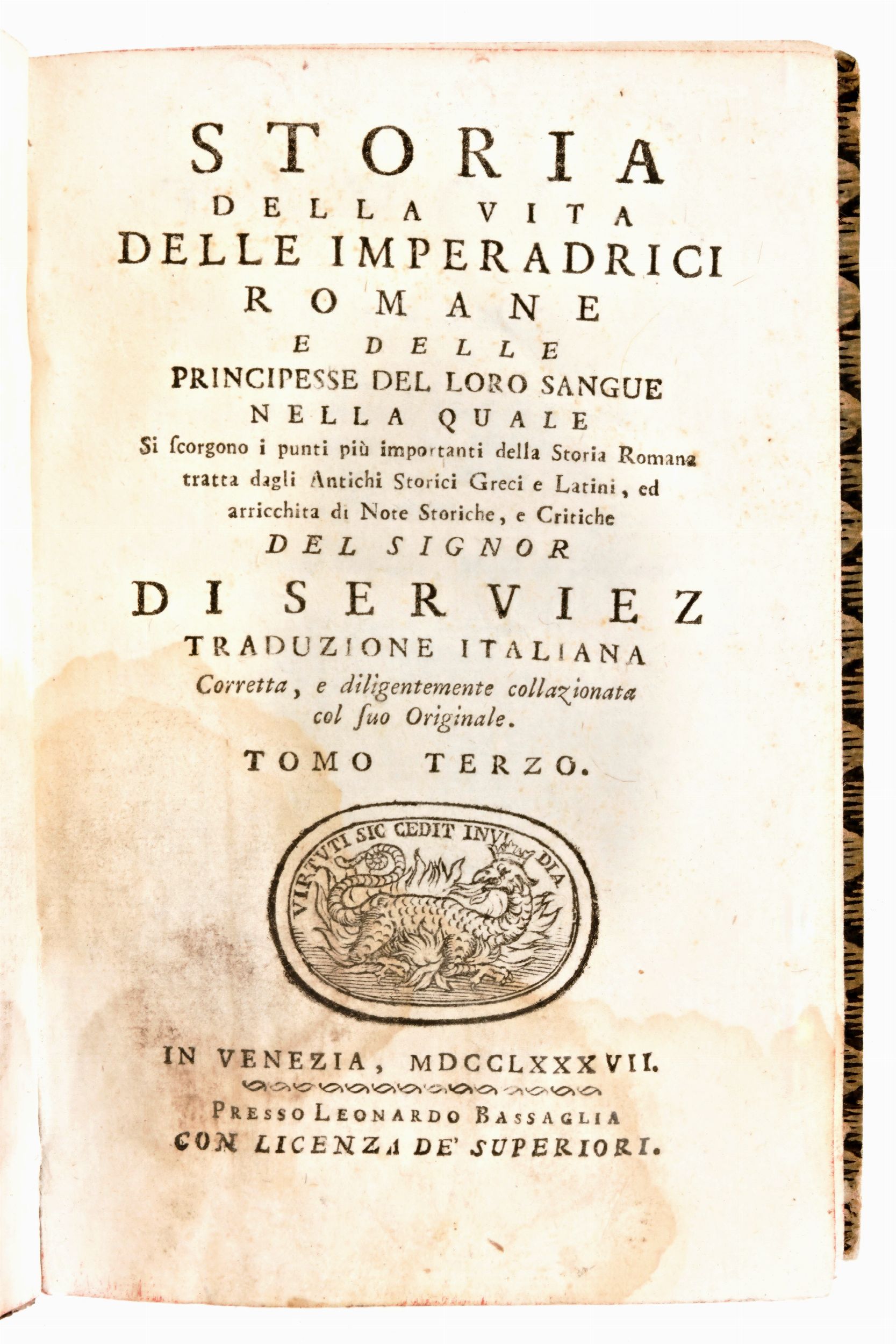 3 volumi. Formato in-8°, mm. 175x120, pp. (8), 358, (2) / (4), 348 / (4), 306. Terzo volume con l'ultima carta T12 mancante. Rilegatura coeva in piena carta antica decorata. Titoli manoscritti su tassello al dorso. Tagli delle carte in rosso. Leggera gora alla metà inferiore del testo dei volumi. Antica edizione impressa in Venezia tra il 1785 e il 1787 per Leonardo Bassaglia, completa in 3 volumi. Opera dello scrittore francese Jacques Roergas de Serviez (1679-1727), tradotta dal francese in italiano. Frontespizi con marca tipografica (Salamandra coronata tra le fiamme; motto: Virtuti sic cedit invidia). Testatine, capilettera e finalini xilografici. L'importanza dell'opera consiste nella sua novità : il libro può considerarsi uno dei primi esempi di 'storia di donne illustri'. A partire da testi in cui vengono citate come figure secondarie, de Serviez compone un mosaico in cui le figure femminili assurgono a personaggi determinanti nelle scelte politiche dei mariti.