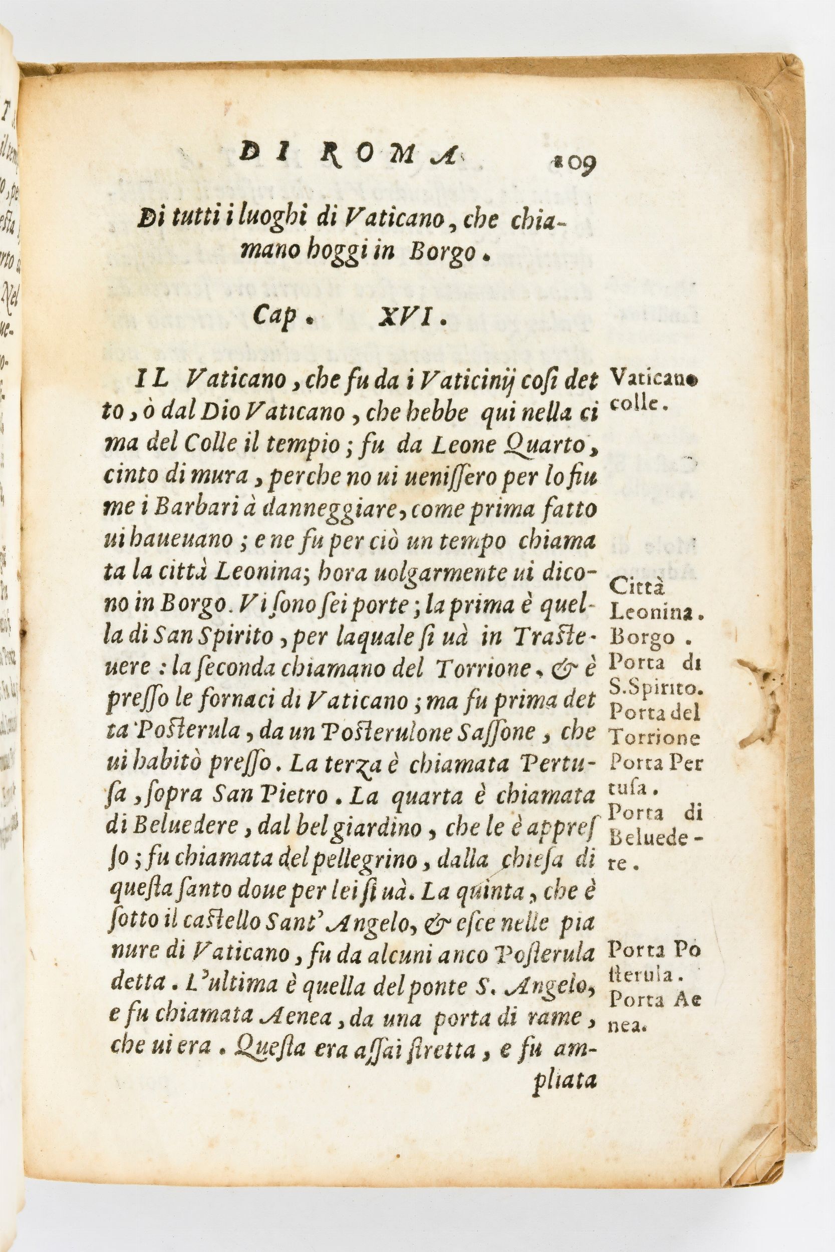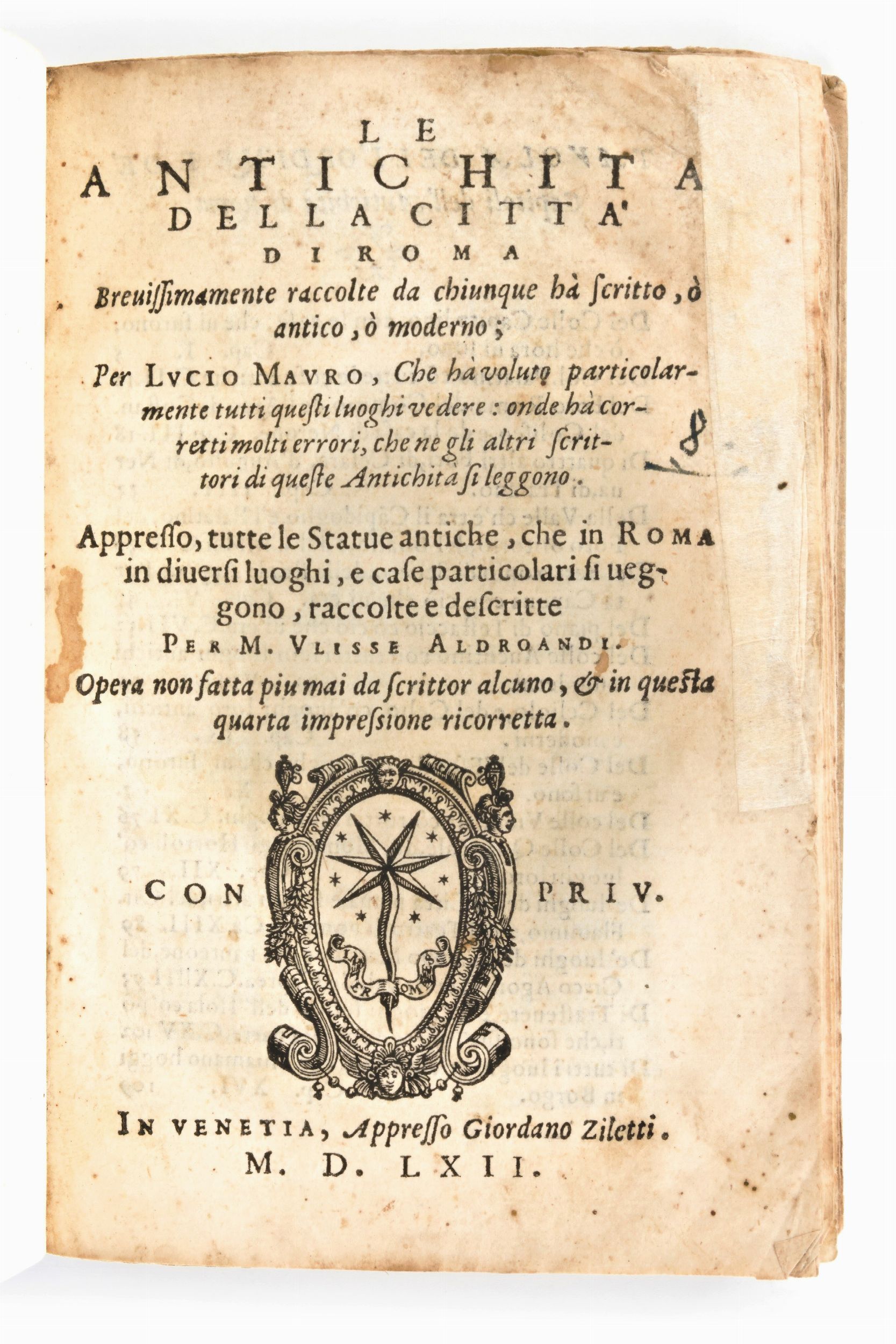 Formato in-8°, mm. 150x105, pp. (24), 315, (5). Copertina rigida post. (XX sec.), dorso con titolo sbiadito. Marca tipogr. in xilografia al front. (Stella cometa con sette stelle tra le punte. Intorno alla coda nastro con motto. In cornice figurata) a ripetersi nell'ultima carta. Capilettere in xilogr. n.t. Restauro al margine delle prime 9 carte e alle ultime 3. Lieve macchia di gora dalla carta A1 alla c. A8. Macchie di gora al dorso. Piccoli lavori di tarlo marginali, senza perdita di testo. Al risguardo anteriore applicata una etichetta di Rappaport. Titolo manoscritto al taglio inferiore (sbiadito). Cinquecentina impressa in Venezia per Giordano Ziletti il 1562. Guida dei monumenti di Roma dello storico Lucio Mauro (XVI sec.), servendosi di autori antichi e moderni. Dalla p. 115 (c. H2) inizia la guida delle statue antiche che si trovano in Roma, opera dell'enciclopedista Ulisse Aldrovandi (c. 1555-1605). Titolo : Le antichità della città di Roma breuissimamente raccolte da chiunque hà scritto, ò antico, ò moderno; per Lucio Mauro, che hà voluto particolarmente tutti questi luoghi vedere: onde hà corretti molti errori, che ne gli altri scrittori di queste antichità si leggono. Appresso, Tutte le statue antiche, che in Roma in diuersi luoghi, e case particolari si ueggono, raccolte e descritte per M. Vlisse Aldroandi. Opera non fatta piu mai da scrittor alcuno, & in questa quarta impressione ricorretta. In Venetia : appresso Giordano Ziletti, 1562. Colophon : In Venetia : appresso Giordano Ziletti, alla lib. della stella, 1562.